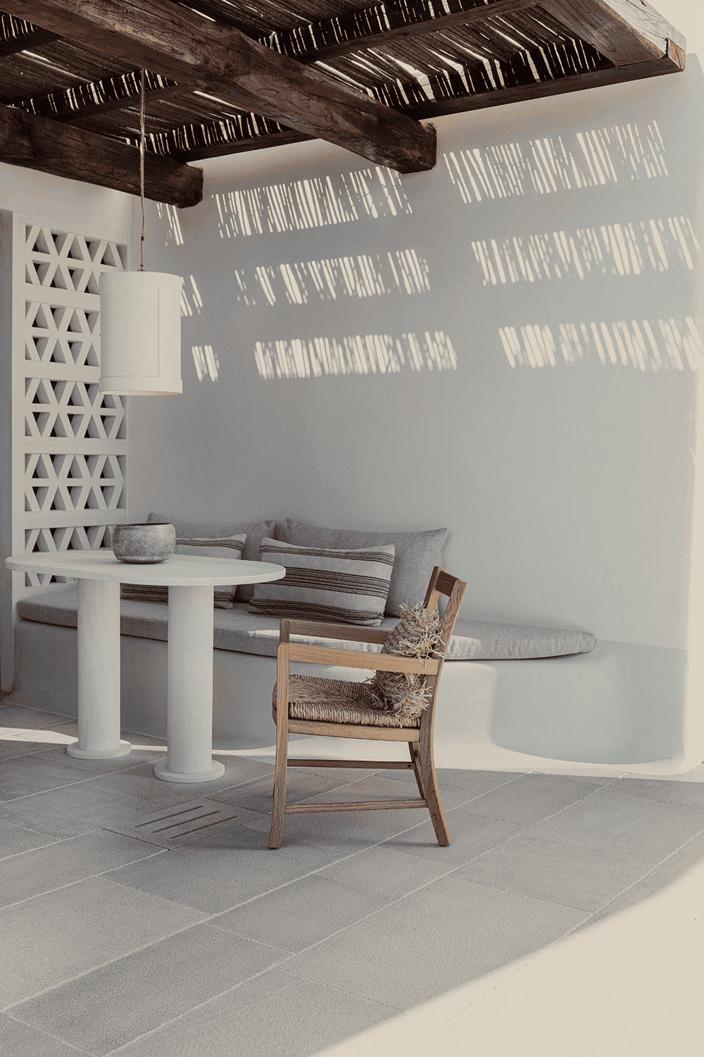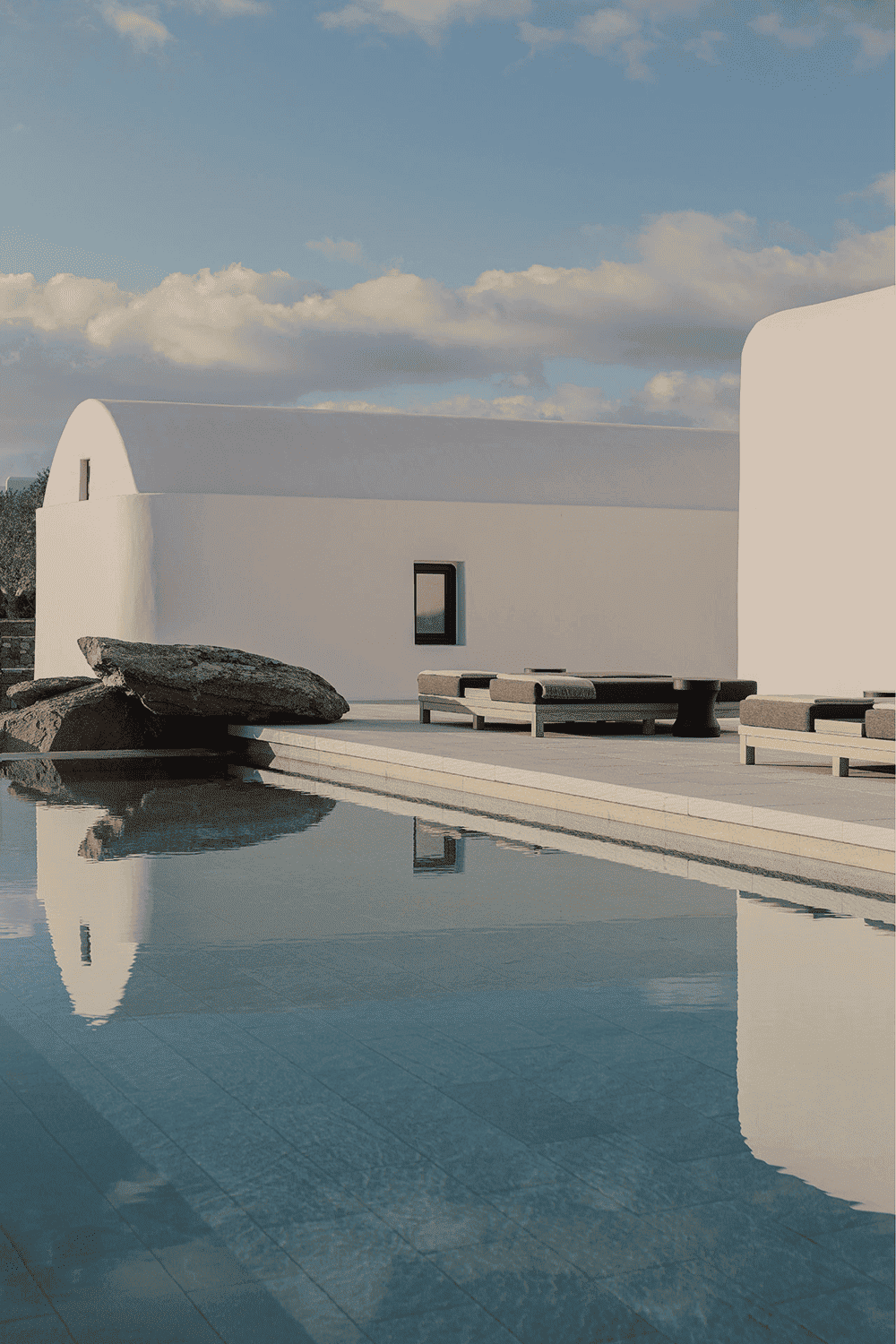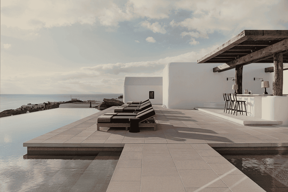 The design team drew inspiration from the island's indigenous culture, not only in architectural styles such as stuccoed building volumes and wooden pergolas, but also in its humble sophistication, sculptural and communal dimension: the hotel unfolds around a central plaza in a series of interlocking building volumes - in other words, it takes the form of a typical Cycladic village.