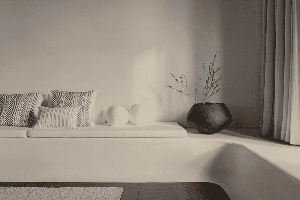 The artistic fusion of local vernacular culture and modern elements characterises the exterior of the hotel, a feature that can also be experienced in the interior. Based on the sculptural geometry of a typical Cycladic house, the interior echoes the rugged Mykonos landscape through clean lines, rustic finishes and spatial colours of natural materials and earthy tones.