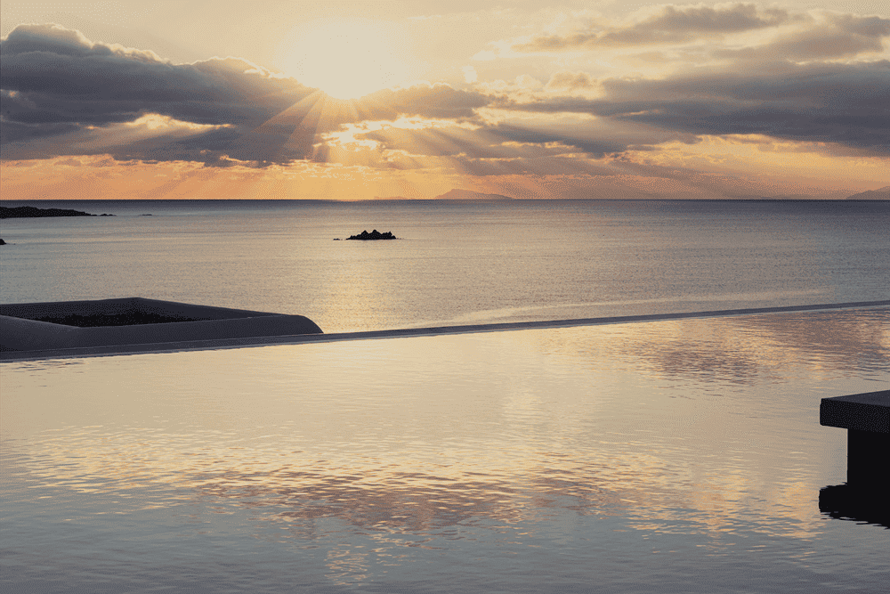 Built on a ridge, the hotel is uniquely situated to enjoy both the sunrise to the east and the sunset over Delos Island to the west.