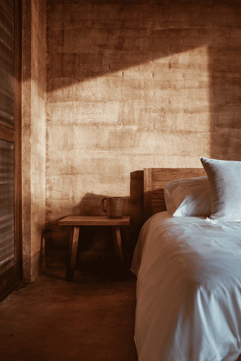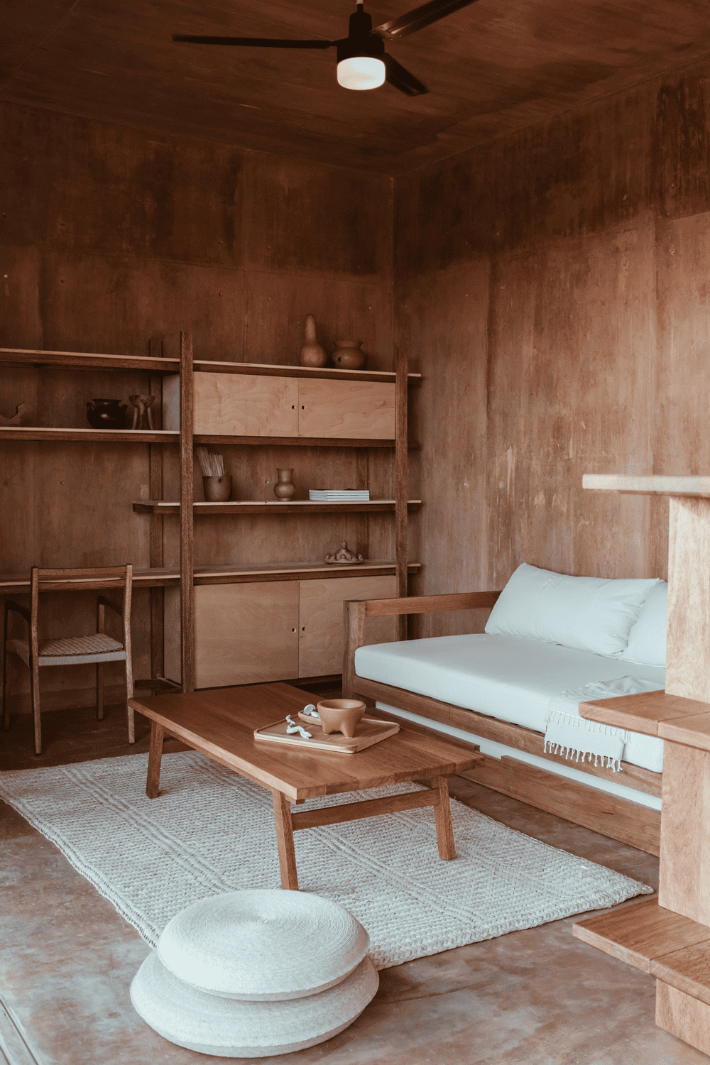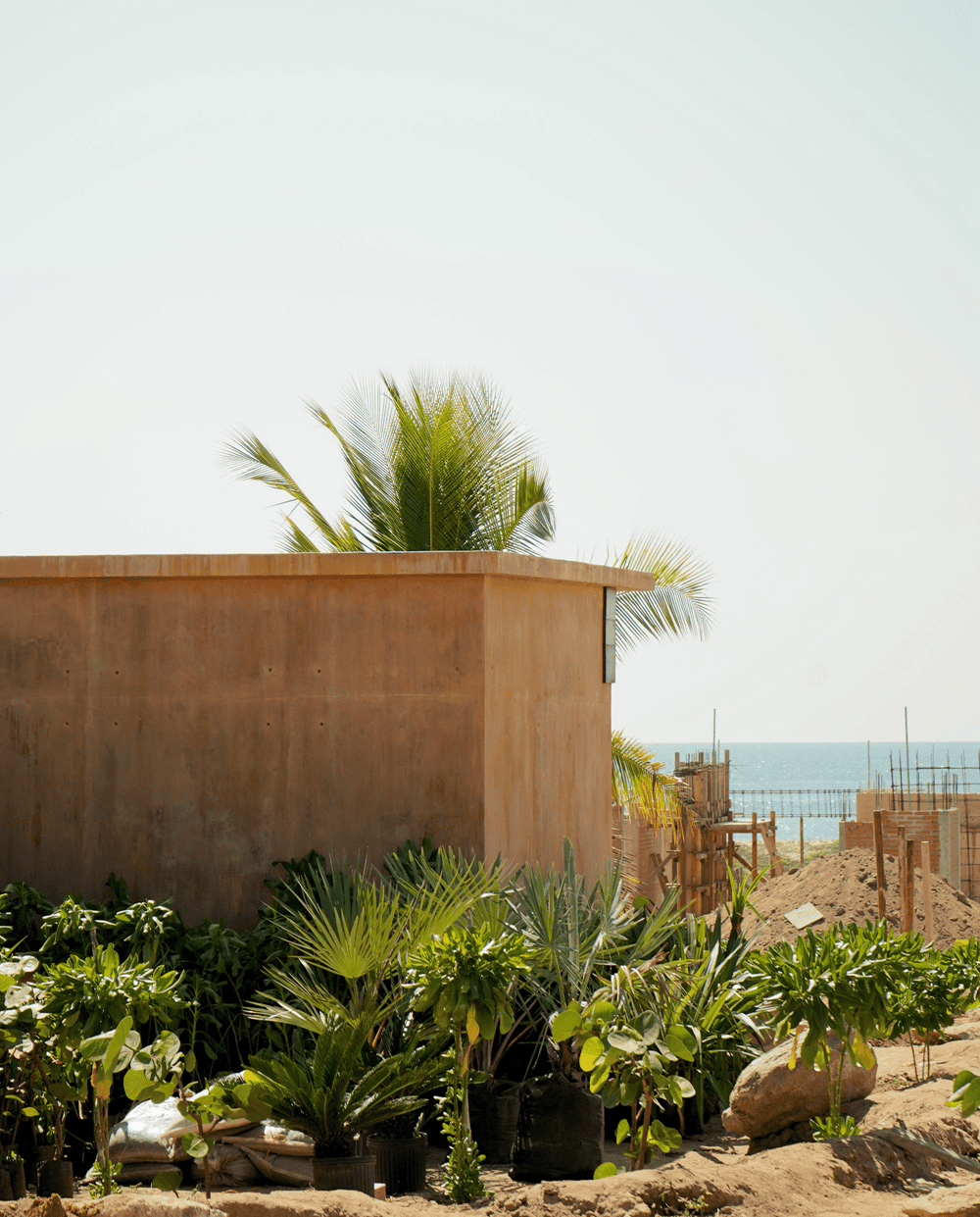 同时,它还必须能够抵御当地常见的气候、暴风雨和飓风,并能够利用该地区农村社区任何居民的工艺和常识快速建成。在设计别墅、选择建筑材料和饰面时,该地点给了我们很大的启发。该别墅必须是一种极其廉价、简单的建筑,因此我们选择了钢筋混凝土承重墙与当地沙土色调的混合材料。另一堵墙是用砖砌成的,上面覆盖着工地的沙子。两面墙都使用了同一种颜色,但使用了不同的材料,呈现出不同的质感,有的更纯净,有的更粗糙。