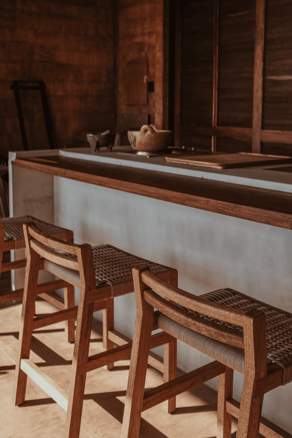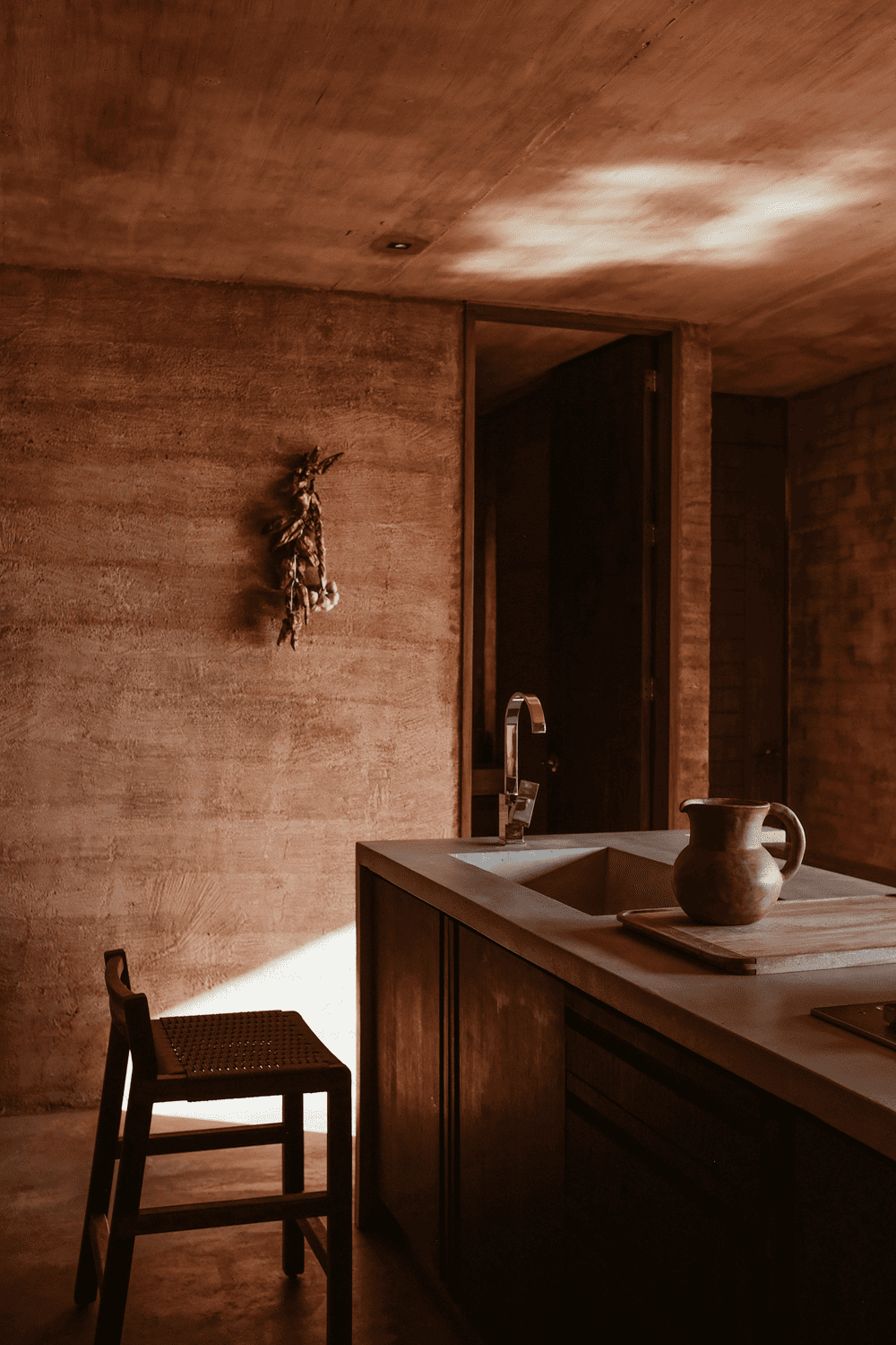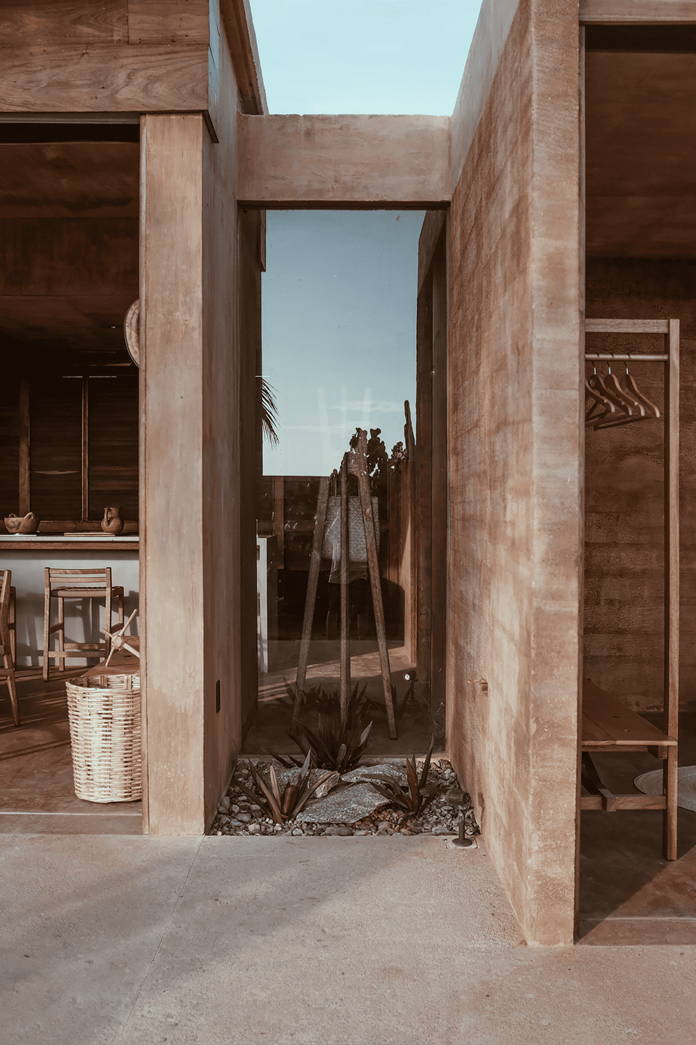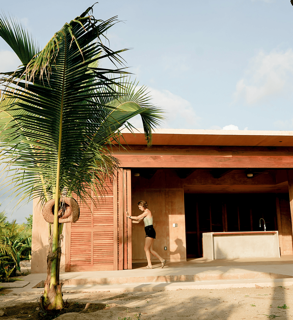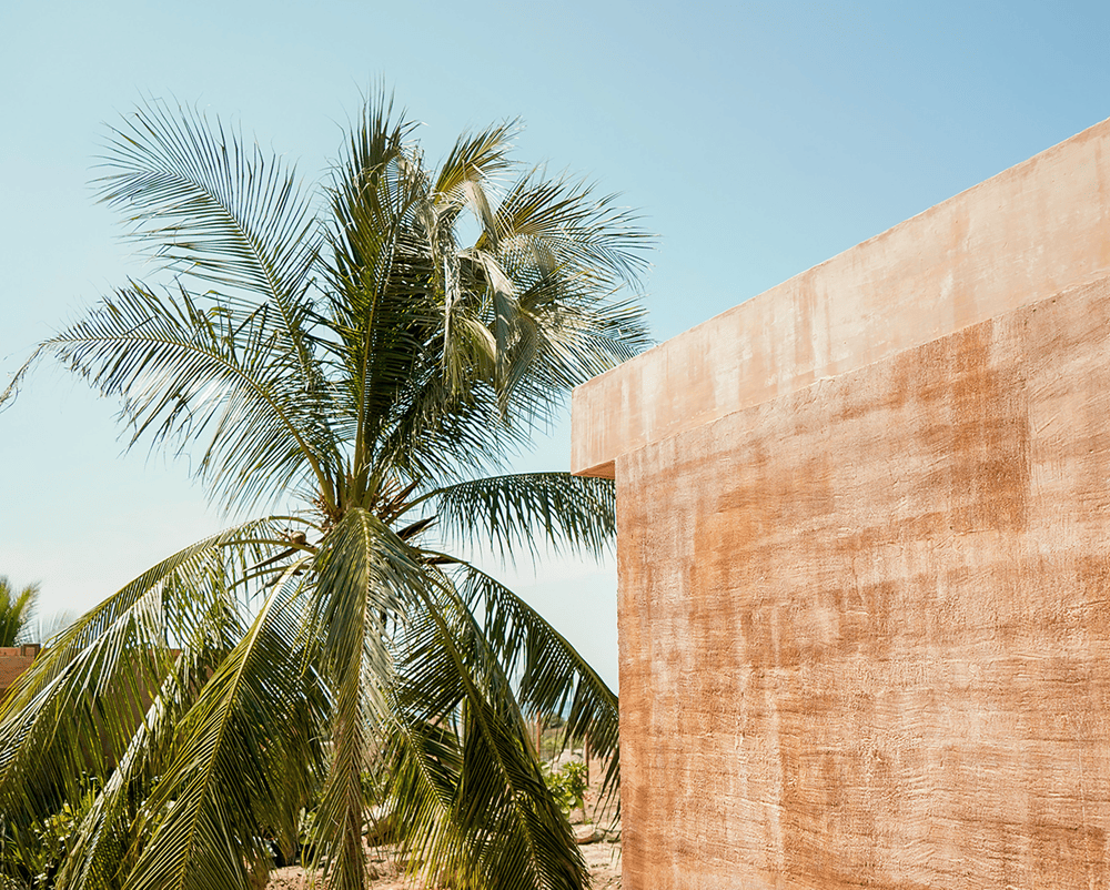 At the same time, it had to be extremely resistant to the climate, the storms, and hurricanes that are common in the area and to be able to be quickly built with processes and common knowledge of any inhabitant of the rural community in the area. The site was of great inspiration for the design of the villa and the selection of materials and finishes for its construction. The villa had to be an extremely cheap, simple-to-build construction, so we chose to make a mixture of load-bearing walls of reinforced concrete mixed with a colorant of the tone of the sand of the site. The other walls were built of bricks and were covered with sand from the site. Both walls were finished with the same type of color but with different materials, offering different textures, some purer and others rougher.
