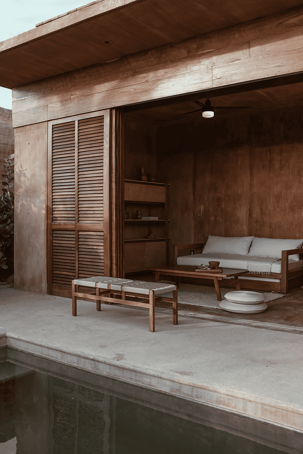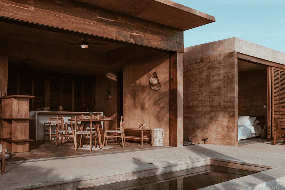 The architectural program includes a clubhouse with a pool, terrace, restaurant, bar, and beach club, as well as lush green areas distributed throughout the land with natural pathways and an operational and administrative area. Each villa is designed so that the interior and exterior space feels like one, a space that provides an area of shade, rest, and washrooms, allowing a unique experience of connecting with nature. The luxury of the project is the outdoor area and the beauty of the site. Following this approach, the villas have a basic program of one bedroom, a full bathroom, a living room, a kitchen and a terrace, and a private pool outside. The pool is located in the front with the aim of cooling the wind when it passes over it towards the interior of the villa.