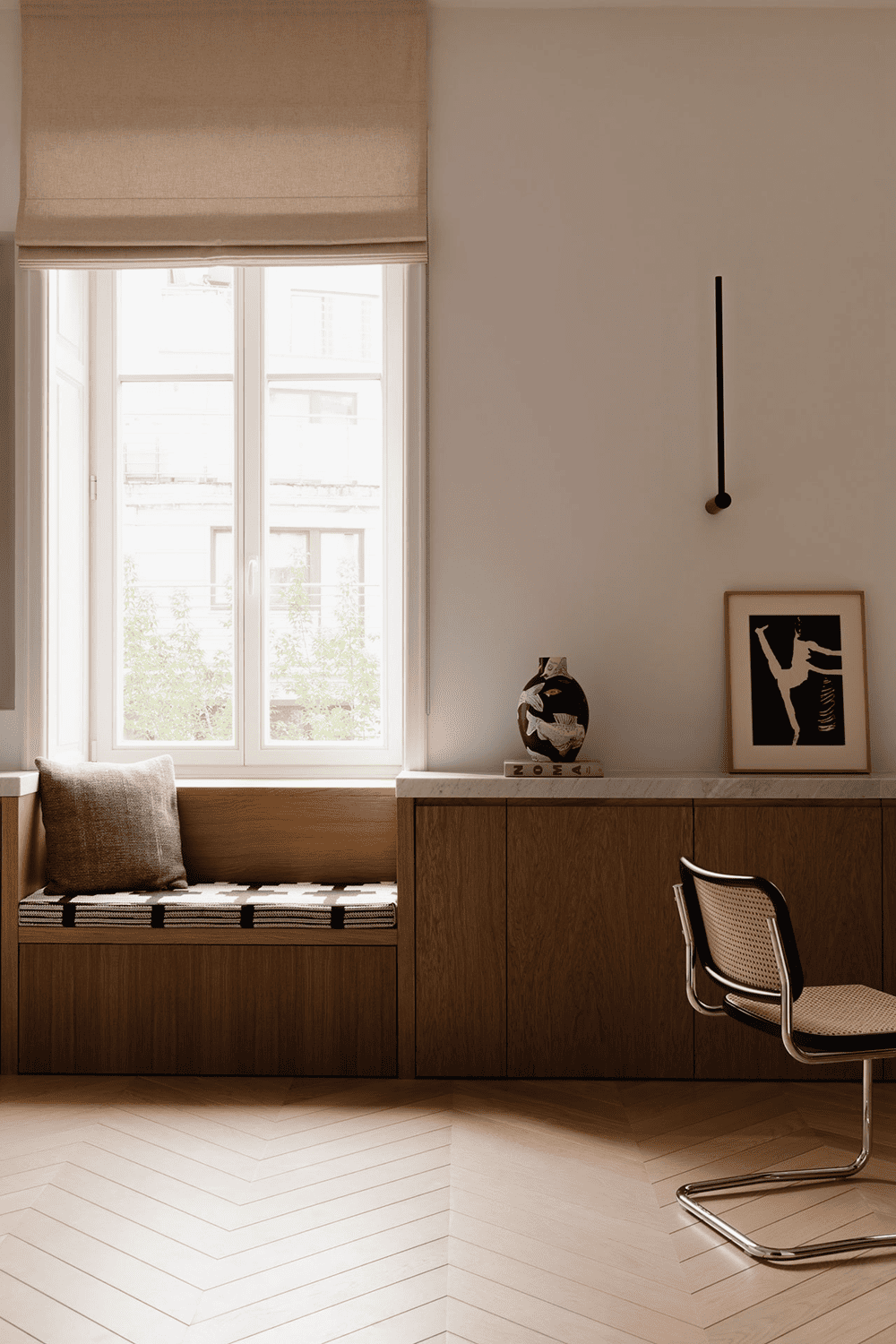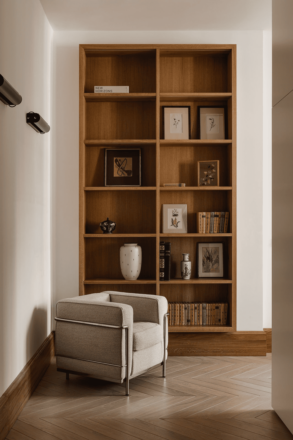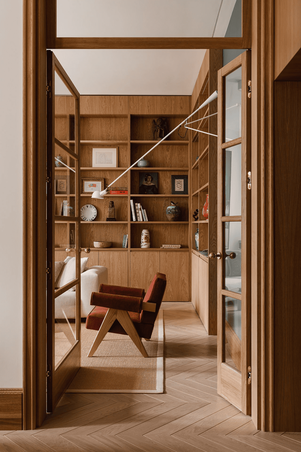 Whitewashed walls, herringbone parquet flooring and built-in minimalist oak bookcases and cupboards add a sense of nostalgic elegance to both spaces, which is further accentuated by carefully selected mid-century modern furniture.