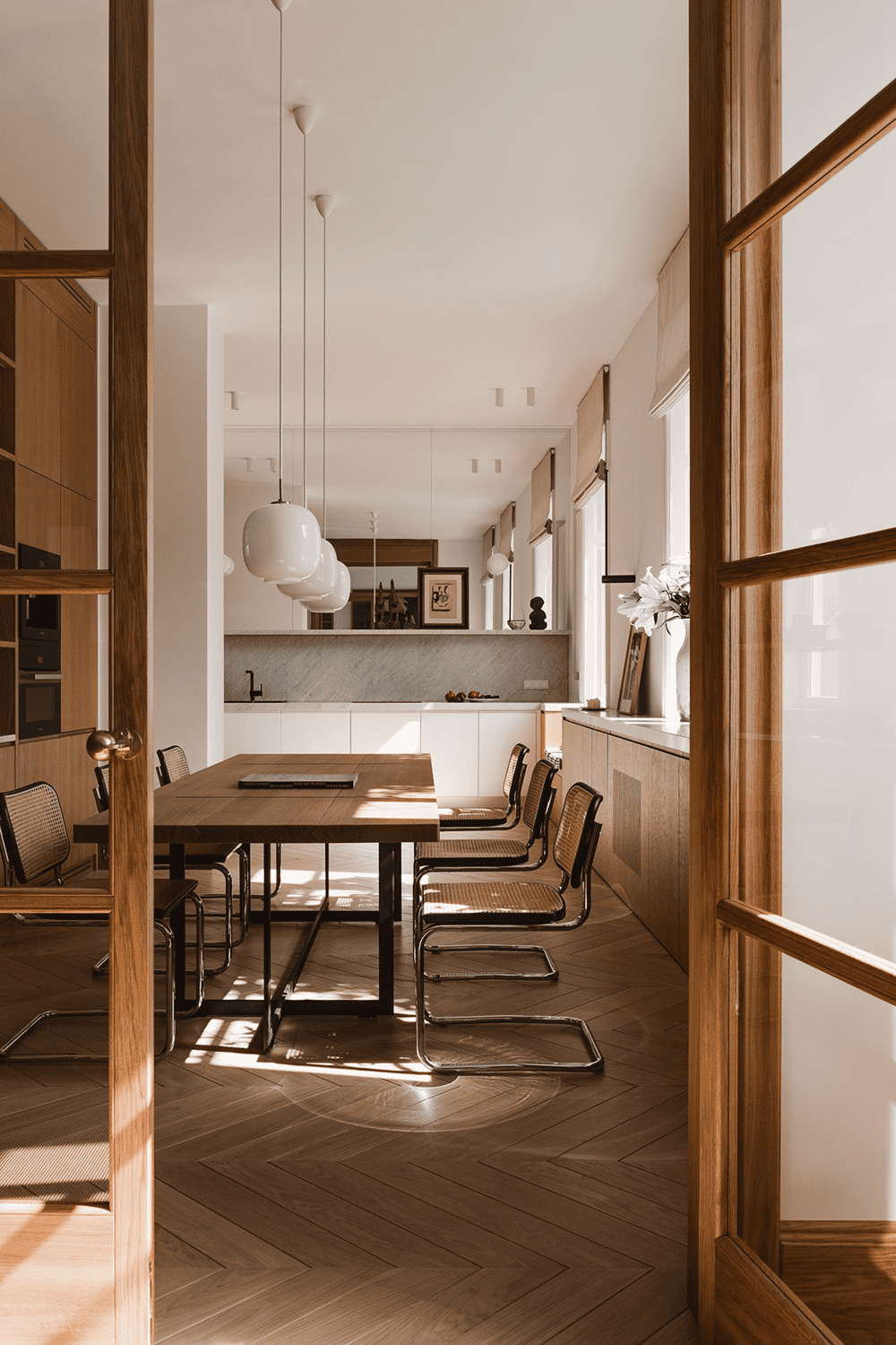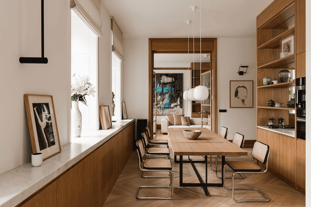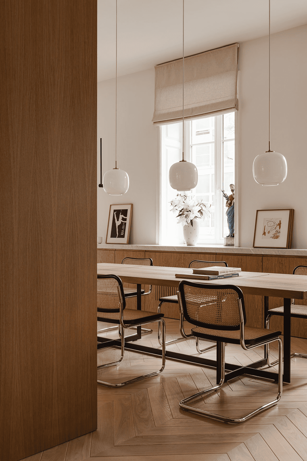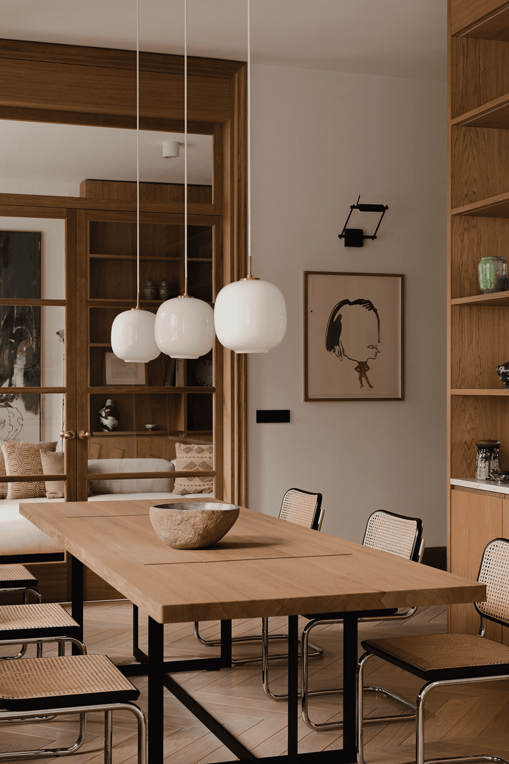 在餐厅里,一张钢制底座的大橡木桌与Marcel Breuer标志性的黑檀木框架Cesca椅子和Louis Poulsen的三件人工吹制玻璃VL45吊灯相辅相成,吊灯最初由丹麦建筑师Vilhelm Lauritzen在20世纪40年代设计。