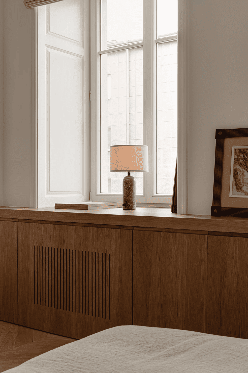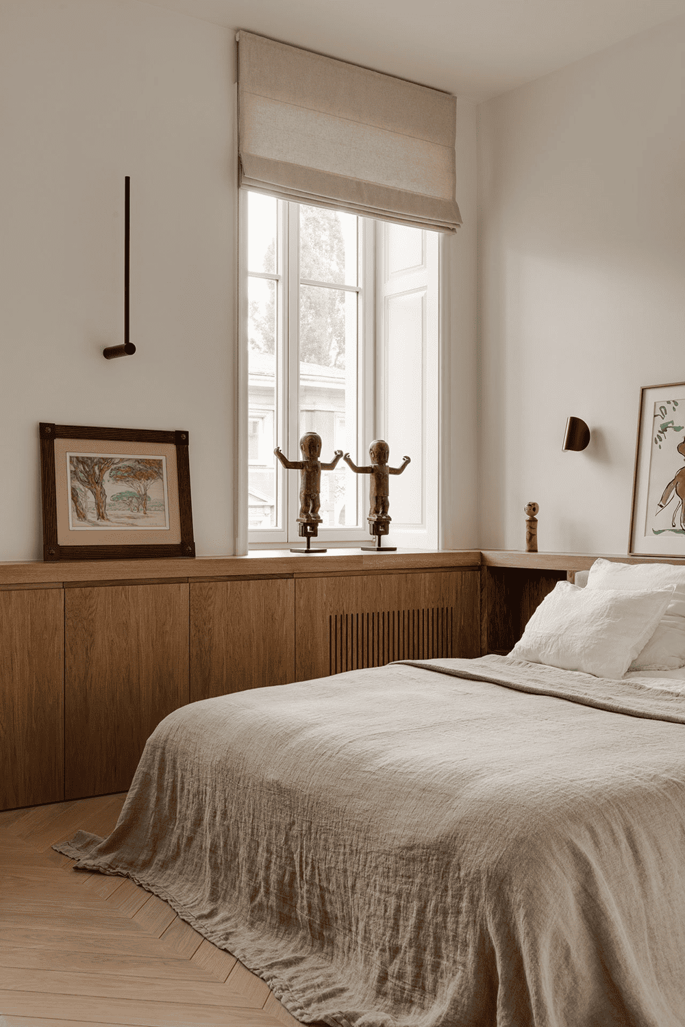 卧室里也可以看到定制的橡木家具,这些橡木家具与棉质和天然亚麻织物的柔软氛围感相平衡,而Teresa Pągowska、Józef Pankiewicz和Matthieu Cosse等人的大量艺术作品则为这个原本极简主义设计的房间增添了俏皮的气息。