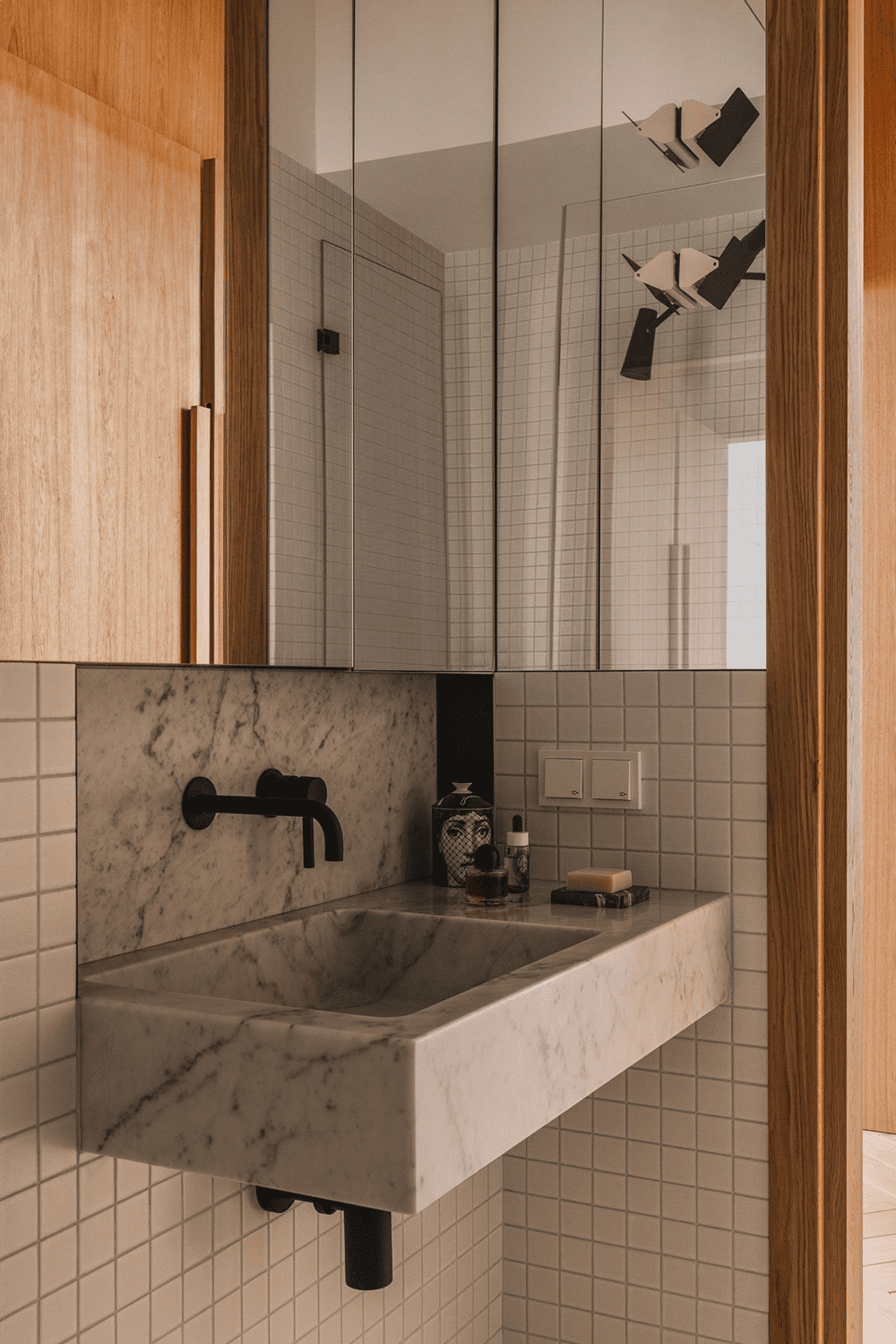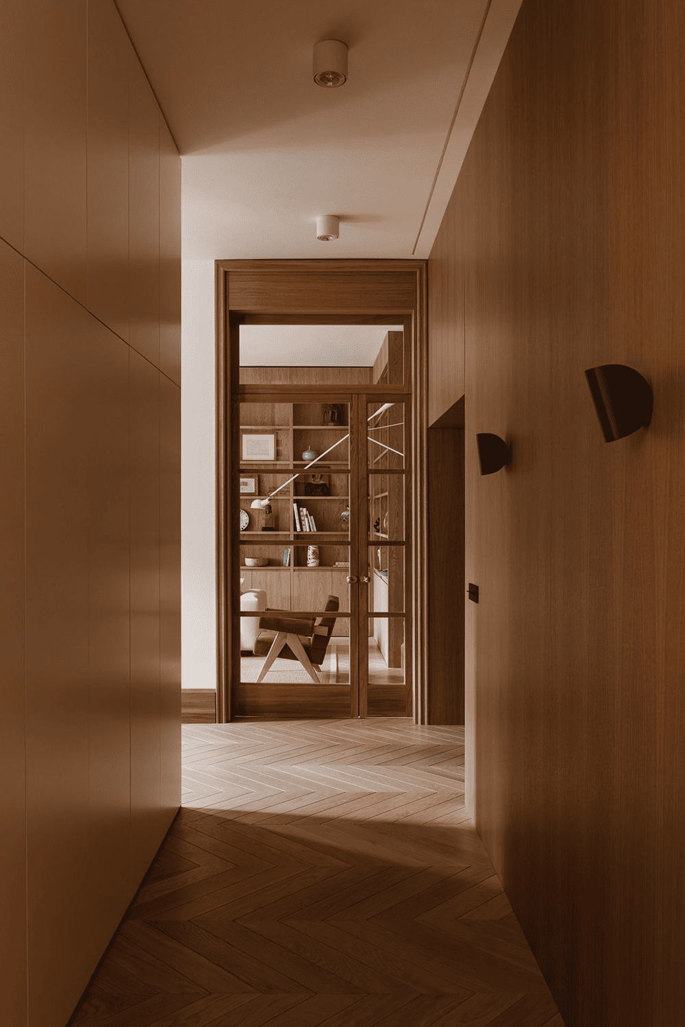 在与业主(一位热爱艺术和建筑的平面设计师)的密切合作下,Magdalena Romanowska应用了一种极简主义的设计语言,即简洁的线条和简单的几何图形,并以高贵的材料如卡拉拉大理石、油橡木和黄铜为基础,使公寓充满了低调的成熟气息,再加上一些标志性的现代主义家具和业主充满活力的艺术品及装饰藏品,而后用中世纪现代主义的特色来增添该住宅空间的六十年代特征——例如高高的天花板、人字形镶木地板和优雅的窗户木艺等,就诞生了一个在设计上无可挑剔的个性之家。