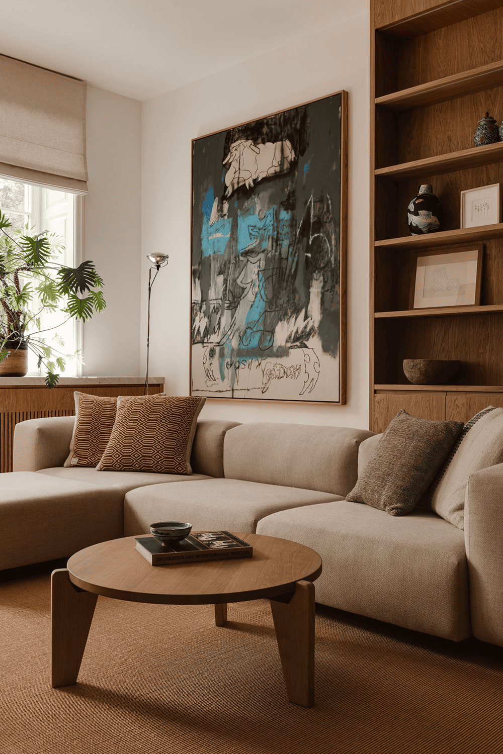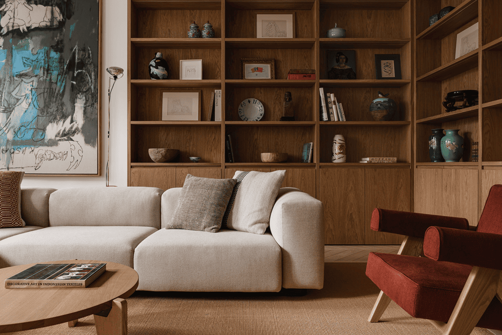 白漆墙面、人字形镶木地板和内置的简约橡木书柜和橱柜为这两个空间增添了一种怀旧的优雅感,而精心挑选的中世纪现代家具则进一步凸显了这一特点。
