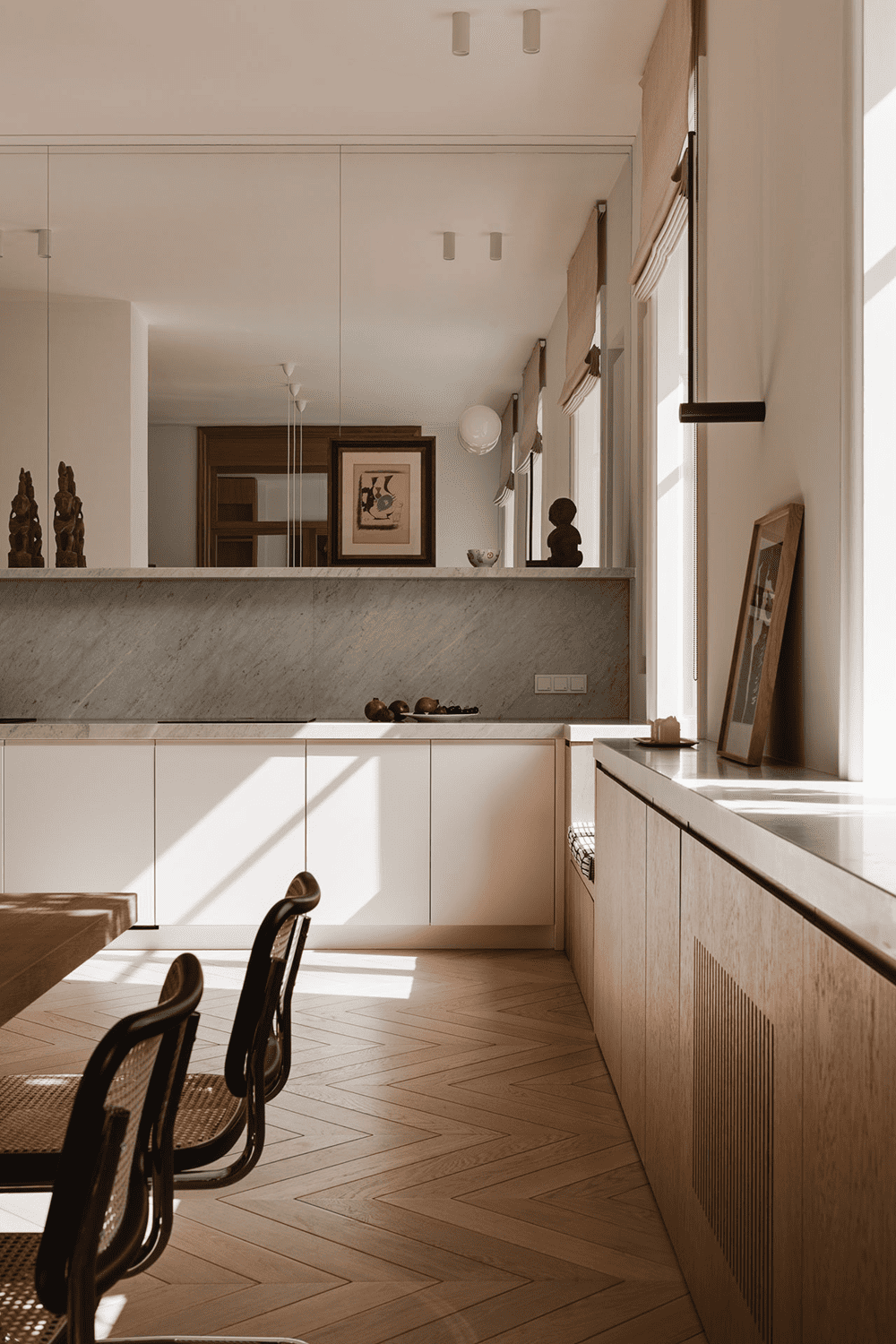 Magdalena Romanowska根据该空间的原始几何形状精心设计了许多定制设计元素,其中包括增强宽敞感的镜面厨房橱柜,以及将前厅与餐厅、厨房区域分开的橡木衣柜、橱柜。