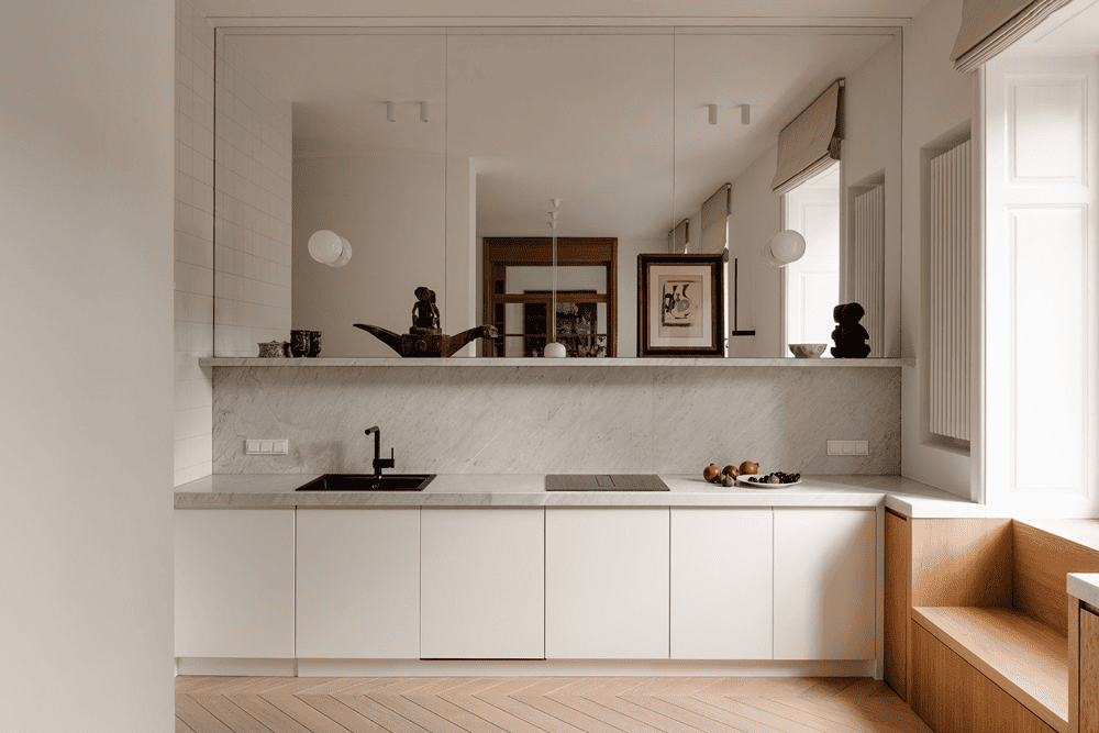 Magdalena Romanowska crafted a number of bespoke design elements based on the original geometry of the space, including mirrored kitchen cabinets that enhance the sense of spaciousness, and oak wardrobes and cabinets that separate the front room from the dining and kitchen areas.