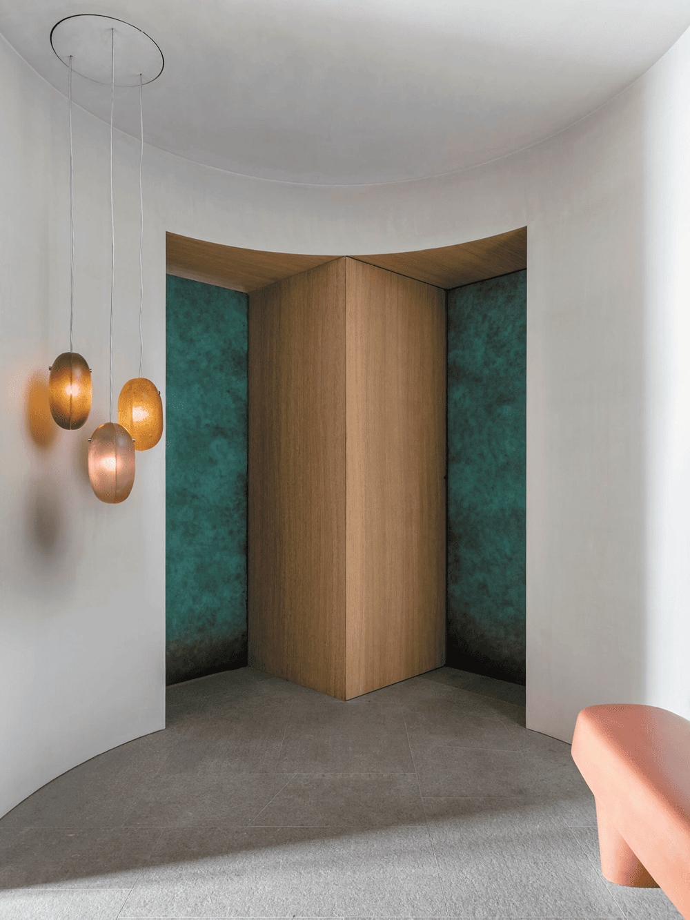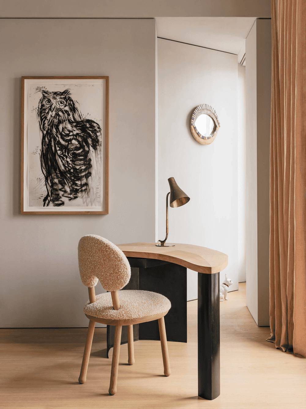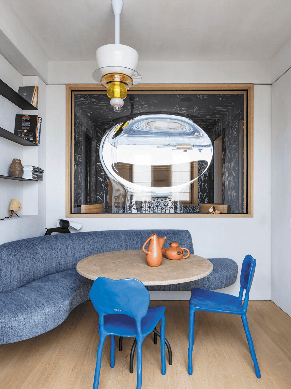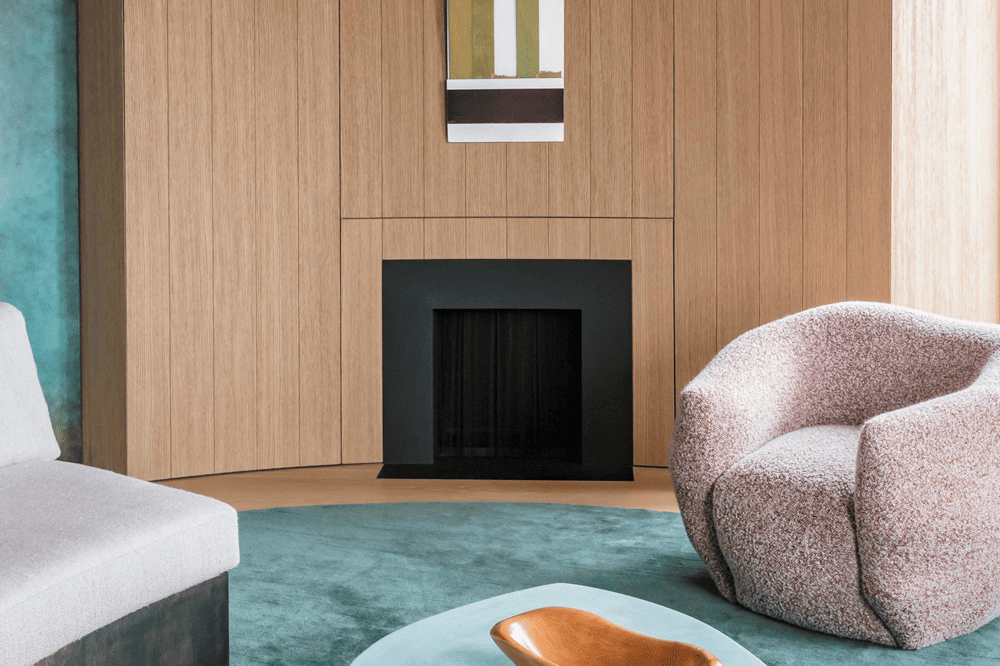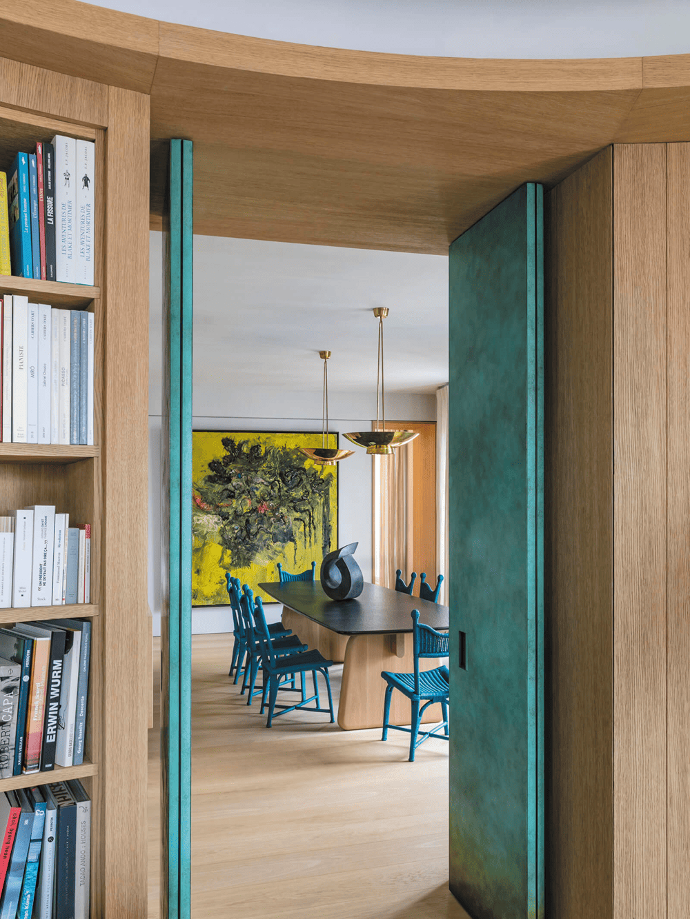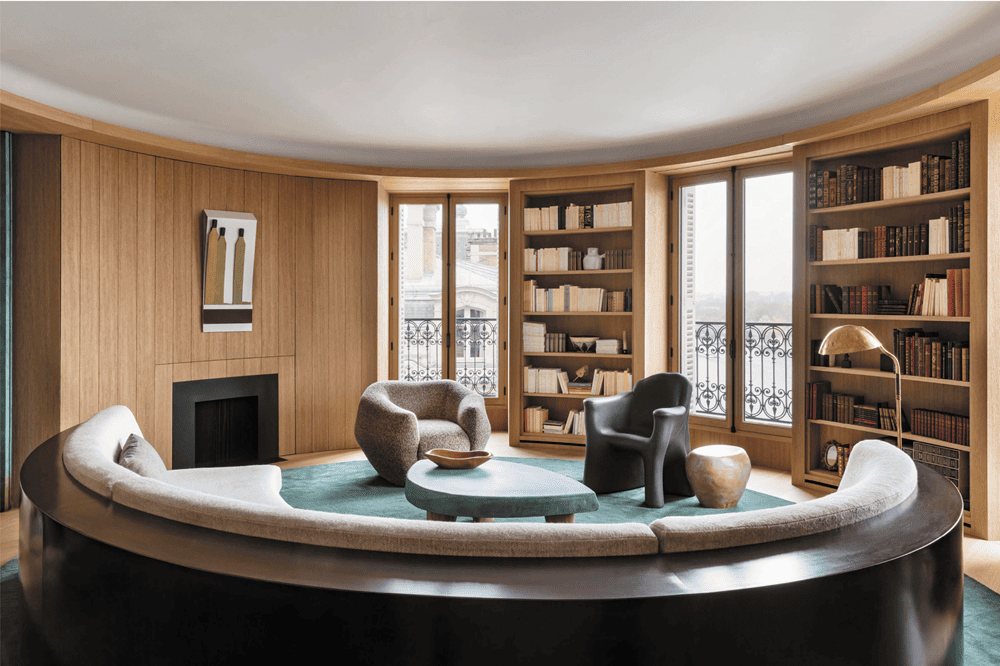 在客厅区域,直板的直角让位于空间镶板、橡木书柜和家具的弧形线条,这些都是定制的。
