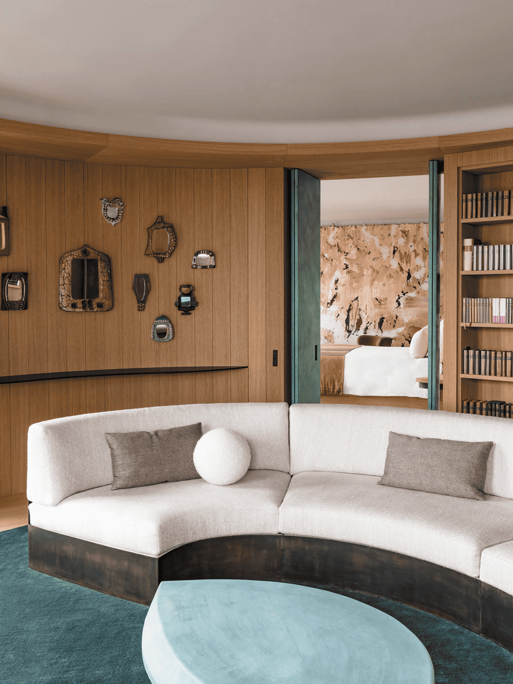 In the living room area, the right angles of the straight panels give way to the curved lines of the space's panelling, the oak bookcases and the furniture, which are all bespoke.