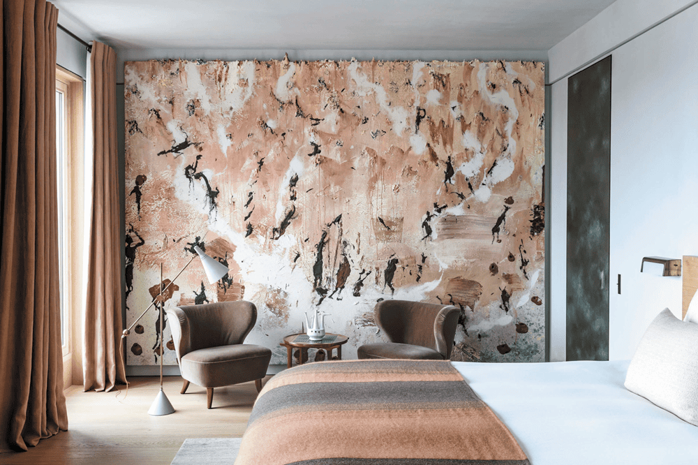 在Quai Voltair公寓的卧室里,有一幅西班牙艺术家MiquelBarceló的巨幅画作。