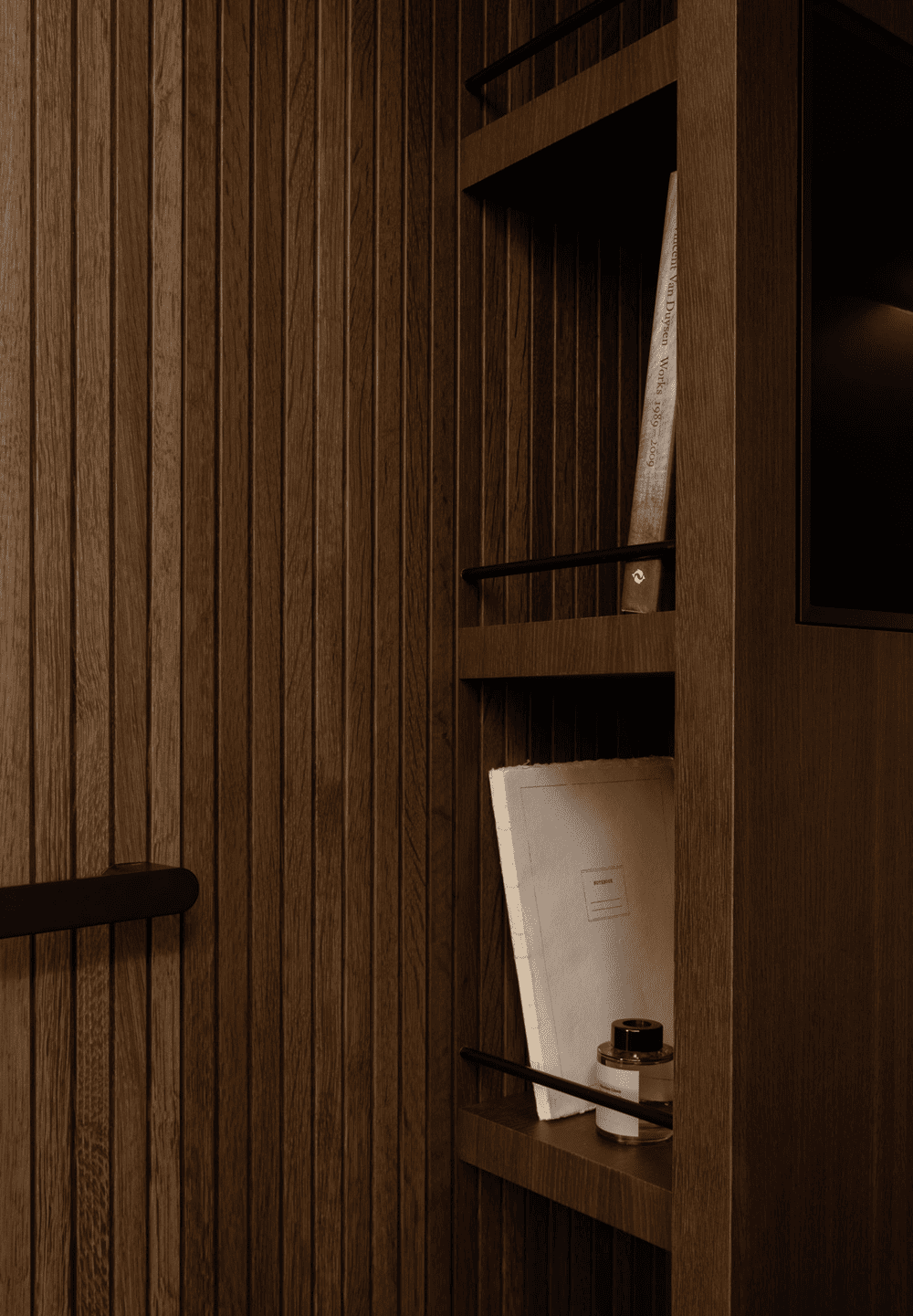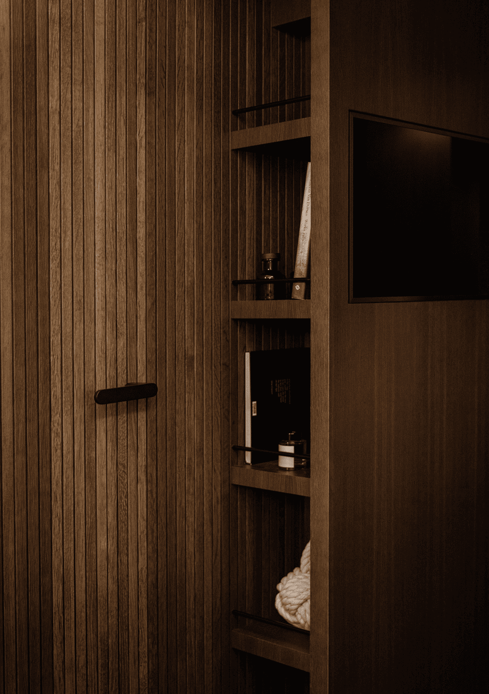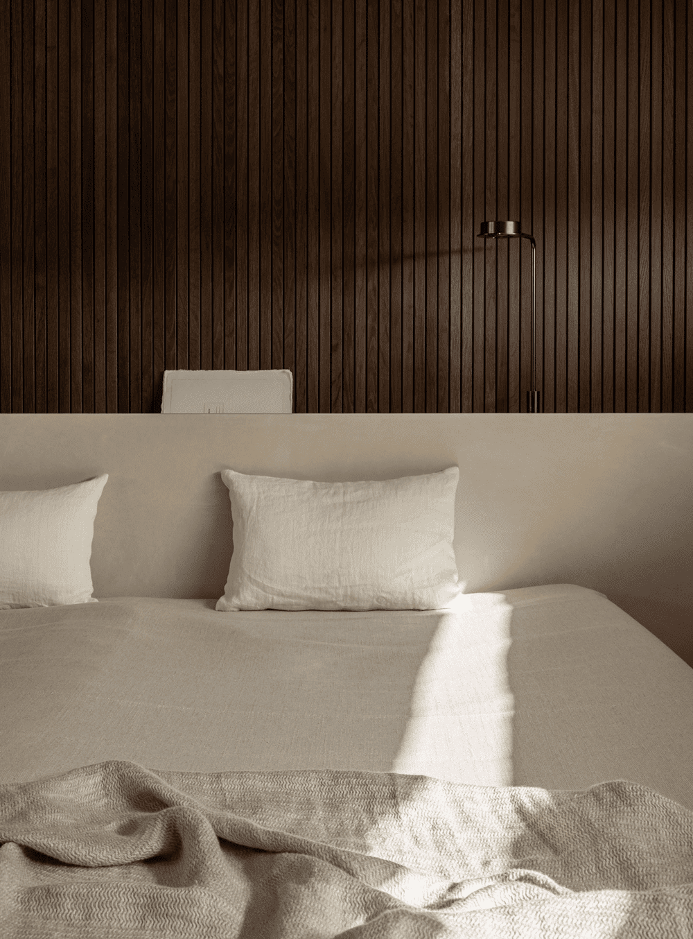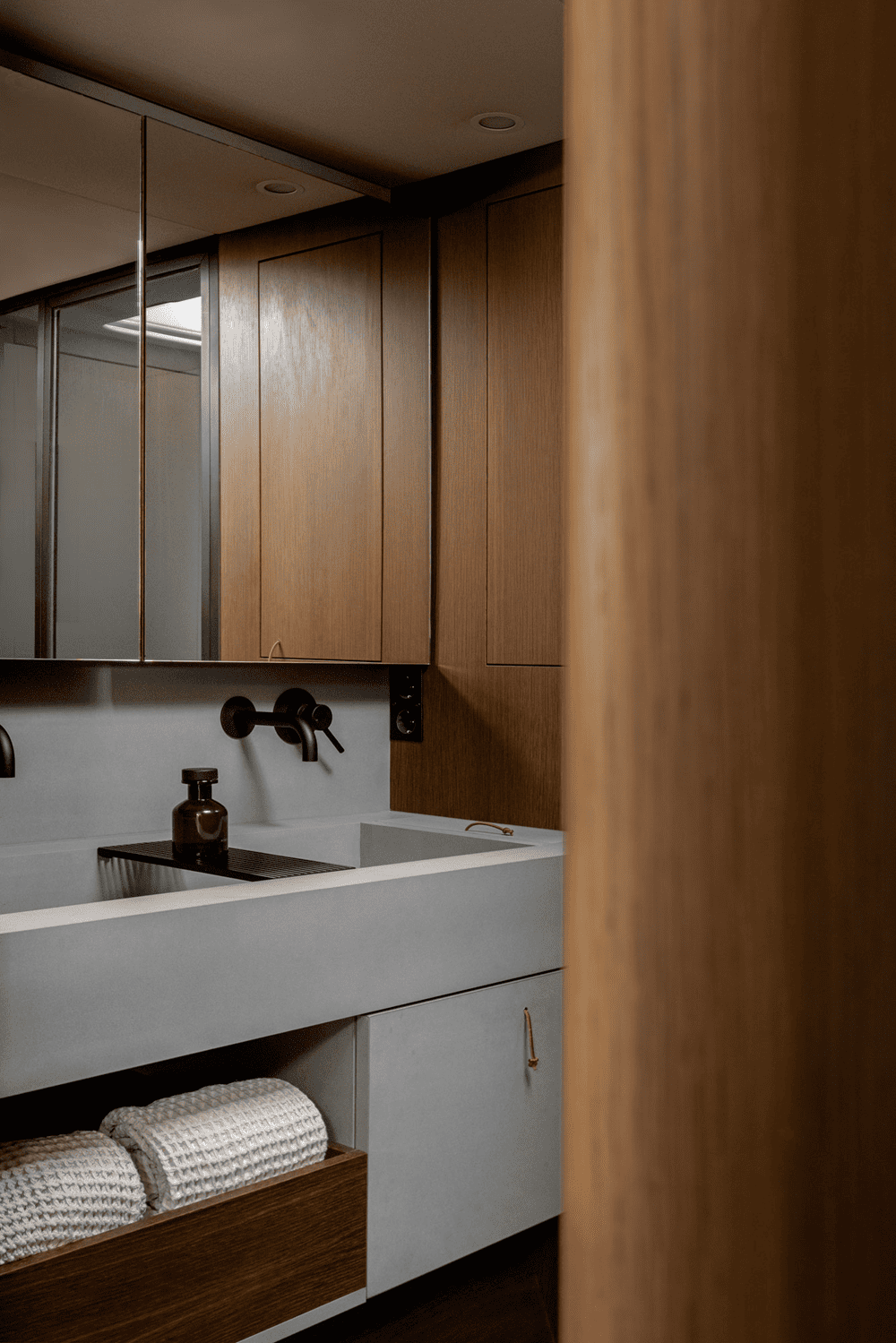Adjacent to the master bedroom, one will find a calm bathroom hidden behind the dark lamella wall. The material choices are drawn in and seem like a natural extension to the remaining interior. By only integrating the most essential, the space feels spacious in spite of the sparse square meters.