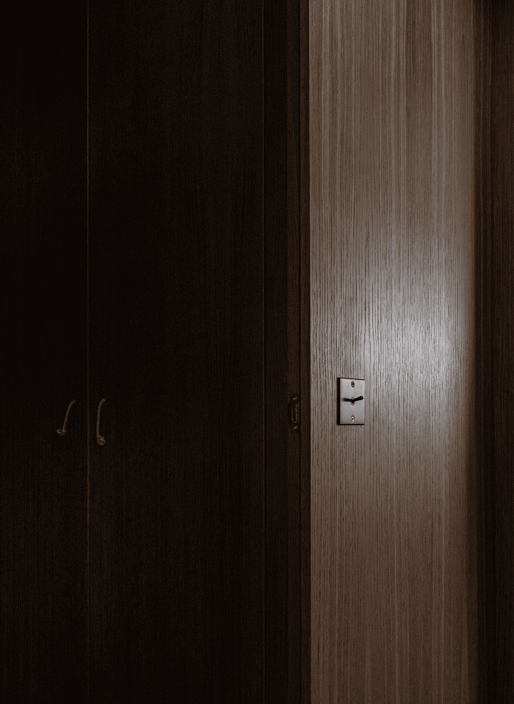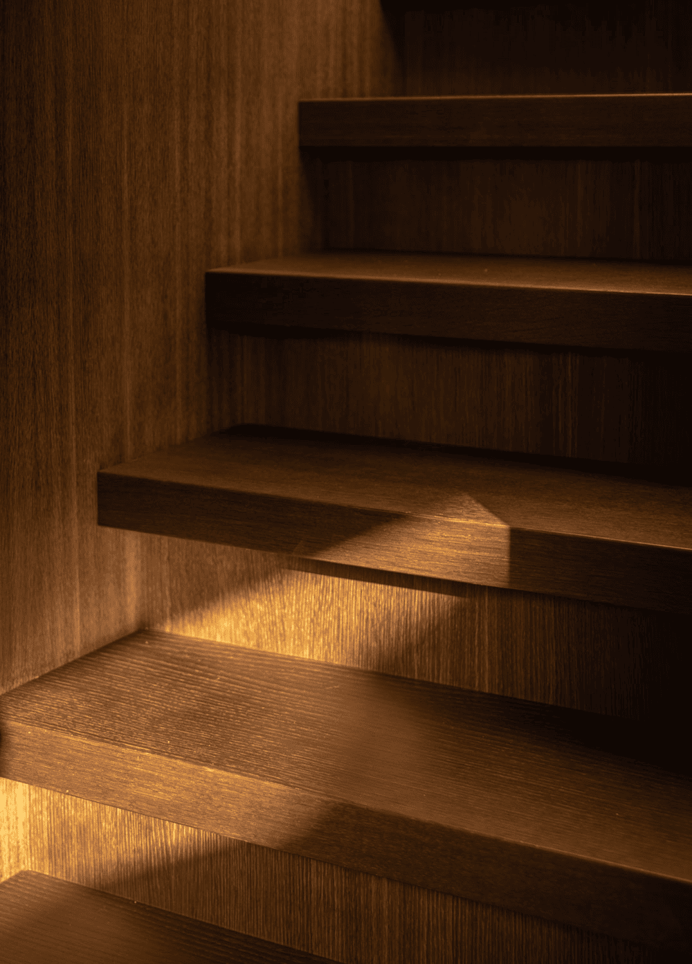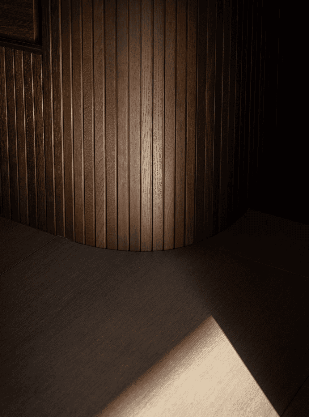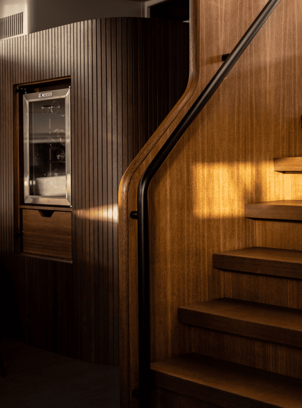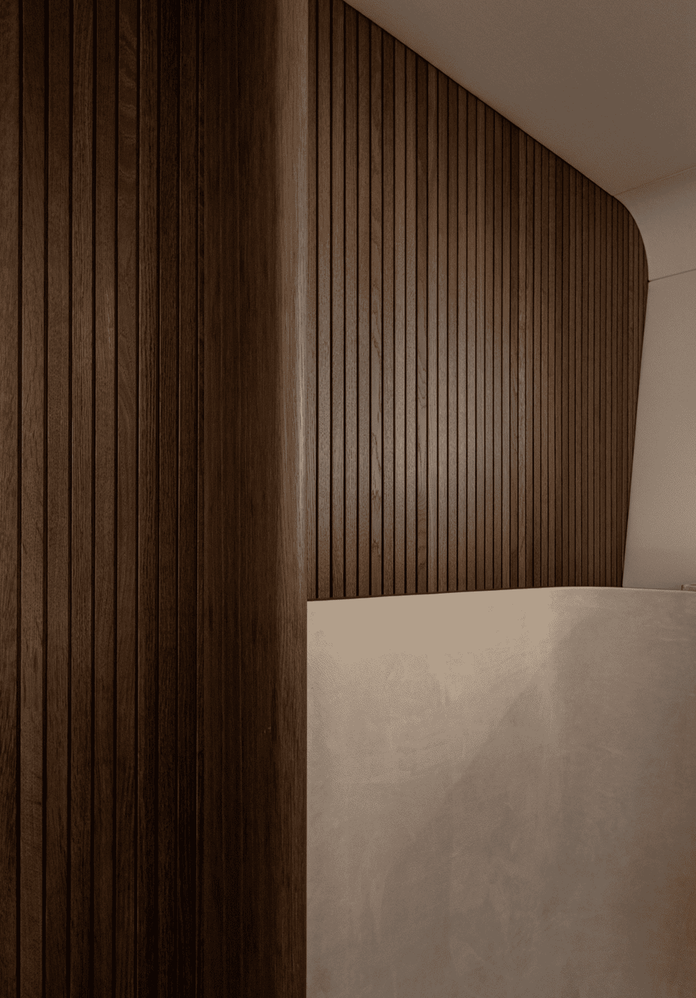 Adjacent to the master bedroom, one will find a calm bathroom hidden behind the dark lamella wall. The material choices are drawn in and seem like a natural extension to the remaining interior. By only integrating the most essential, the space feels spacious in spite of the sparse square meters.