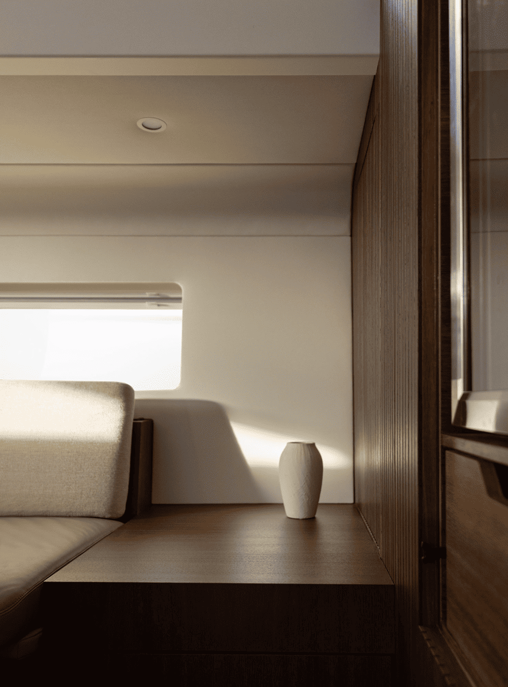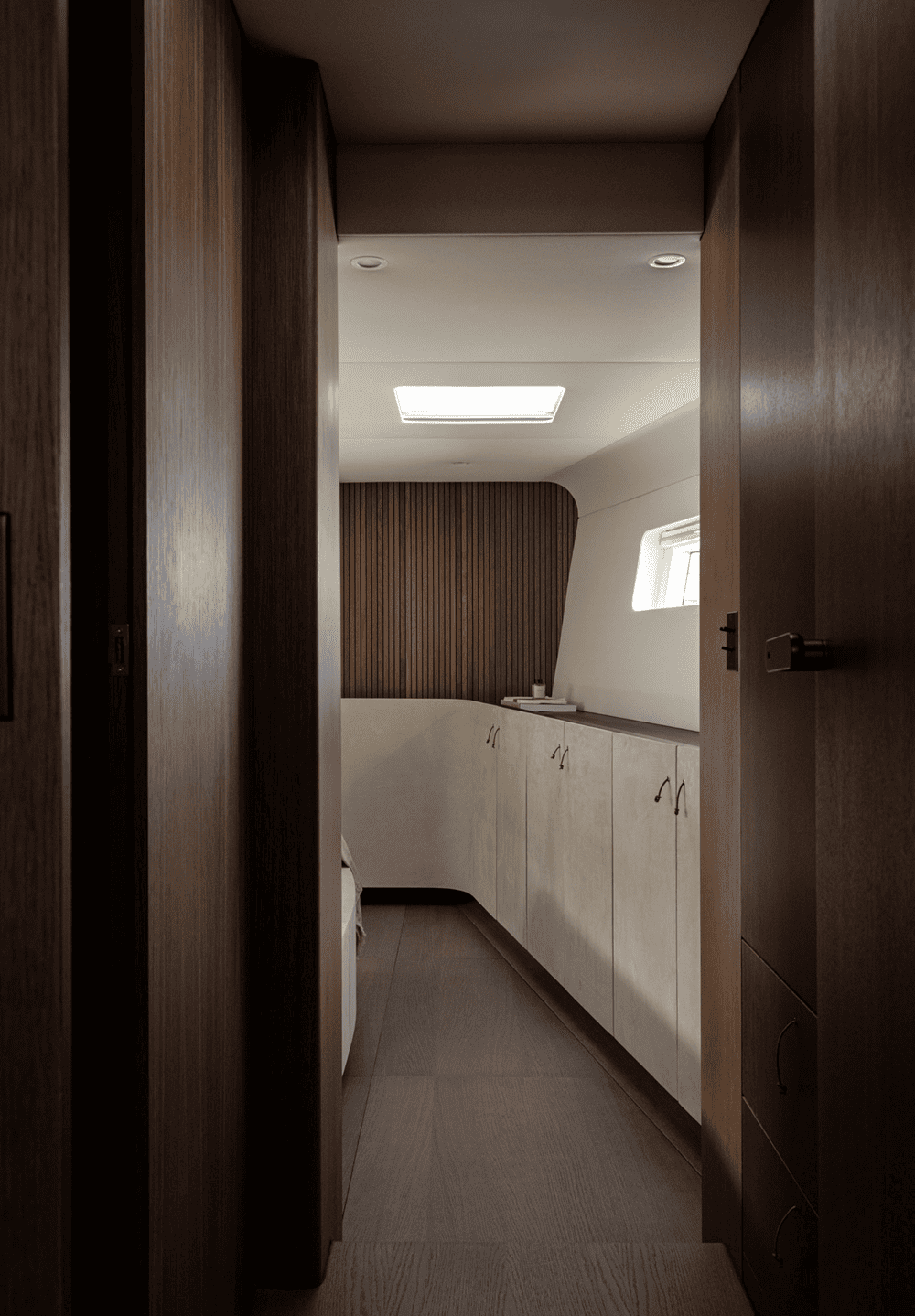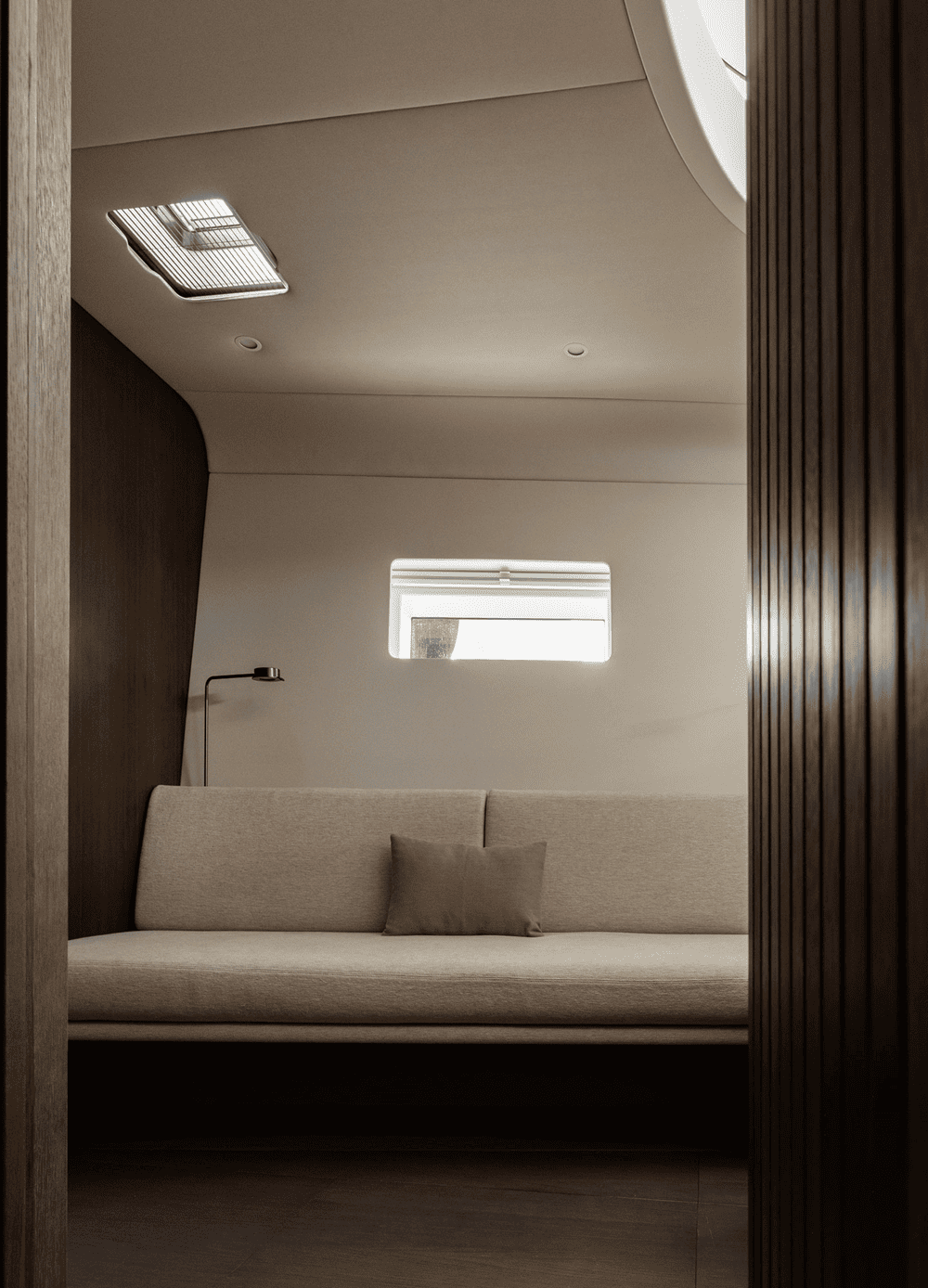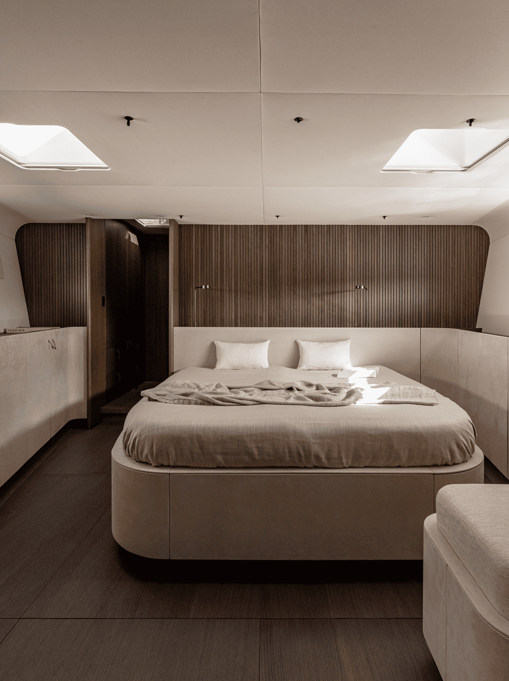 木质镶板墙壁和弧形橡木内饰为空间增添了温暖的有机感,同时在视觉上拉伸了空间的垂直度,使房间显得更加宽敞。推拉门和内置储藏室毫不费力地与游艇的建筑框架融为一体,没有留下任何破坏性元素。