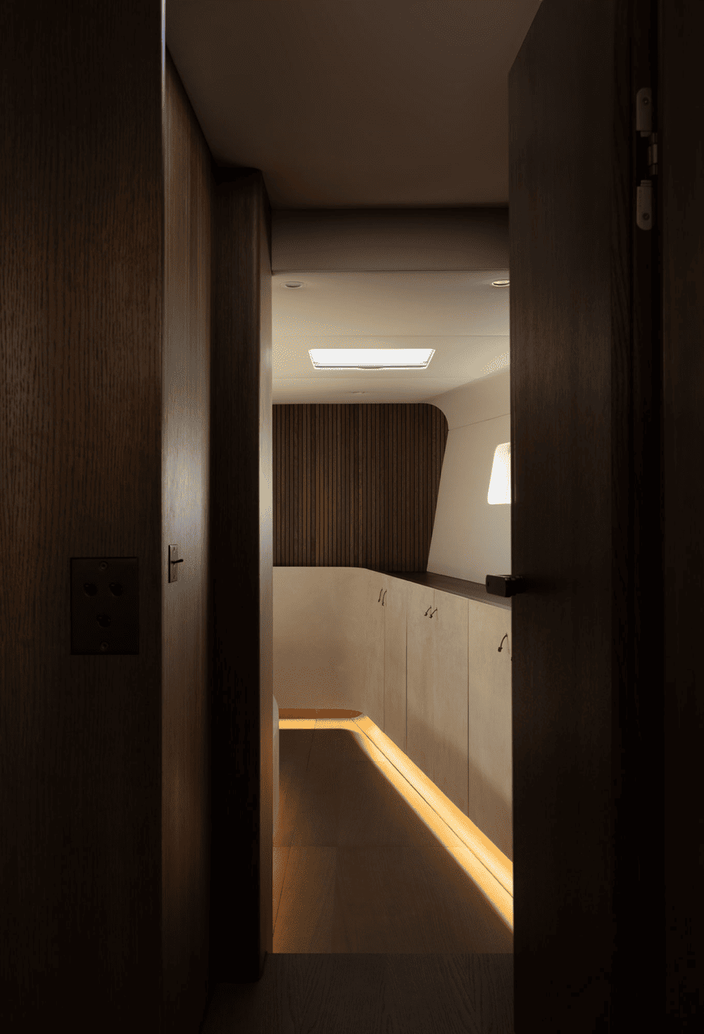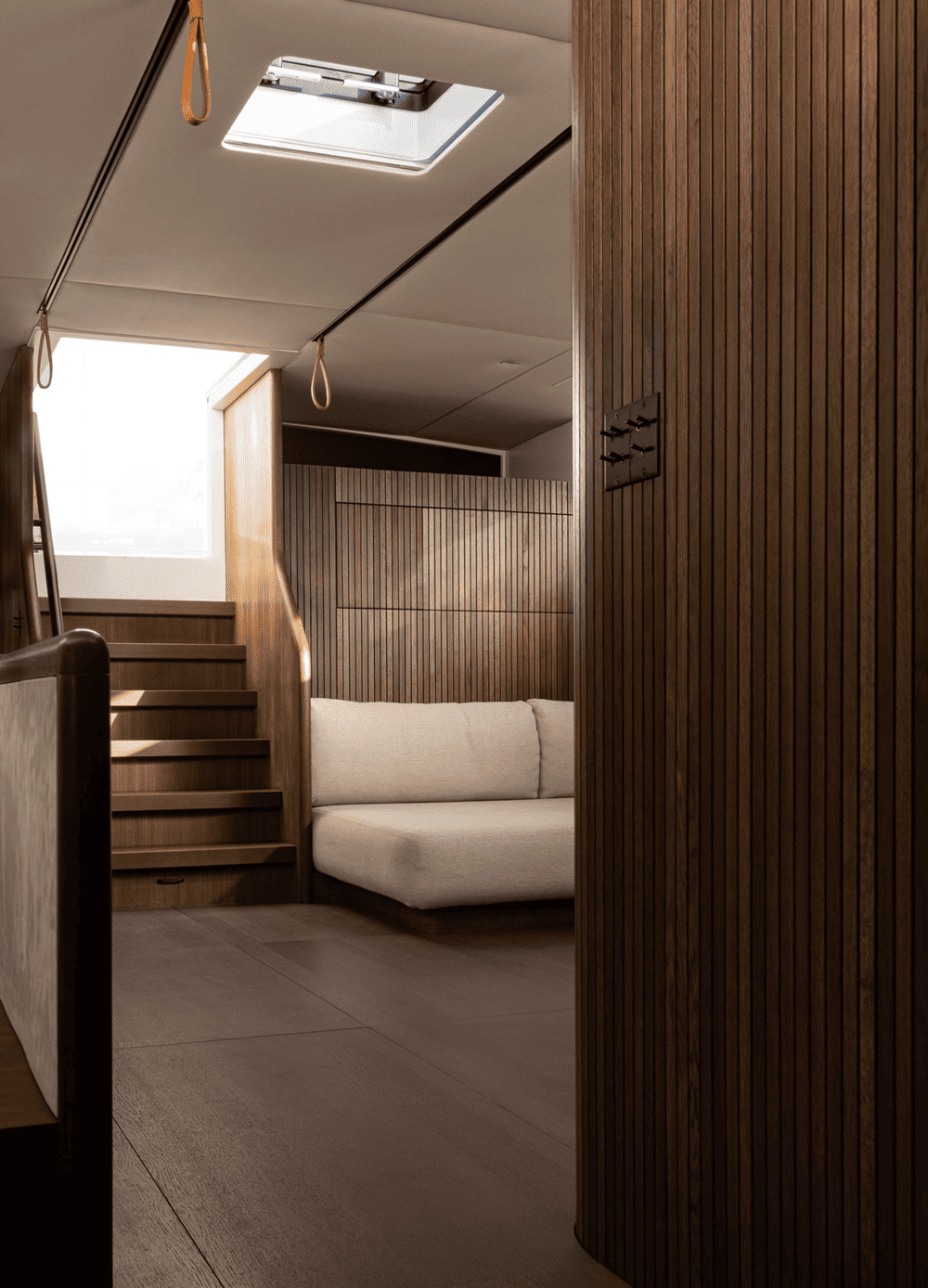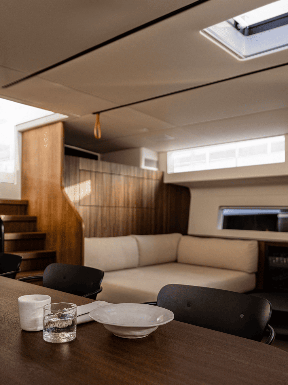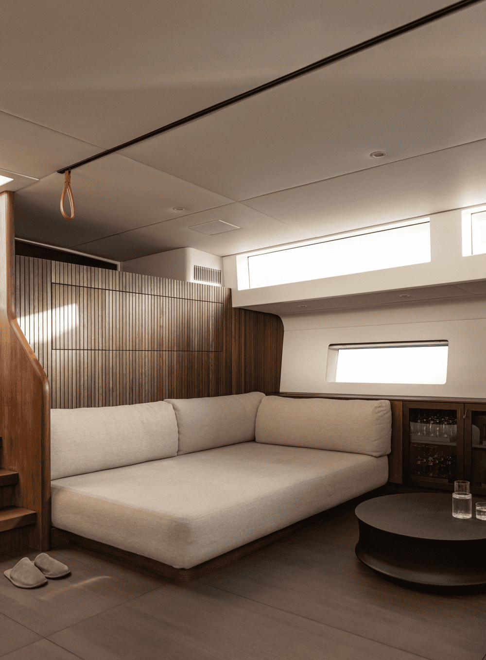木质镶板墙壁和弧形橡木内饰为空间增添了温暖的有机感,同时在视觉上拉伸了空间的垂直度,使房间显得更加宽敞。推拉门和内置储藏室毫不费力地与游艇的建筑框架融为一体,没有留下任何破坏性元素。