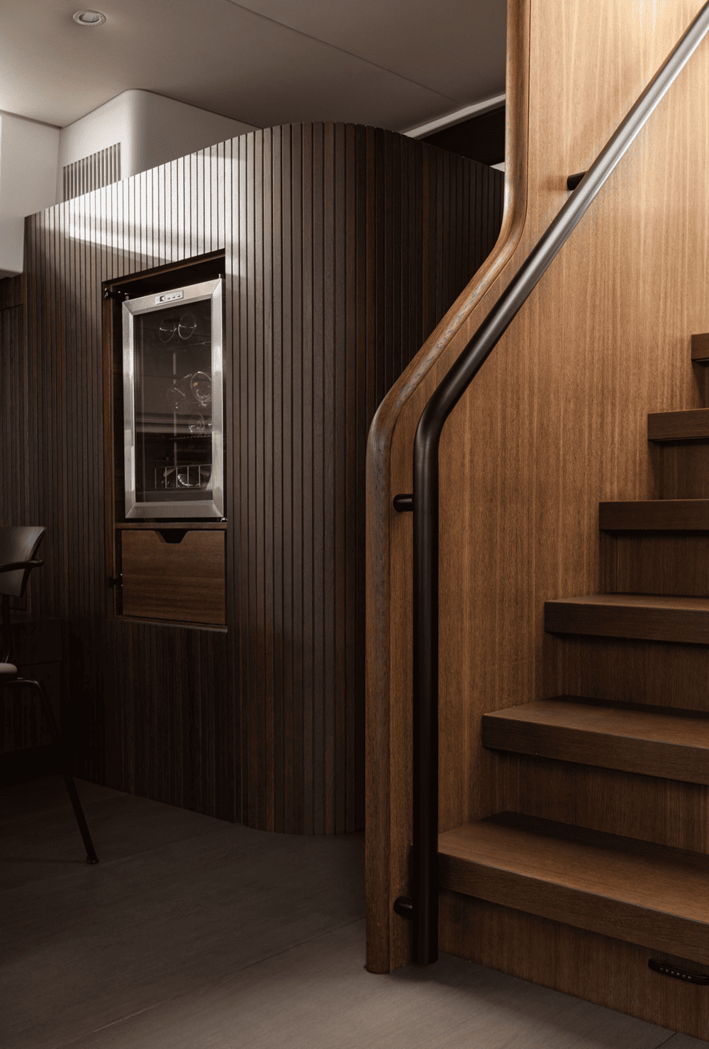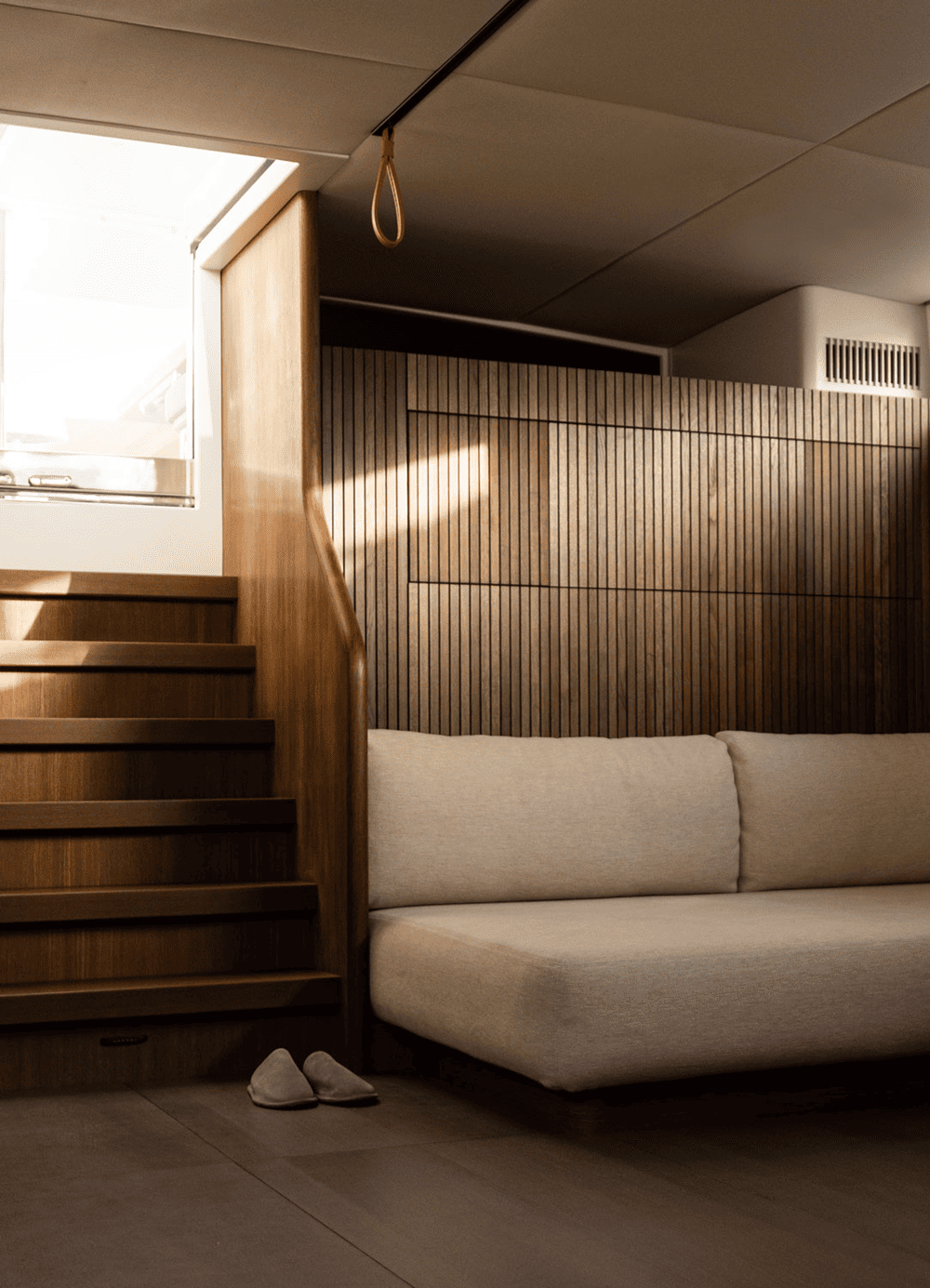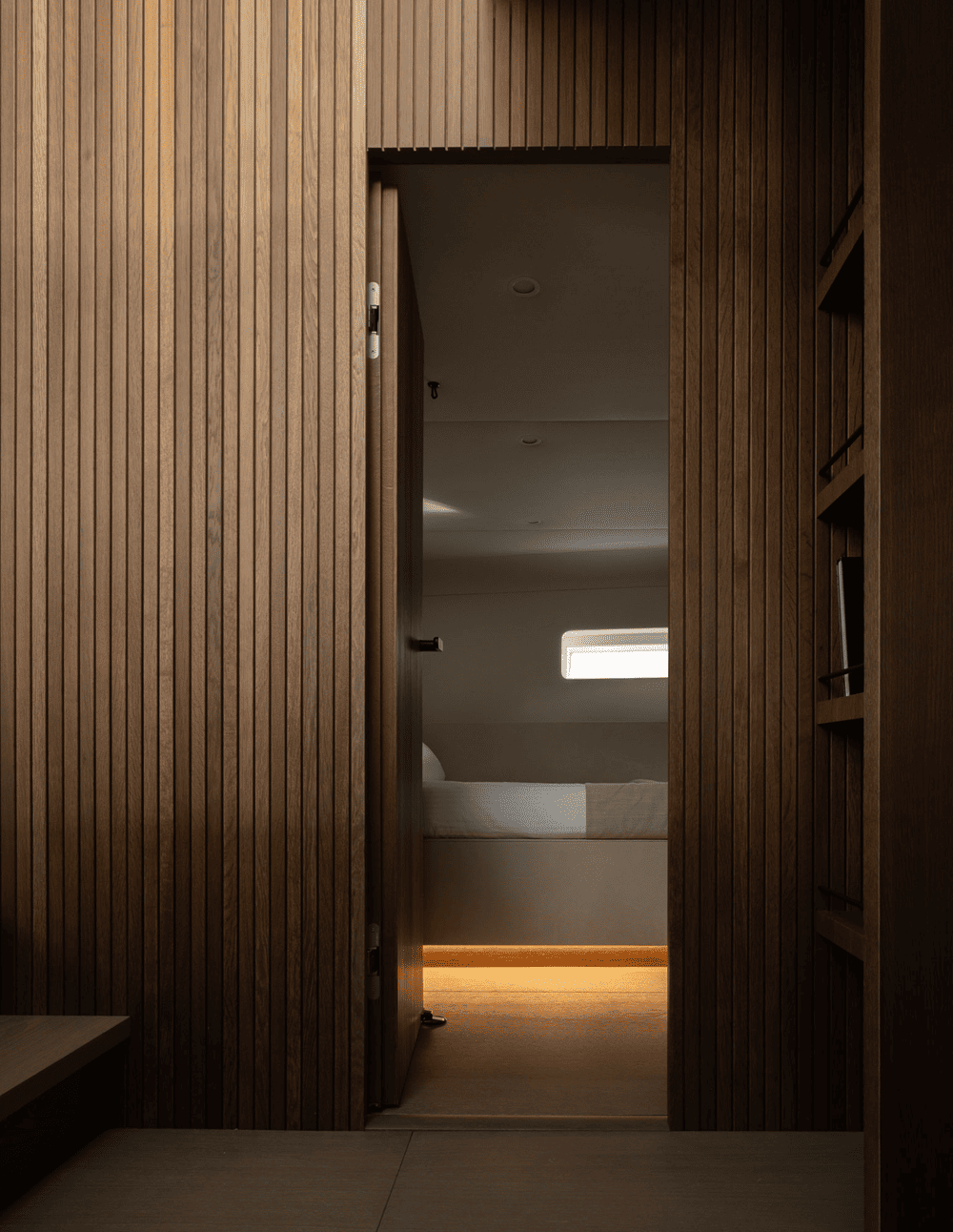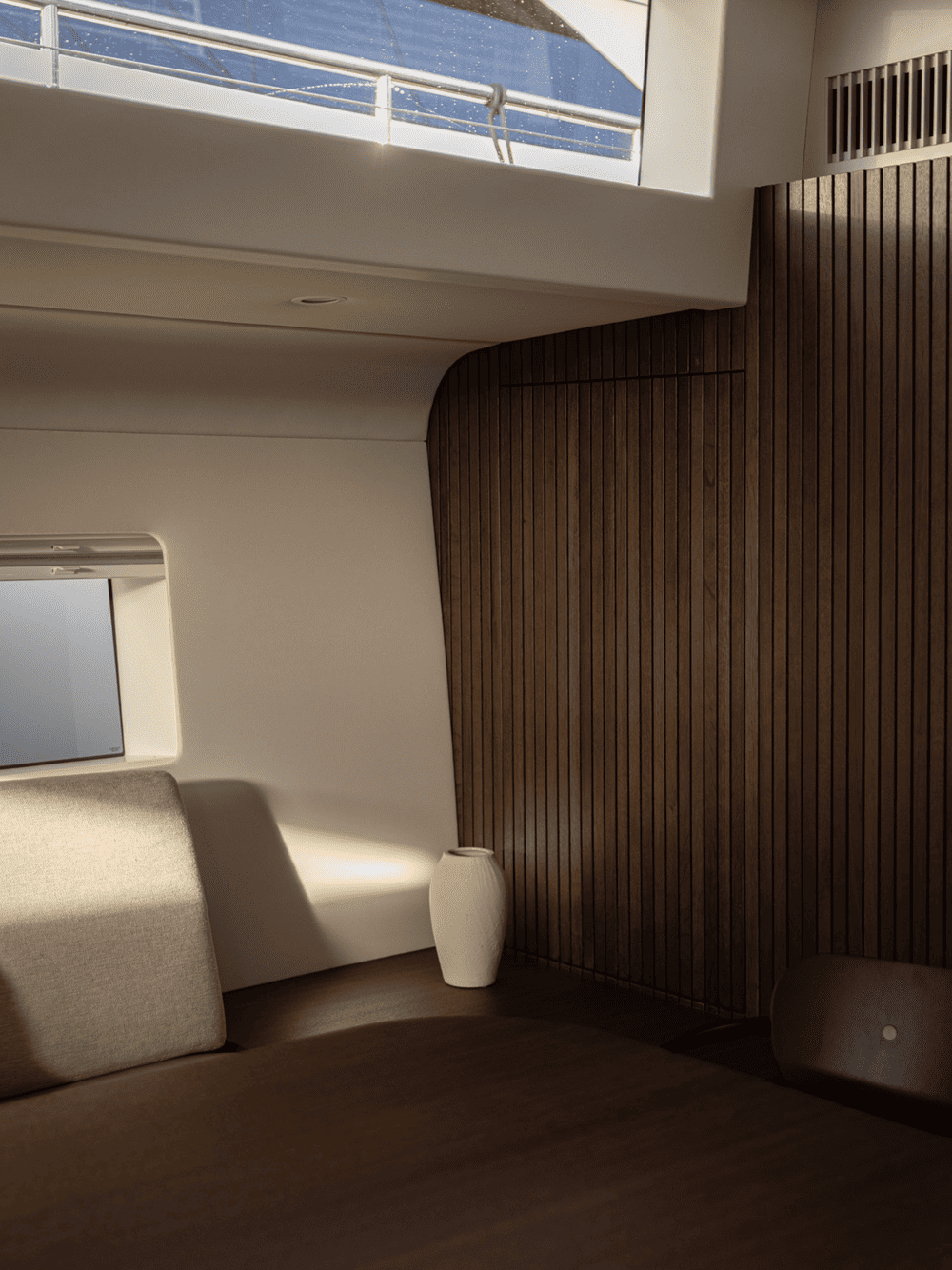 木质镶板墙壁和弧形橡木内饰为空间增添了温暖的有机感,同时在视觉上拉伸了空间的垂直度,使房间显得更加宽敞。推拉门和内置储藏室毫不费力地与游艇的建筑框架融为一体,没有留下任何破坏性元素。