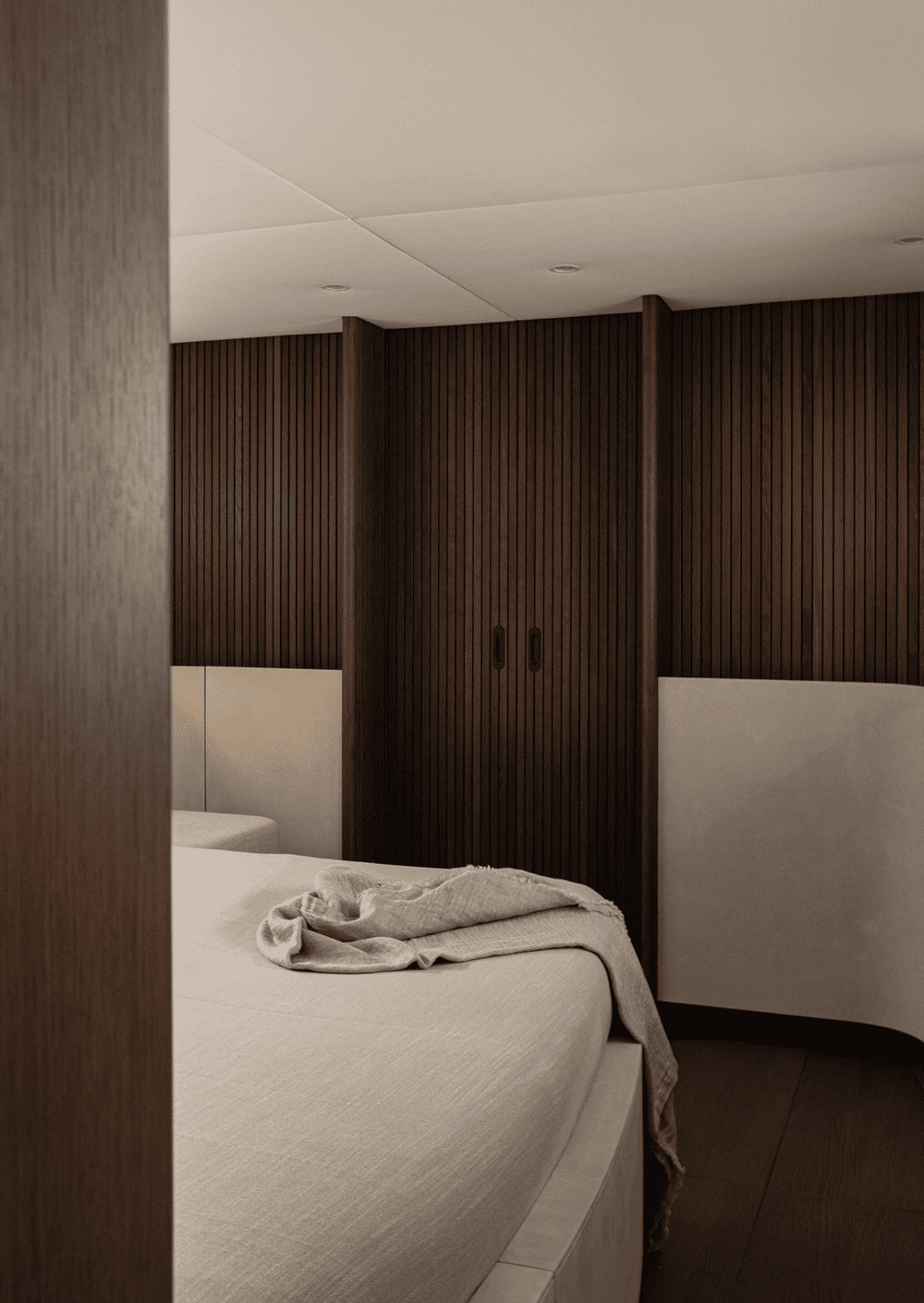 The master bedroom is placed in the bow of the yacht, with storage flanking the bed on both sides. To create a harmonious and coherent space, the cabinets as well as the bed are upholstered in a subtle suede textile, contrasting the dark, paneled walls and wooden floors.