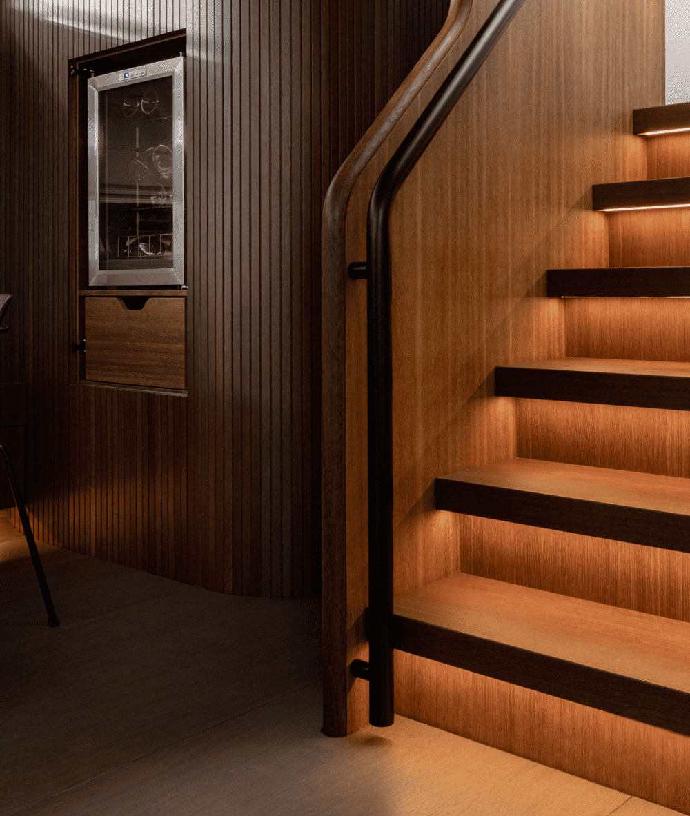 工作台之间只隔着几级台阶和一个房间隔断。我们将隔墙建到天花板的一半,确保不会限制室内的宽敞感,同时为业主创造一个舒适的多功能共处空间。
