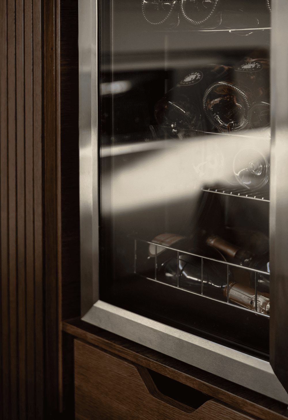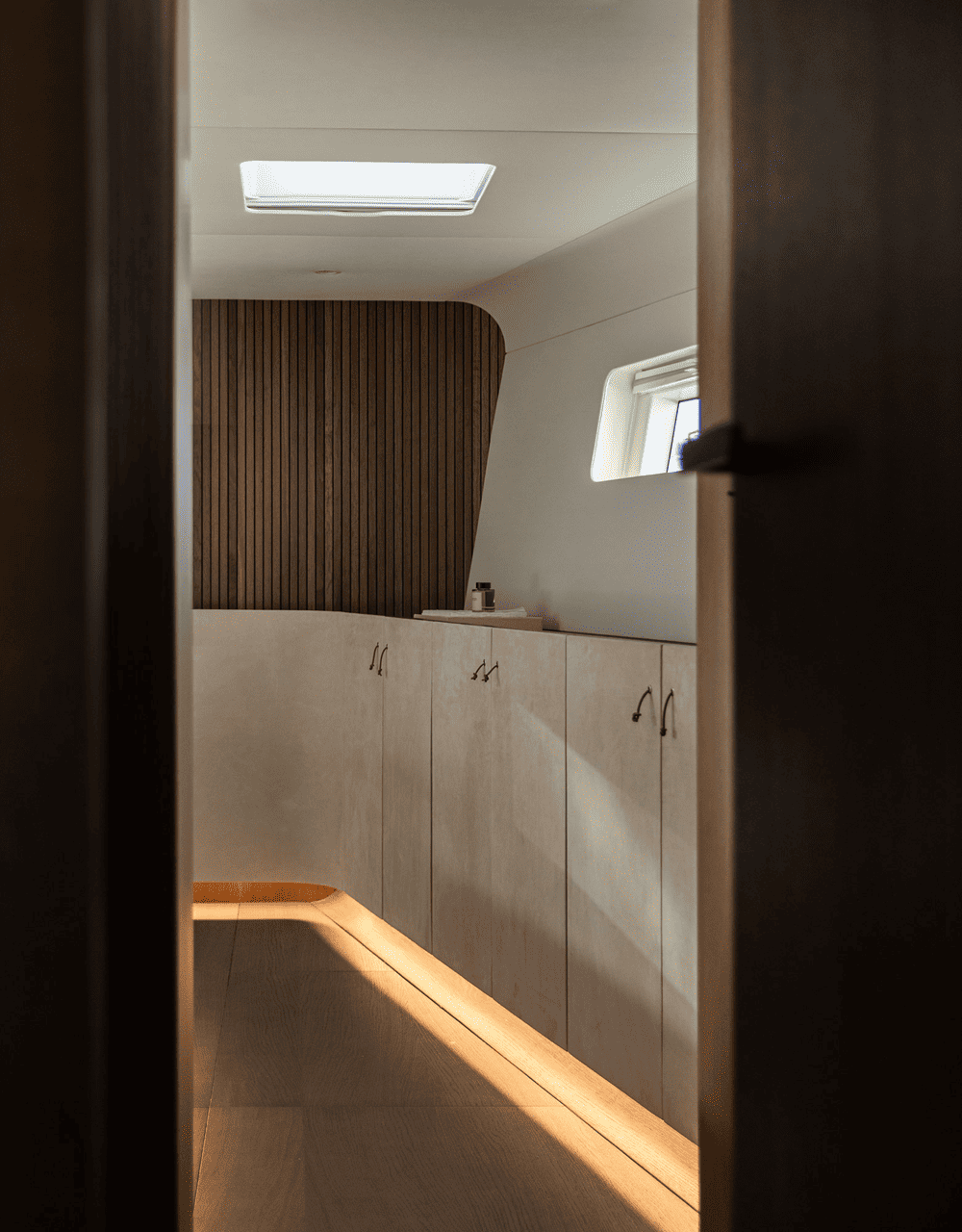 The wooden, paneled walls and curved interior elements in oak add a warm, organic feel to the space, while optically stretching the space vertically to make the rooms appear more spacious. Sliding doors and inbuilt storage effortlessly blend in with the architectural framework of the boat, leaving no disruptive elements.