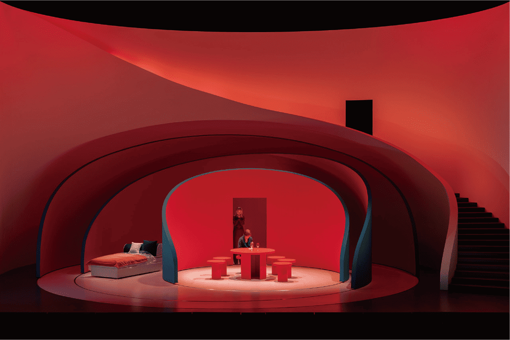 Pierre Yovanovitch's moveable design scheme has a modern aesthetic with a sensual timelessness, incorporating his signature curved staircase spanning the entire width of the stage, distinctive colors, and architectural angles into a bold and simple set that unfolds the drama's complex psychological storyline. Their movement serves to frame the characters and draw attention to shifts in behavior throughout the show. As the story unfolds, they merge into a tighter and tighter circle to enhance the psychological sense of drama. Each wall within the curved stage is painted bright red on the inside and blue on the outside, and can rotate 360 degrees around a circular track, punctuated by a rectangular doorway in the center.