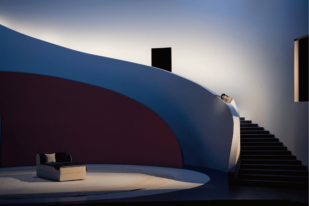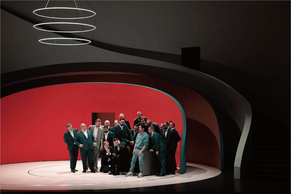 在背景中,还可以看到一个巨大的白色弧形楼梯 —— Pierre Yovanovitch的标志性设计风格似乎横跨歌剧院的宽度,而悬挂在天花板上的是一盏极简主义的枝形吊灯,由三个同心光环组成。布景设计让人联想到Richard Serra不朽雕塑的俯冲建筑曲线,以及其对观众感知的扭曲效果,在这种情况下,布景的可移动设计更显突出。通过使装置移动,Pierre Yovanovitch还使每个场景为观众提供了不同的视角,正如他为弯曲的墙壁选择的颜色一样,在白色、蓝色和红色之间交替出现的彩色墙面令人回味无穷,并使人们注意到整个演出中的行为转变。