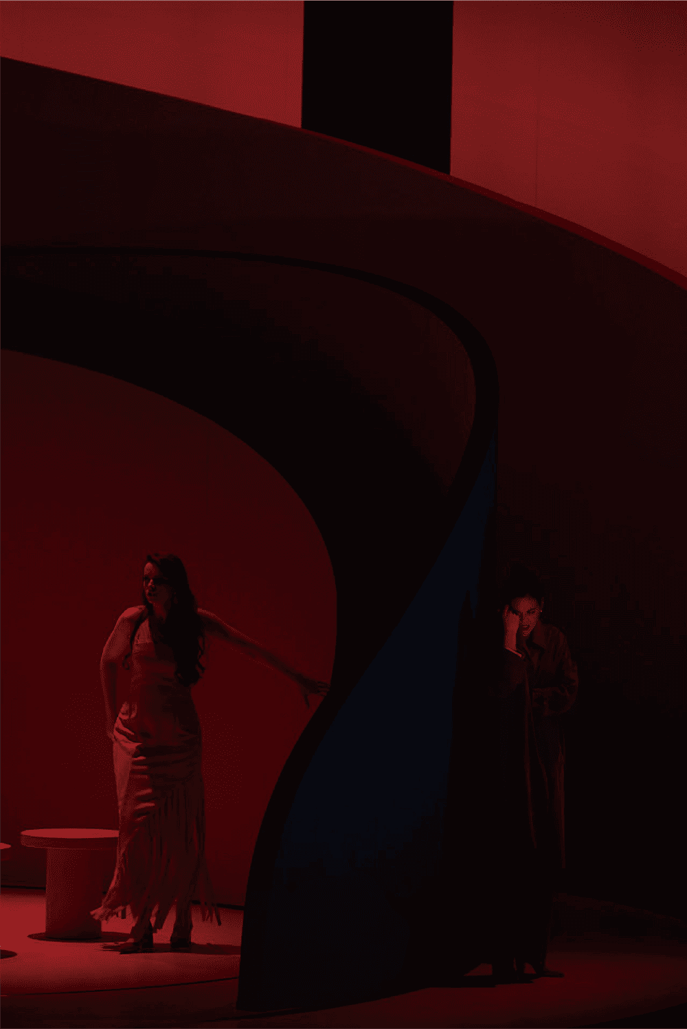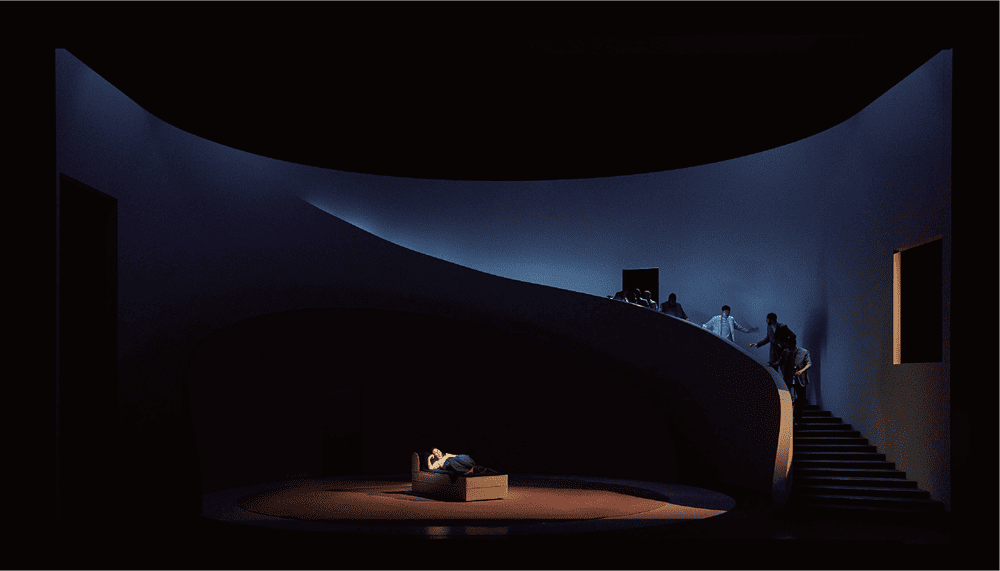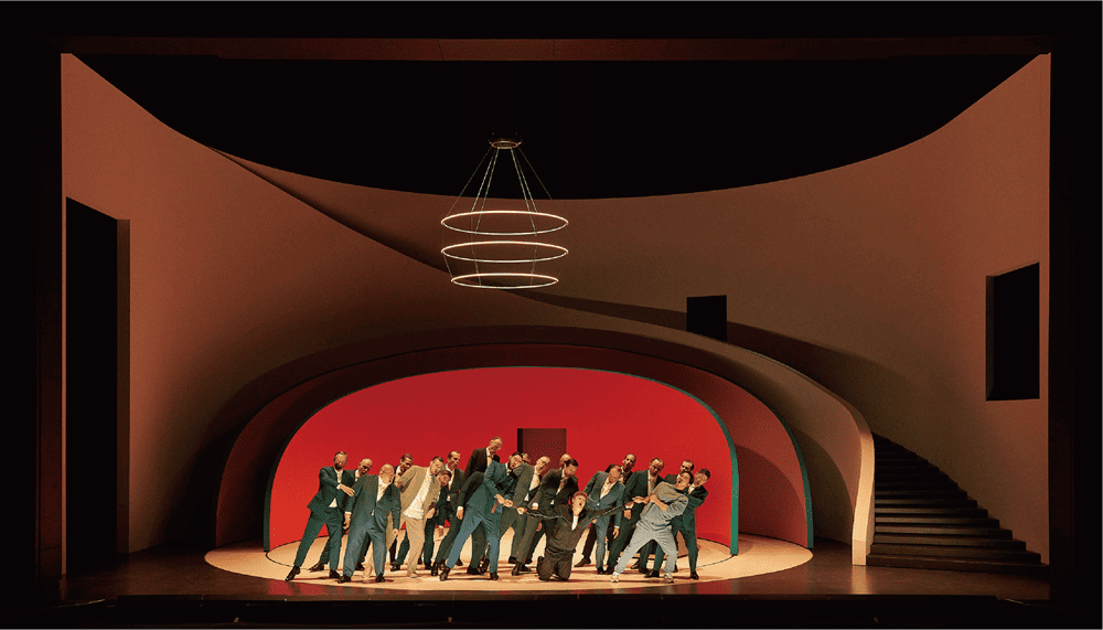 Also visible in the background is a massive white curved staircase - Pierre Yovanovitch's signature design style seems to span the width of the opera house - and hanging from the ceiling is a minimalist chandelier made up of three concentric halos. The set design evokes the swooping architectural curves of Richard Serra's monumental sculpture and its distorting effect on the audience's perception, in this case accentuated by the set's movable design. By making the installation mobile, Pierre Yovanovitch also makes each scene offer the audience a different perspective, as do the colors he has chosen for the curved walls, which alternate between white, blue, and red in an evocative way, and draw attention to the shifts in behavior that occur throughout the performance.