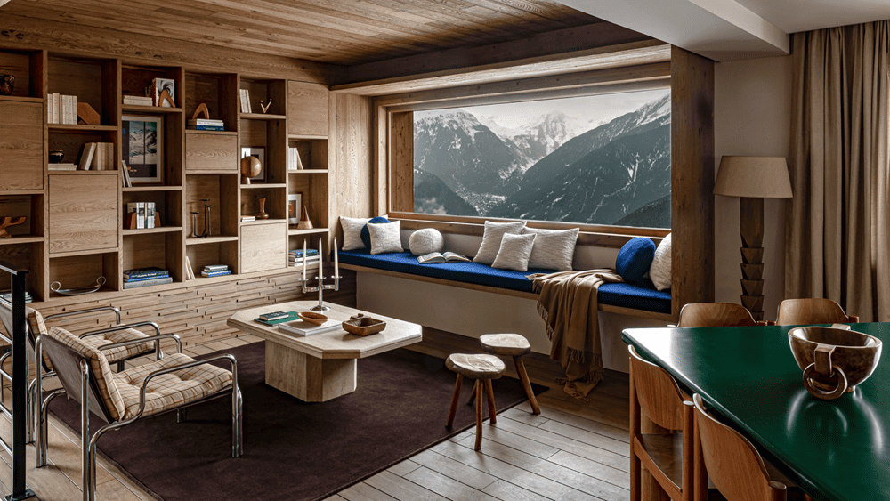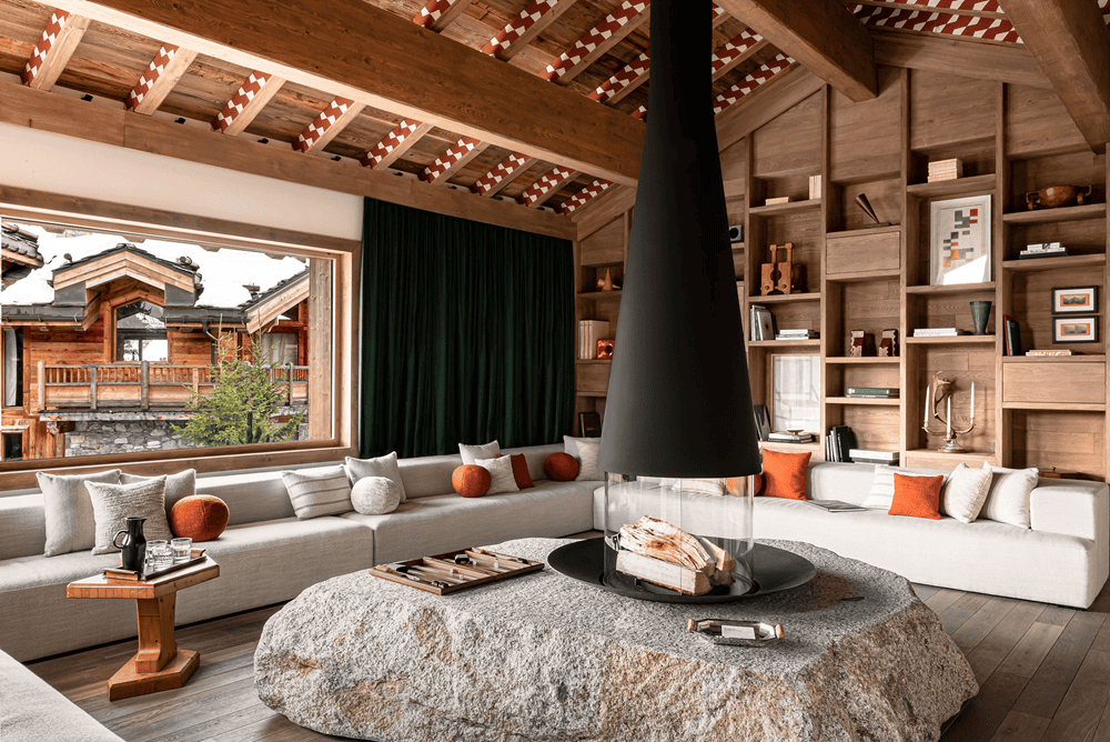 Reflecting the art of mountain living, Le 1550 elevates the space through a design core of wood, stone, and fireplaces, as well as fabrics, art, and furnishings selected by Joséphine Fossey.
