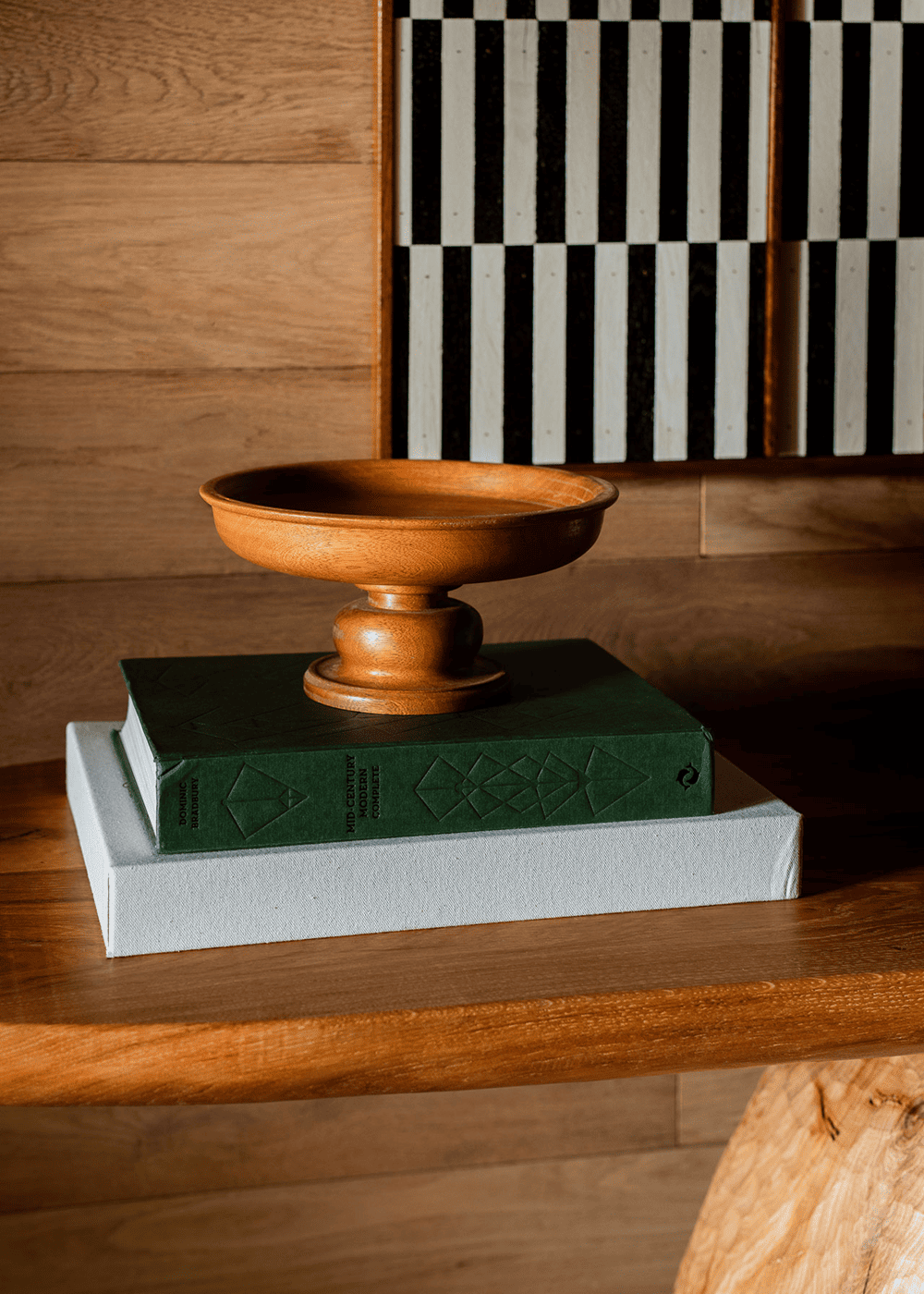 Impressive is the lacquered wood table in the dining room, which pays homage to the work of Charlotte Perriand. Customized by Savoy cabinetmaker Sylvain Perrier, the table is accompanied by a series of small sculptures inspired by modernism, also made from leftover wood shavings, which Joséphine Fossey artfully displays as “part of the ceiling”.