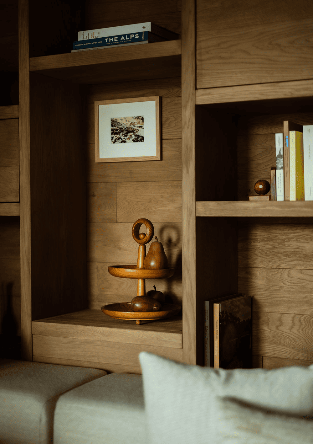 The use of natural wood finishes on almost everything from the hardwood floors, walls and ceilings to the built-in bookcases, joinery and furniture pieces gives the space a warm and cozy feel, yet at the same time bright and airy thanks to the expansive views of the surrounding Alpine landscape.