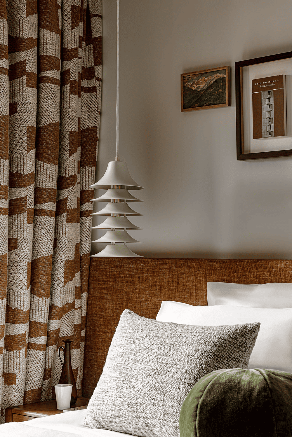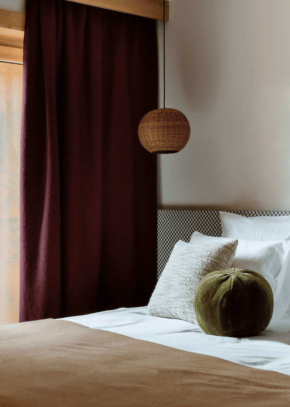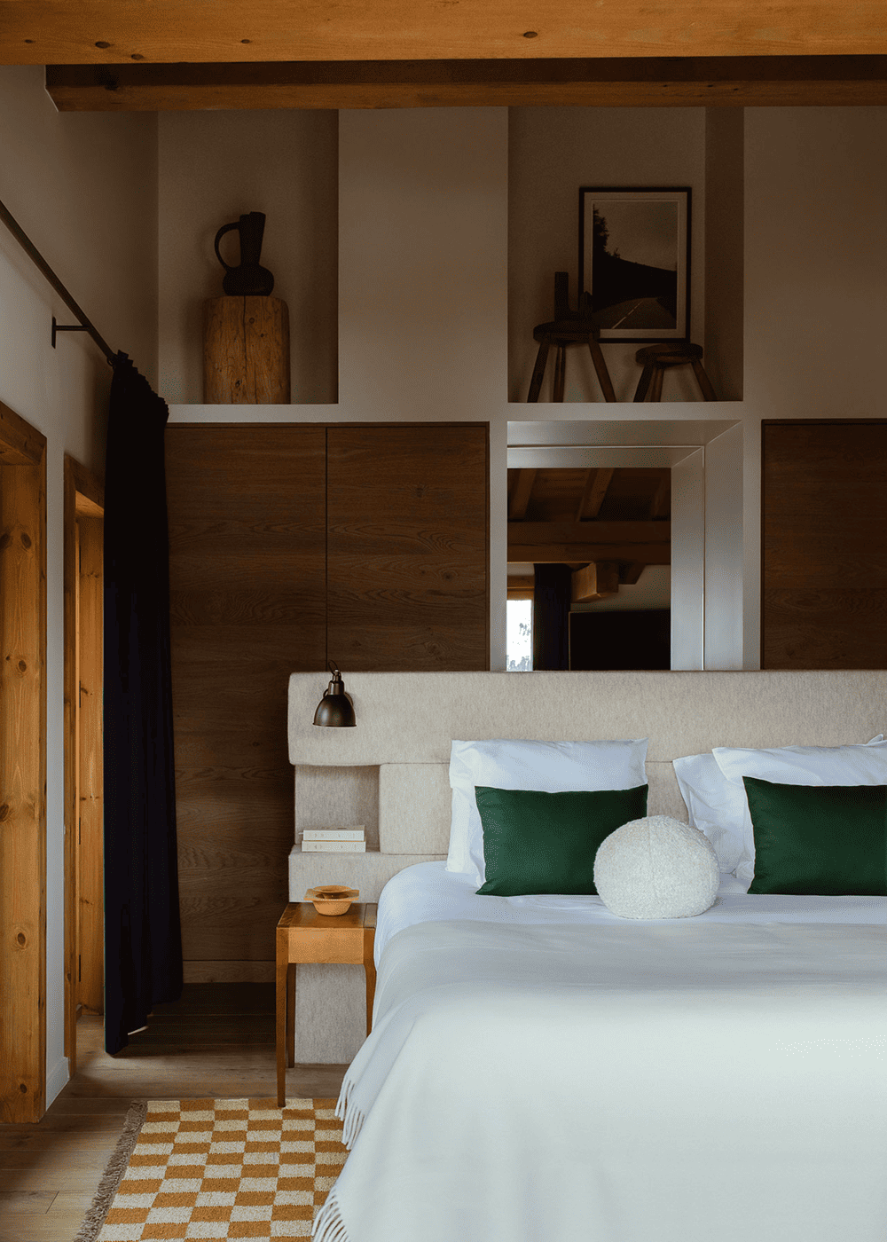 设计团队与当地的装饰品制造商Atelier des Frères合作,通过使用不拘一格的毛绒纺织品来补充以木材为主的色调 —— 窗帘、靠垫、床头板和毯子用鲜艳的色彩和俏皮的几何图案,这些物件为原本沉闷的室内环境注入活力。