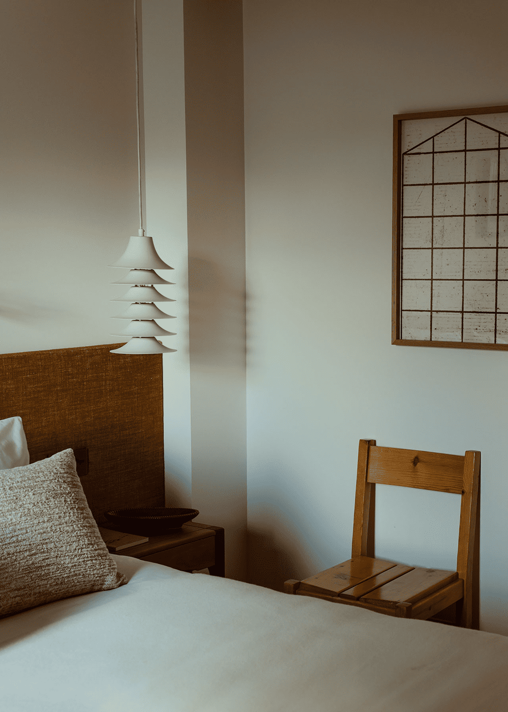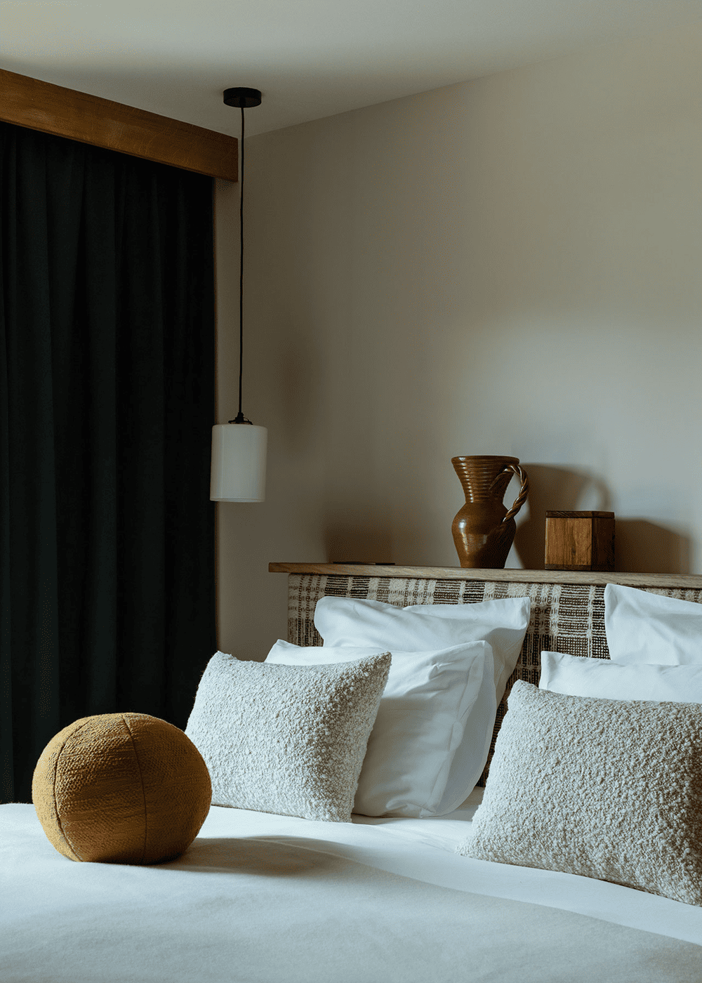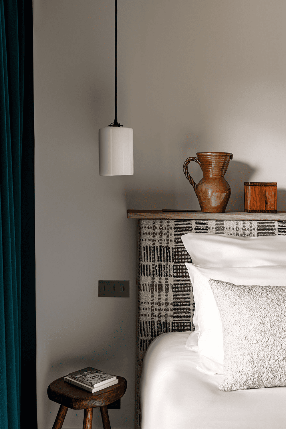 设计团队与当地的装饰品制造商Atelier des Frères合作,通过使用不拘一格的毛绒纺织品来补充以木材为主的色调 —— 窗帘、靠垫、床头板和毯子用鲜艳的色彩和俏皮的几何图案,这些物件为原本沉闷的室内环境注入活力。