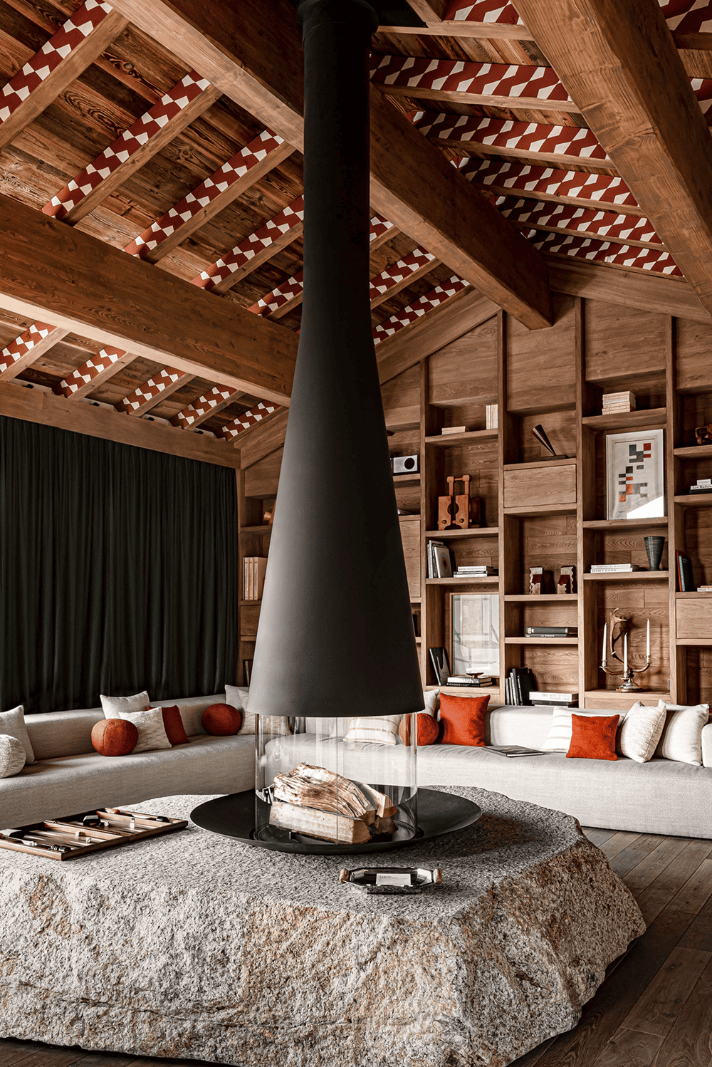 The most impressive space in Le 1550 is the living room, where large windows on both sides offer panoramic mountain views of the Alps. The majesty of the room is enhanced by a seven-colored Mont Blanc granite boulder that serves as a coffee table and fireplace base, while the wooden rafters of the roof structure are decorated with colorful geometric patterns.