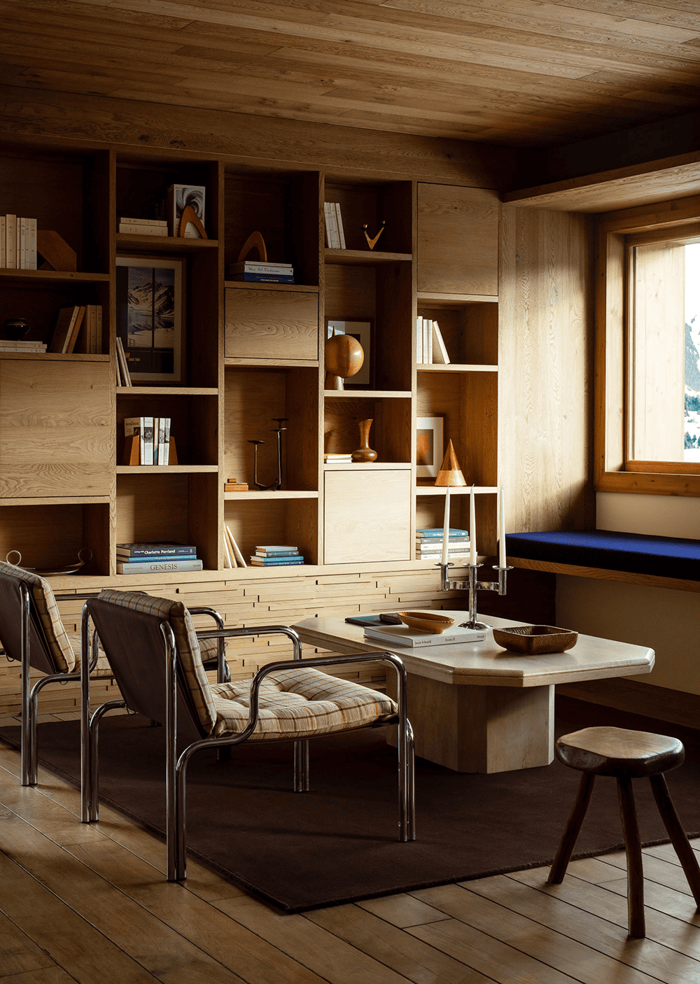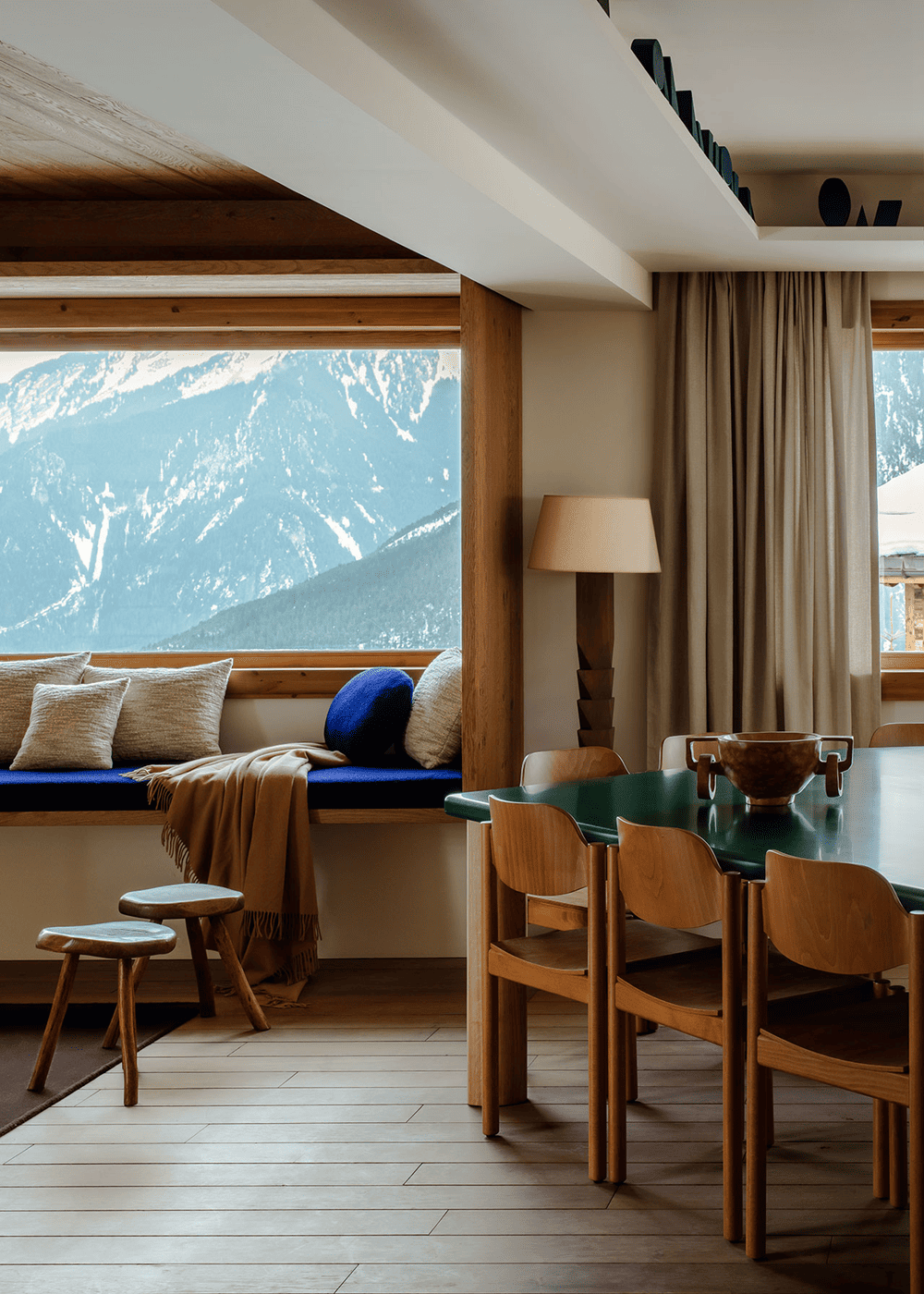From works of art and design like the Prieuré floor lamp to the shelves of carefully selected art books, novels and biographies, Le 1550 is a veritable treasure trove of modernist charm and authenticity of the French Alps, as well as a testament to Joséphine Fosseys' attention to detail.