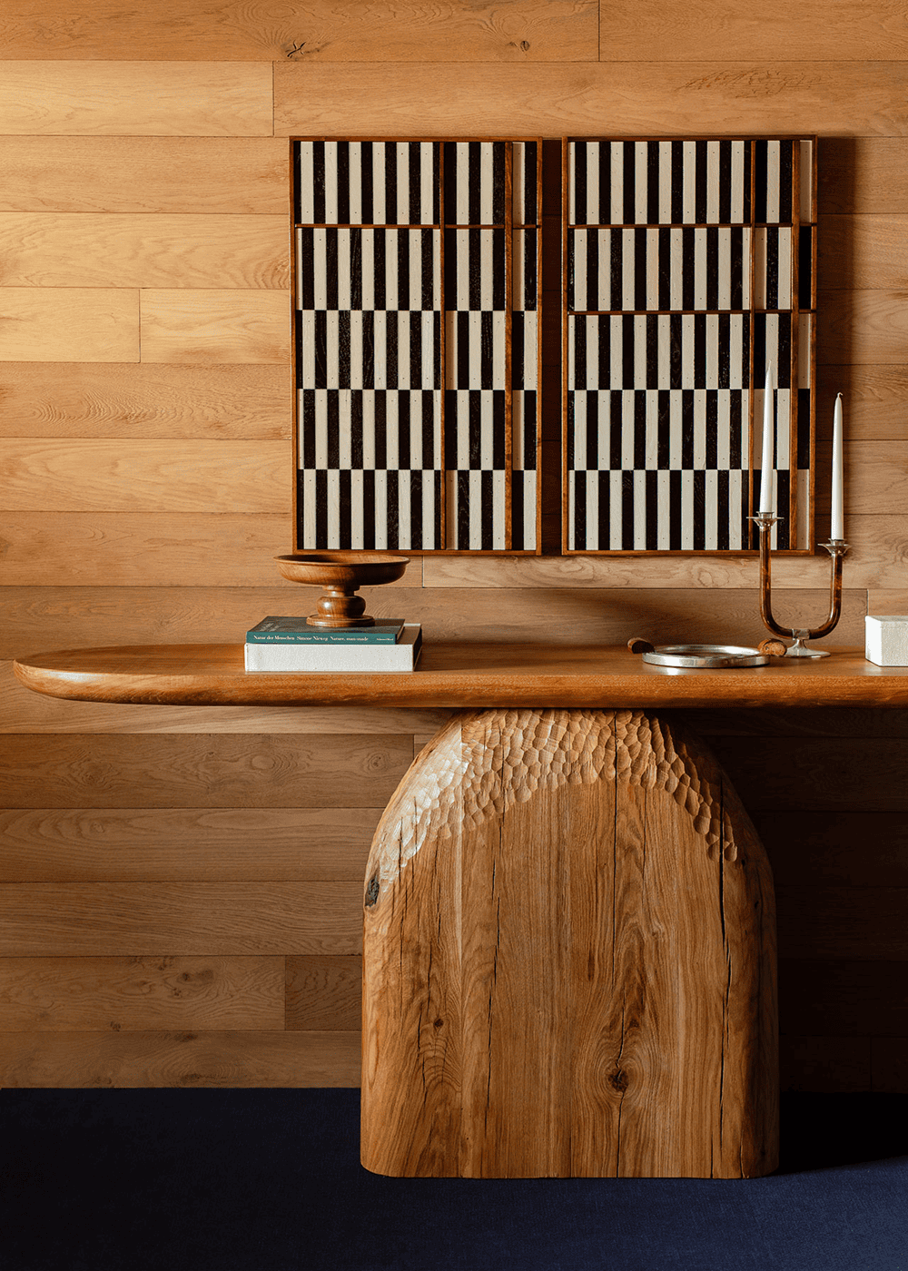 同样不拘一格的还有设计团队精心挑选的艺术品、装饰品和家具,其中许多物件都是为该空间定制的,如入口前厅的实心橡木控制台,是由Ateljé Loupchat的瑞典设计师Patrick Kim-Gustafson手工雕刻的。