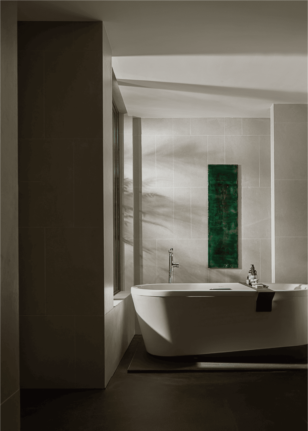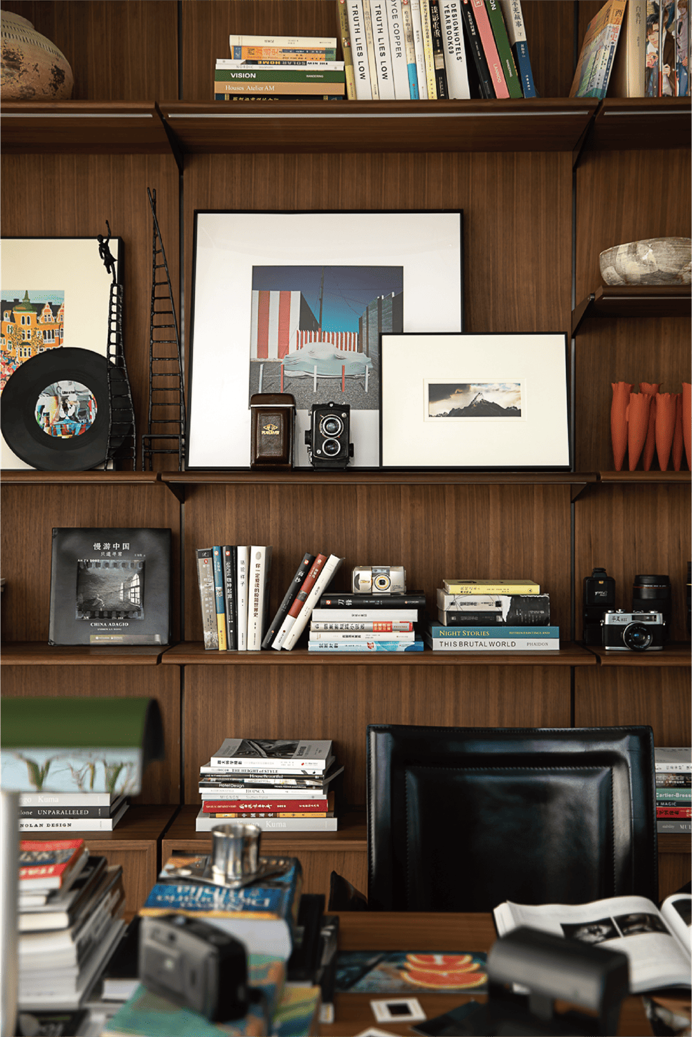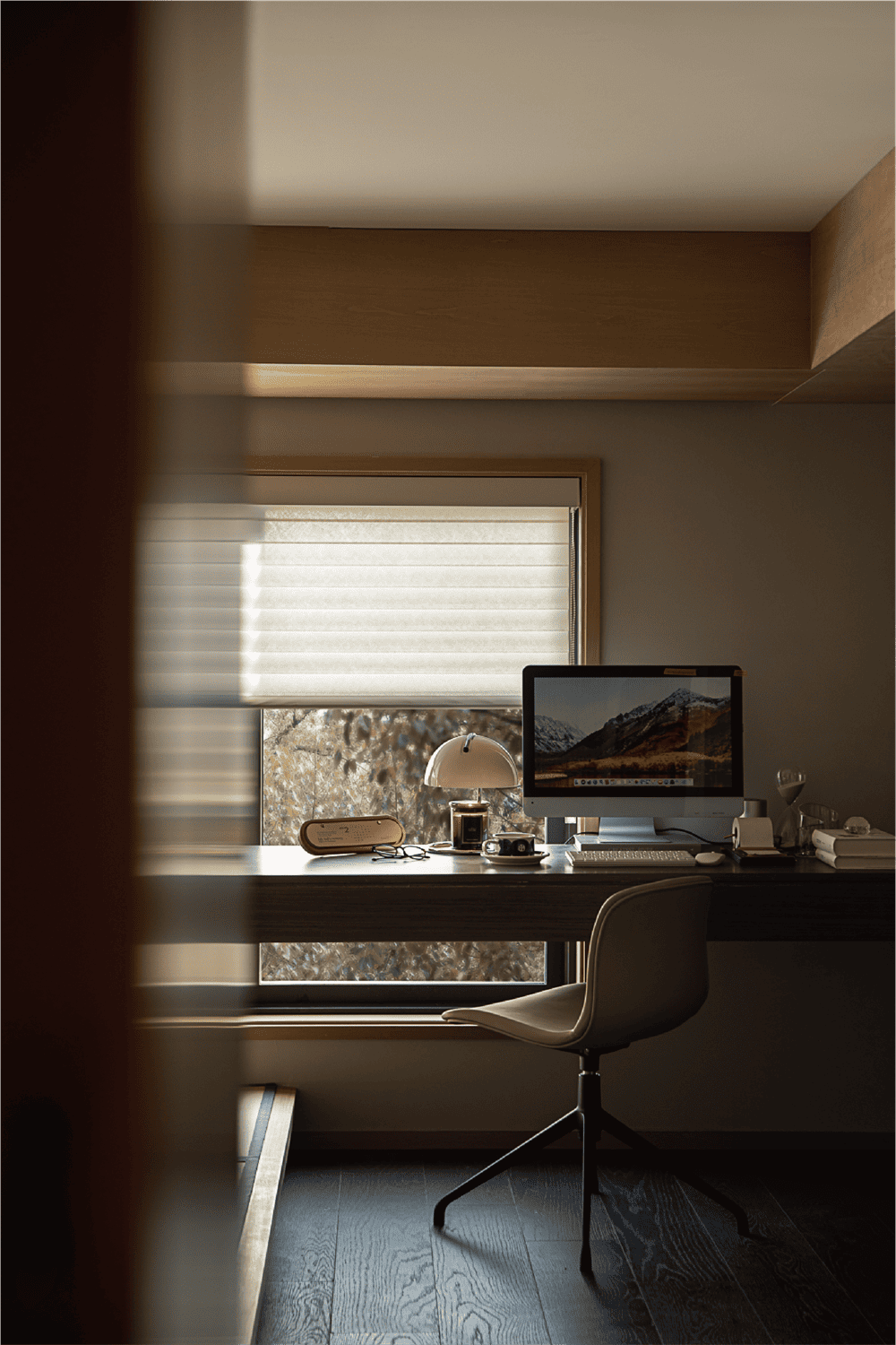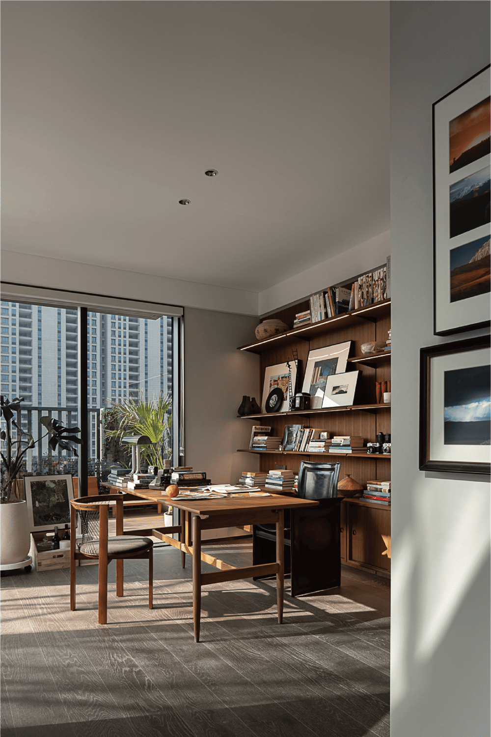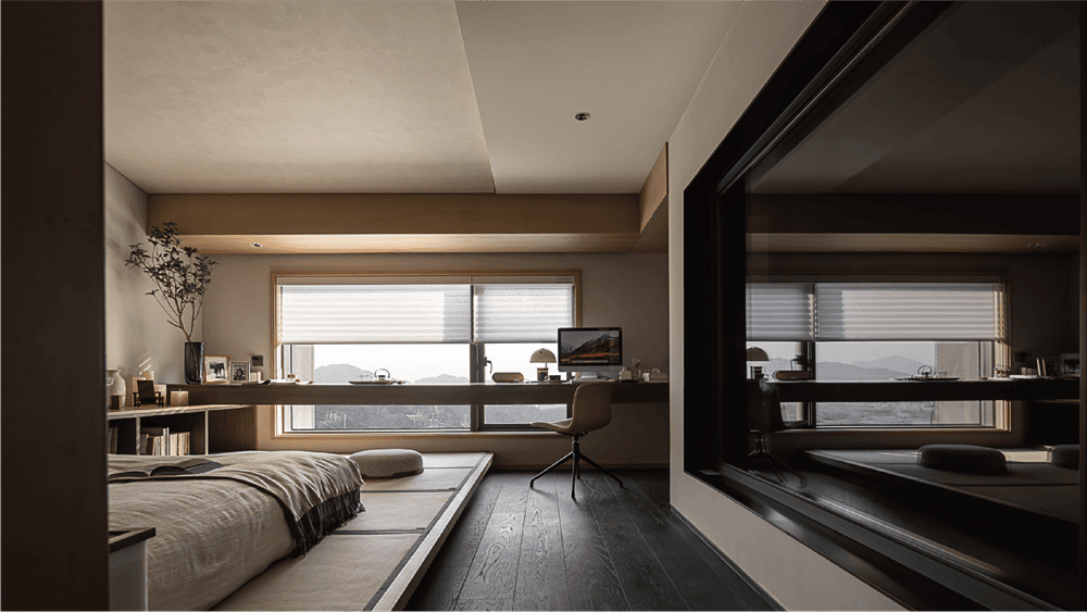 南向的书房由两面90°落地玻璃与墙面围合,不论或坐或立,或静观或创作,通透的视野与采光都能为使用者带去源源不断的灵感与思绪。