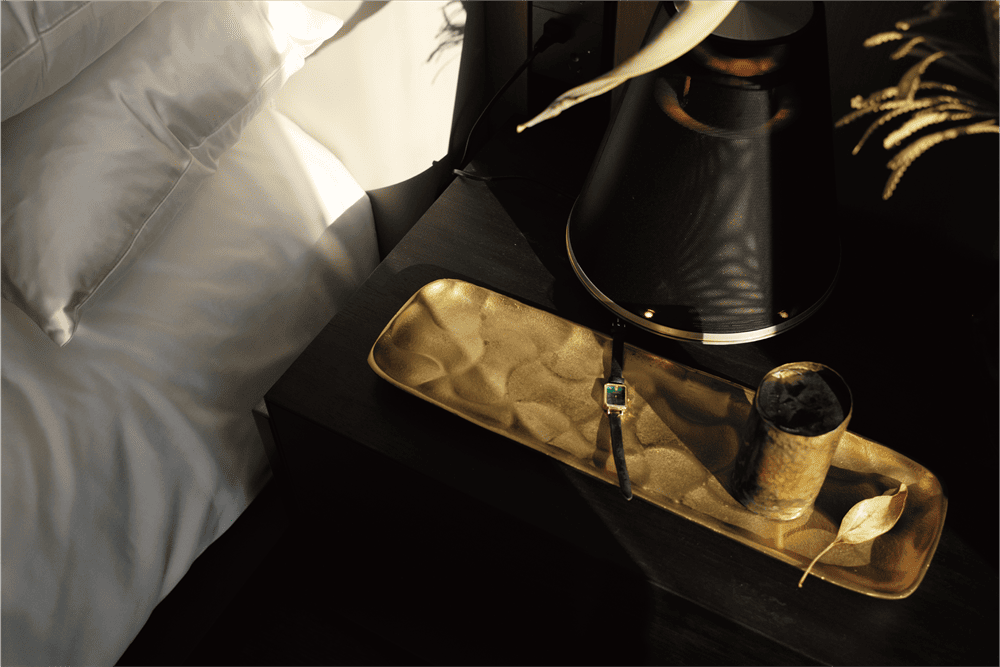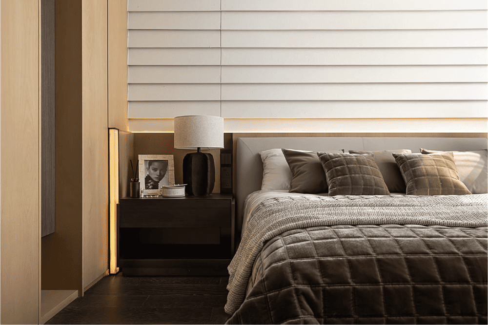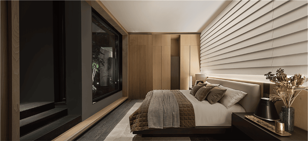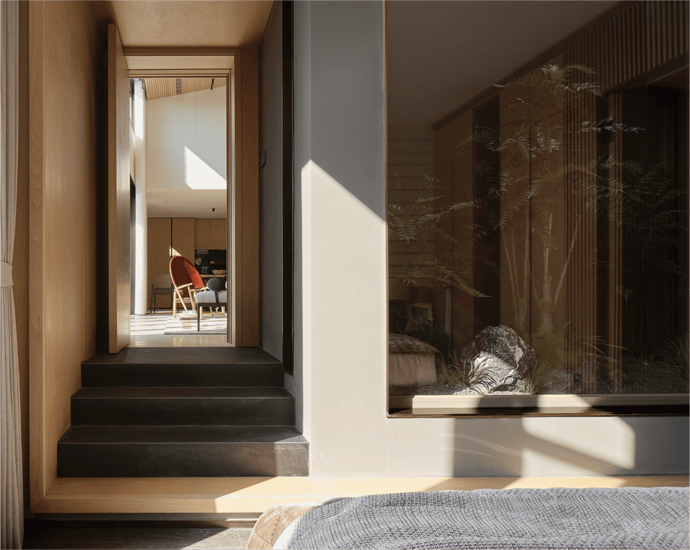 Stepping into the sunken master bedroom, the gentle breeze lifts the curtains, just level with the courtyard view. Continuing the design concept of the living room, the TV background wall of the master bedroom is replaced by the vibrant inner courtyard. Waiting for a beam of appropriate light to spill from the treetops, privacy, breathability and natural force coexist, creating a comfortable and natural back to the simple happy living island.