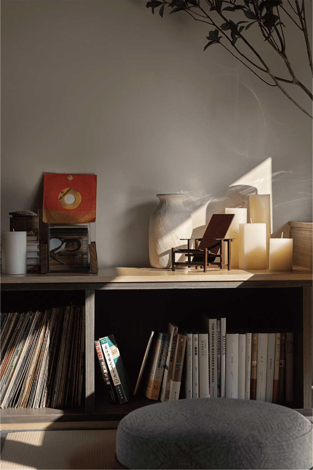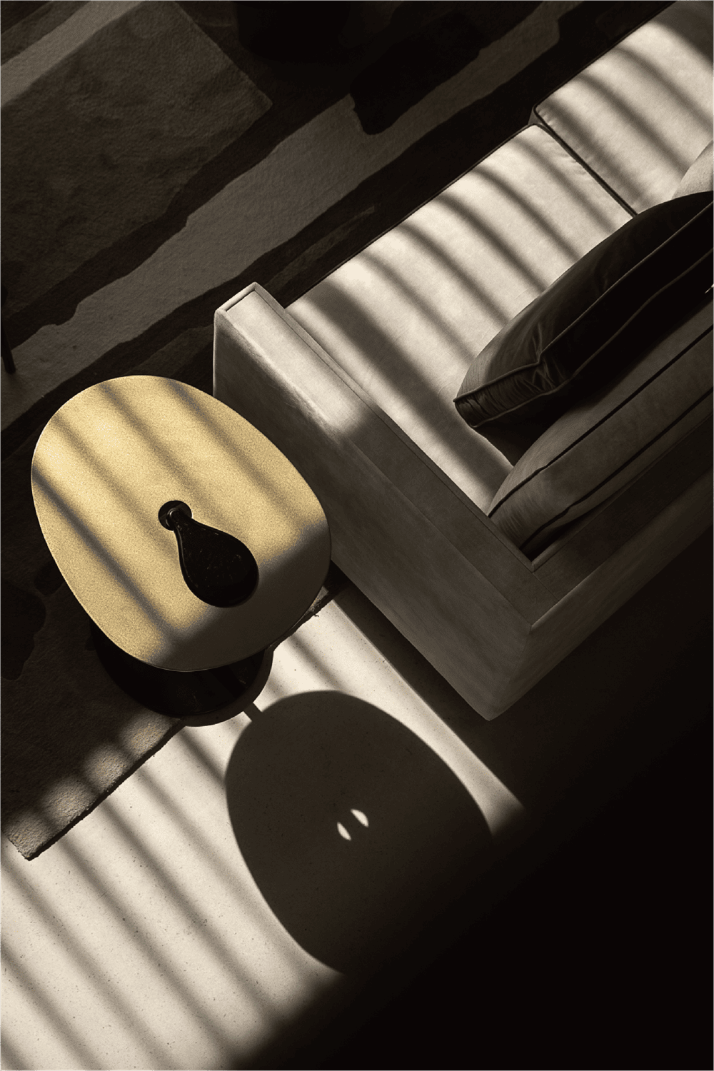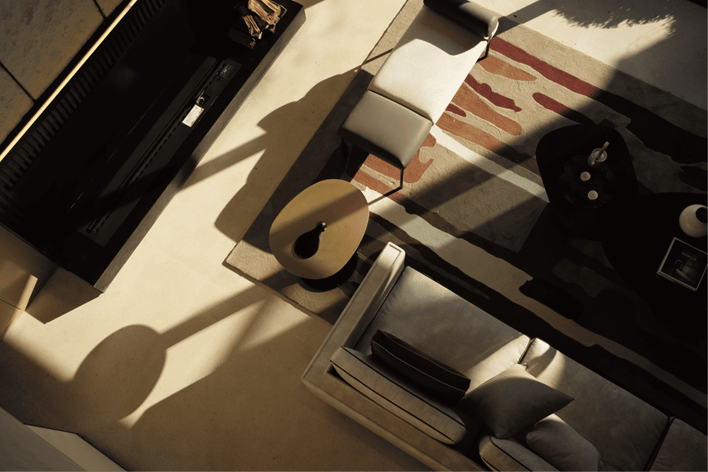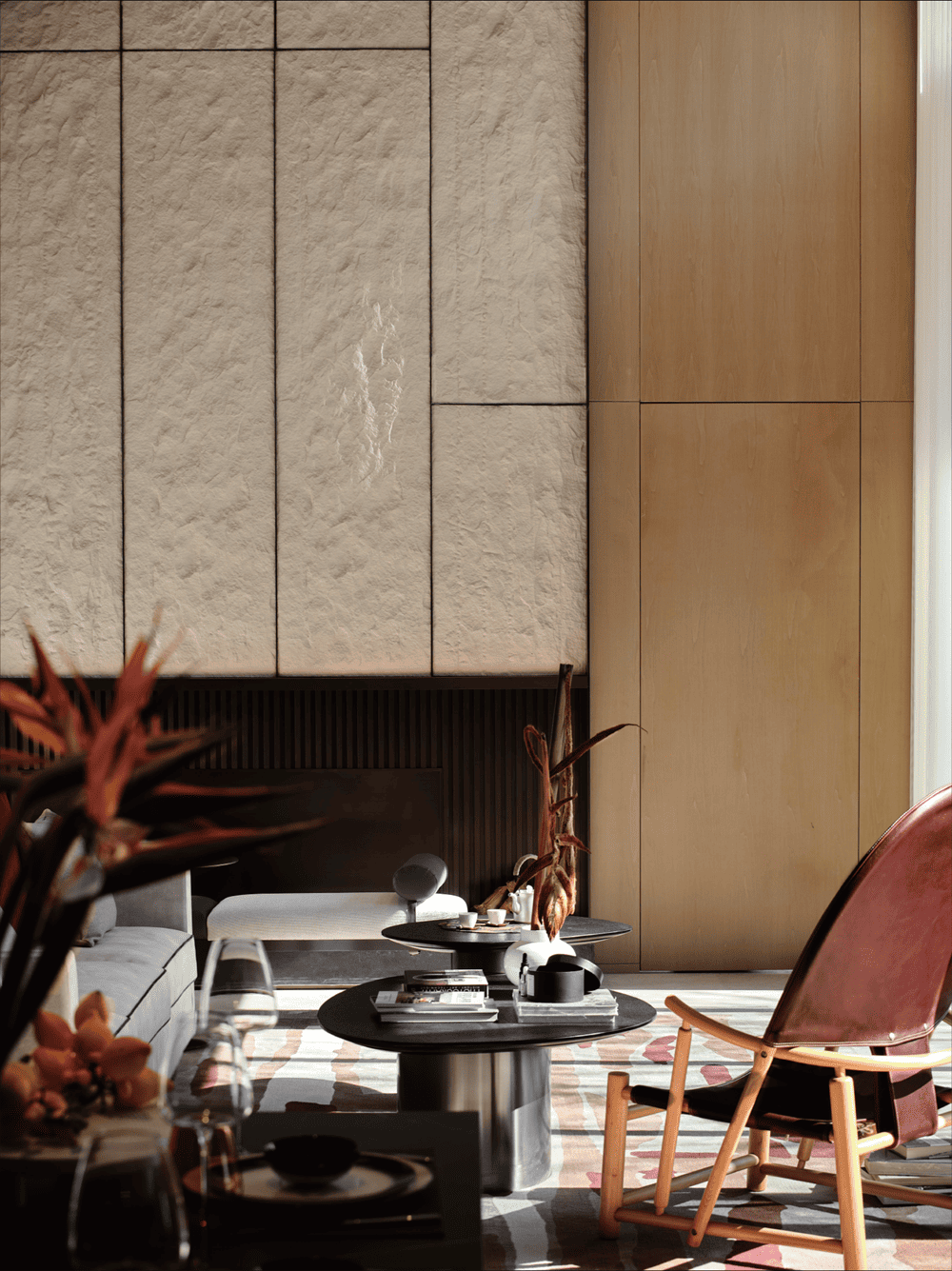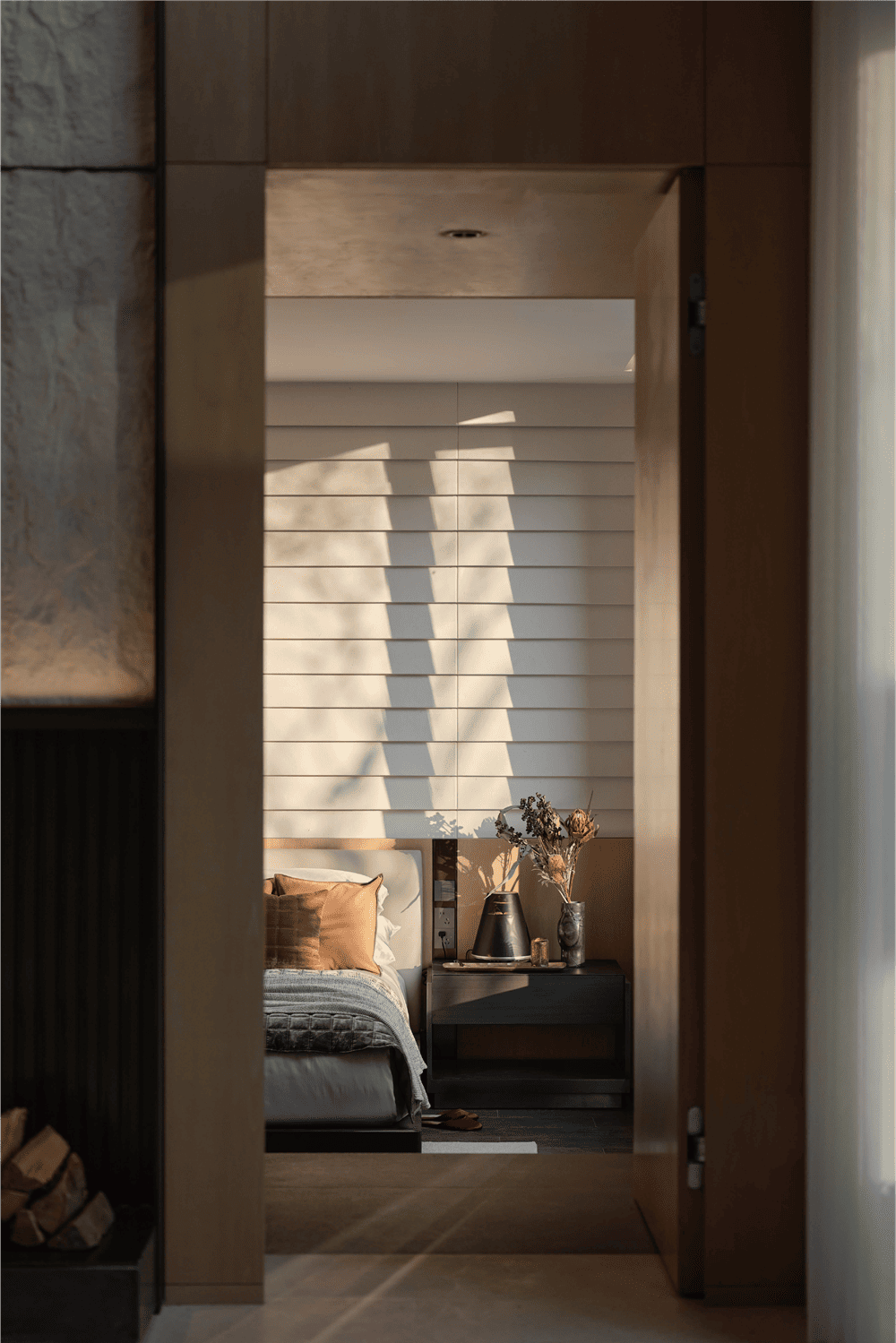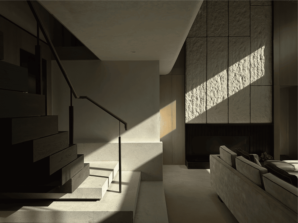 当光影落壁炉上方的主背景墙面,时间也随之印刻。石塑石墙面与和纸灯具,坚硬粗粒与柔软温和的材料被注入的光线串联,共同营造这一隅闲适自在之所。