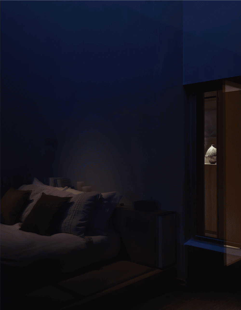 步入下沉式主卧,柔和的微风扬起窗纱,使视线正好平于庭院景观。延续会客厅的设计理念,主卧的电视背景墙被充满生机的内庭院取代。等待一束恰到好处的光线从树梢洒下,私密性、透气感与自然力共存,营造出一个舒适自然、返璞归真的生活岛屿。