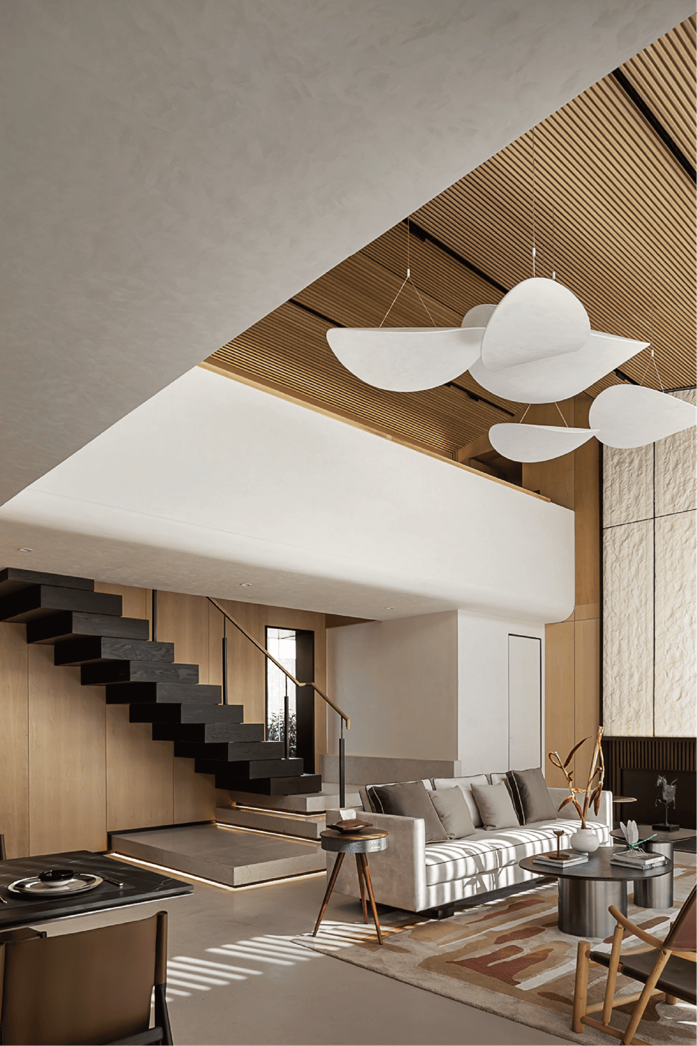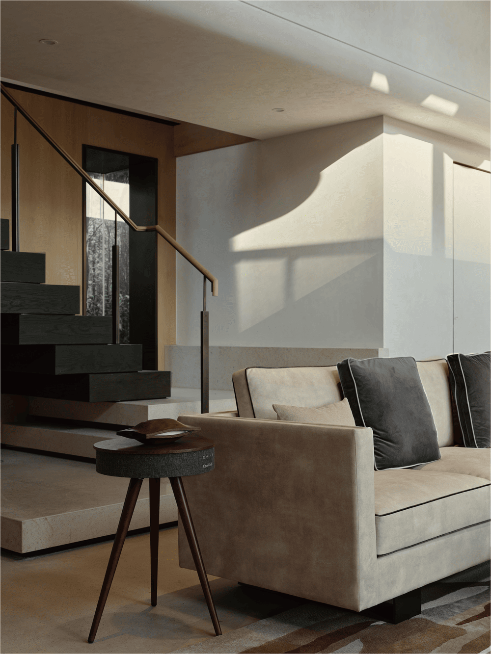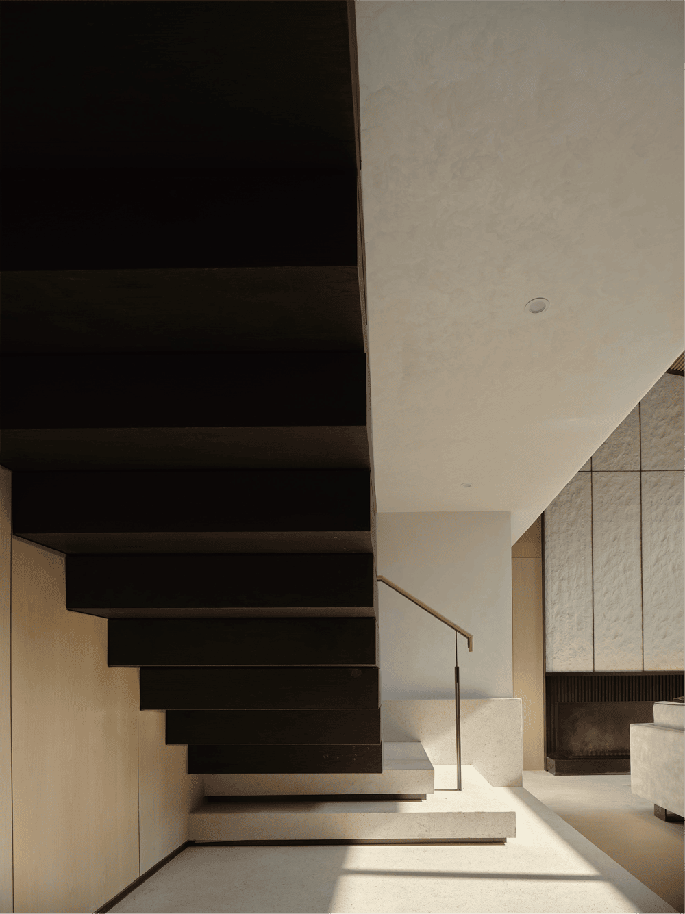 会客厅后的楼梯向上延展,由温润的大理石踏面转为质朴的木饰面,行进之间叠级变化。