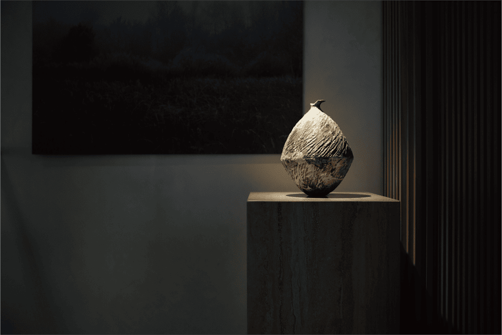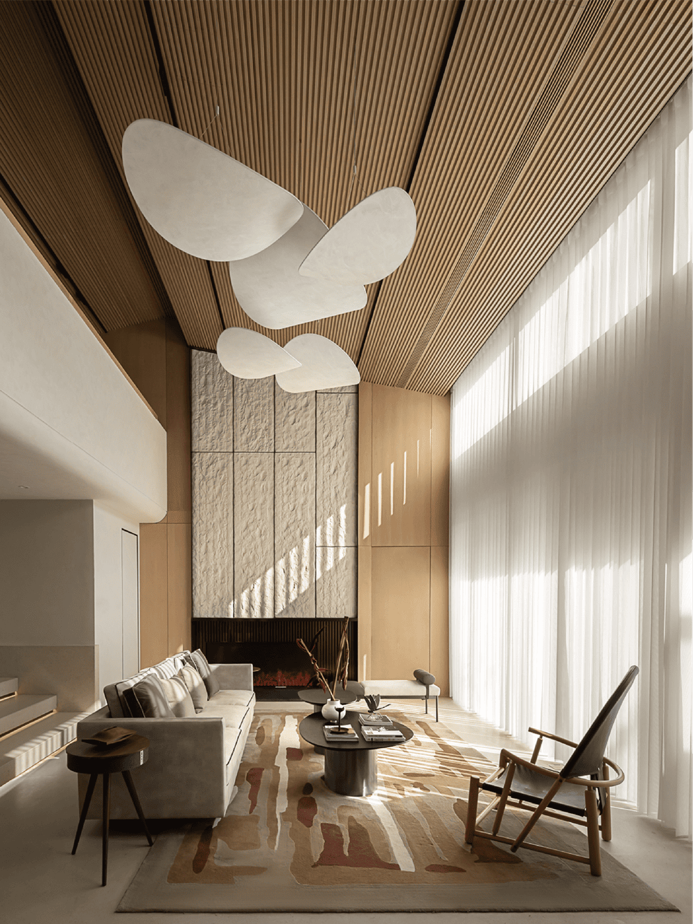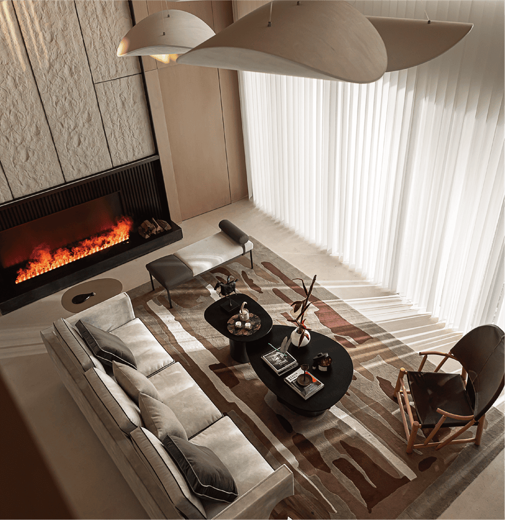When the light falls on the main background wall above the fireplace, time is also imprinted. The stone sculpture wall and rice paper lamp, the hard and coarse grain and the soft and gentle materials are connected by the injected light, together creating a leisurely and comfortable place.