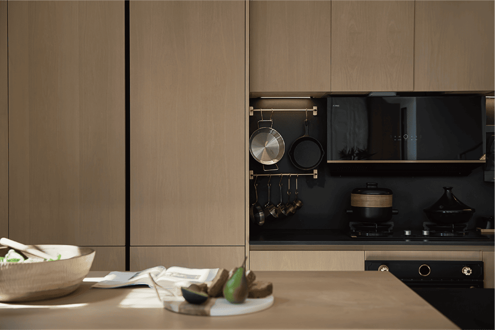 餐客厨一体的设计,使厨房不再是单一独立的封闭空间,而是结合岛台、餐桌,拓展成为交流分享、会客宴请的社交场地,使空间拥有更多复合性与可能性。