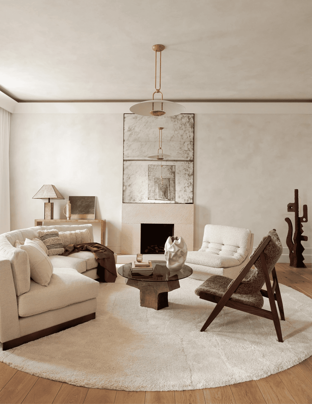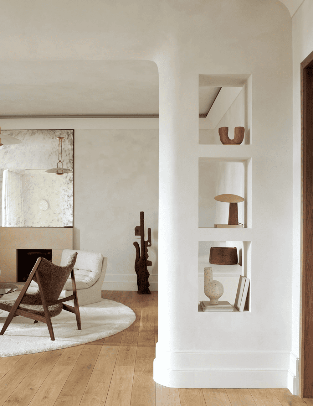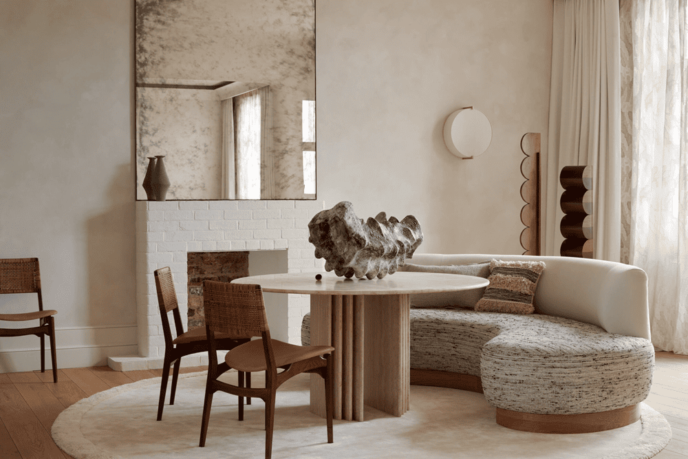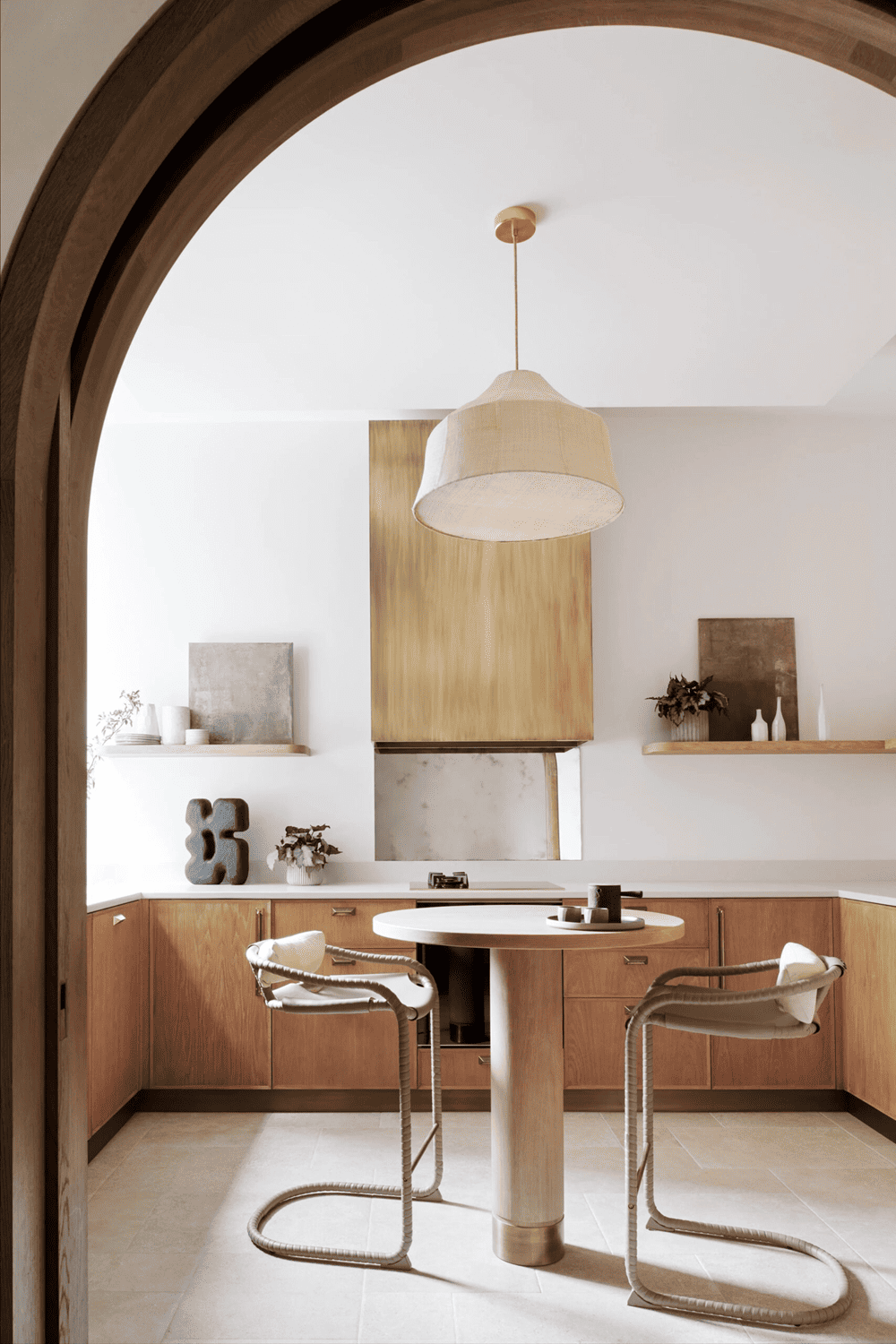 The dining room features a striking accent from Vessel Gallery -- a painted brick fireplace and a vintage 1970s Italian travertine table. The adjoining kitchen is connected by double arches, with wood cabinets and brass accents maintaining a relaxed atmosphere. A curved wall between the kitchen and living room houses integrated shelving, while soft lighting creates a dynamic room “divider” in the space.