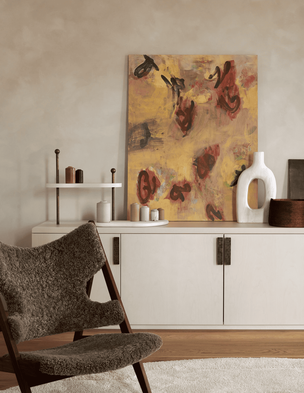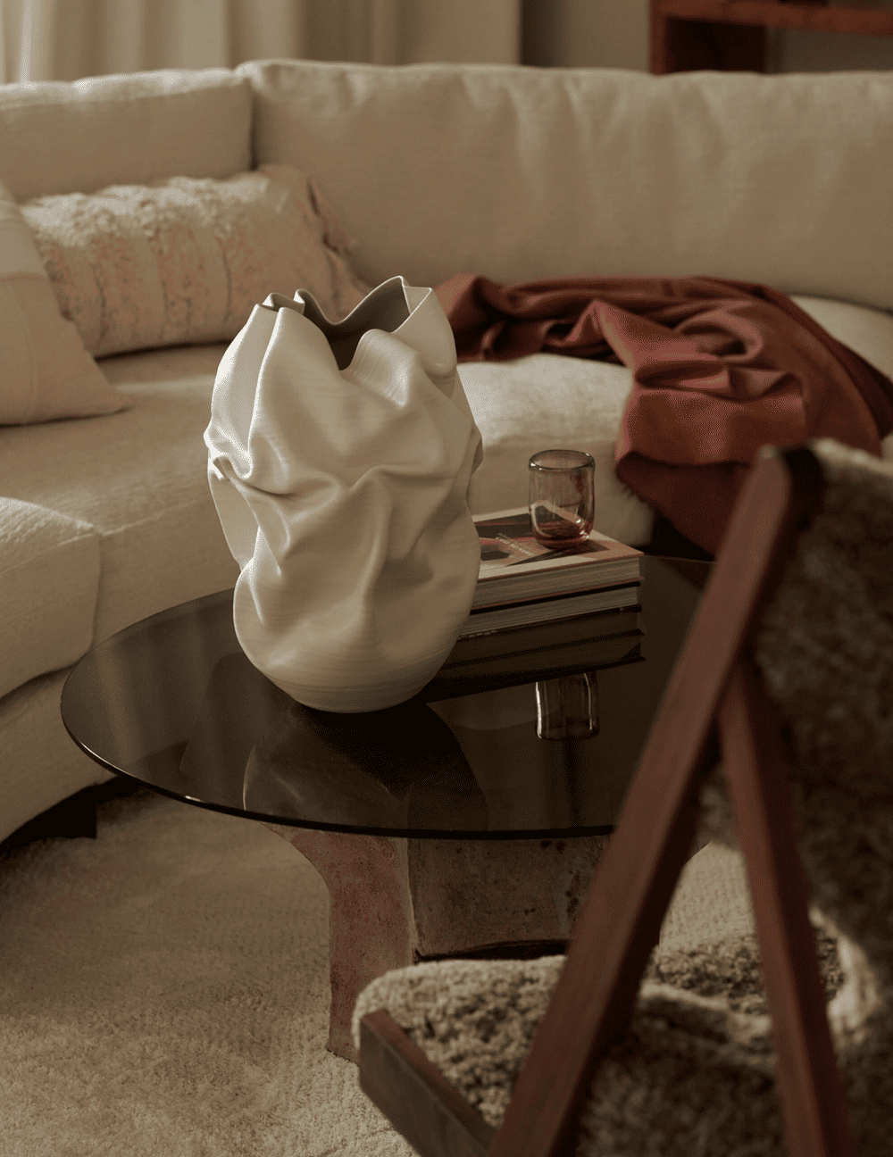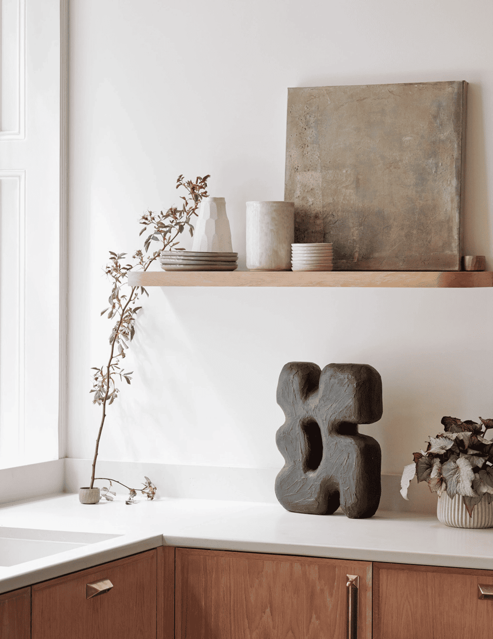 The dining room features a striking accent from Vessel Gallery -- a painted brick fireplace and a vintage 1970s Italian travertine table. The adjoining kitchen is connected by double arches, with wood cabinets and brass accents maintaining a relaxed atmosphere. A curved wall between the kitchen and living room houses integrated shelving, while soft lighting creates a dynamic room “divider” in the space.