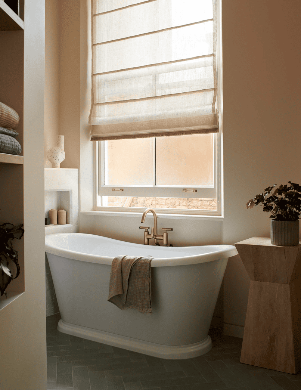 设计融入了可以让人联想到夕阳的柔和色彩、对比强烈的石头纹理和大地色调的织物,以此为空间创造出一种和谐的氛围。