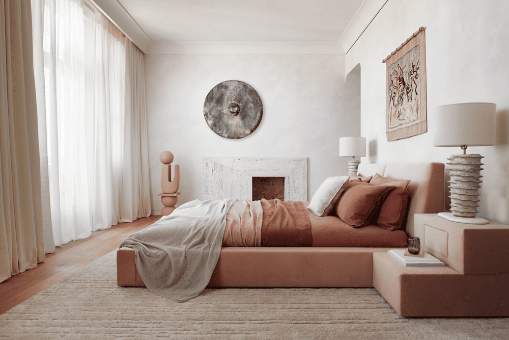 The master bedroom has a custom 1960s-style pink velvet bed with Larusi and Society Limonta linens. Tapestries from Schmid McDonagh Gallery adorn the walls above the bed, while an earthy stone fireplace and a custom mirror by Christophe Gaignon add to the room's natural beauty. And in the adjacent powder room, which also features a pink Kast concrete washbasin and vintage mirror from Lillie Road, London. The open dressing area is illuminated by a fabric chandelier from PINCH and “hovers” above a custom leather and plywood island. The master suite opens to a Moroccan-inspired bathroom with a custom travertine sink, Watermark faucet and zellige Moroccan tile in the shower.