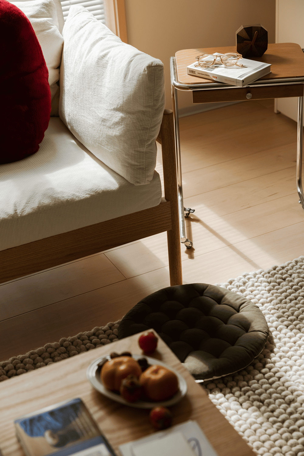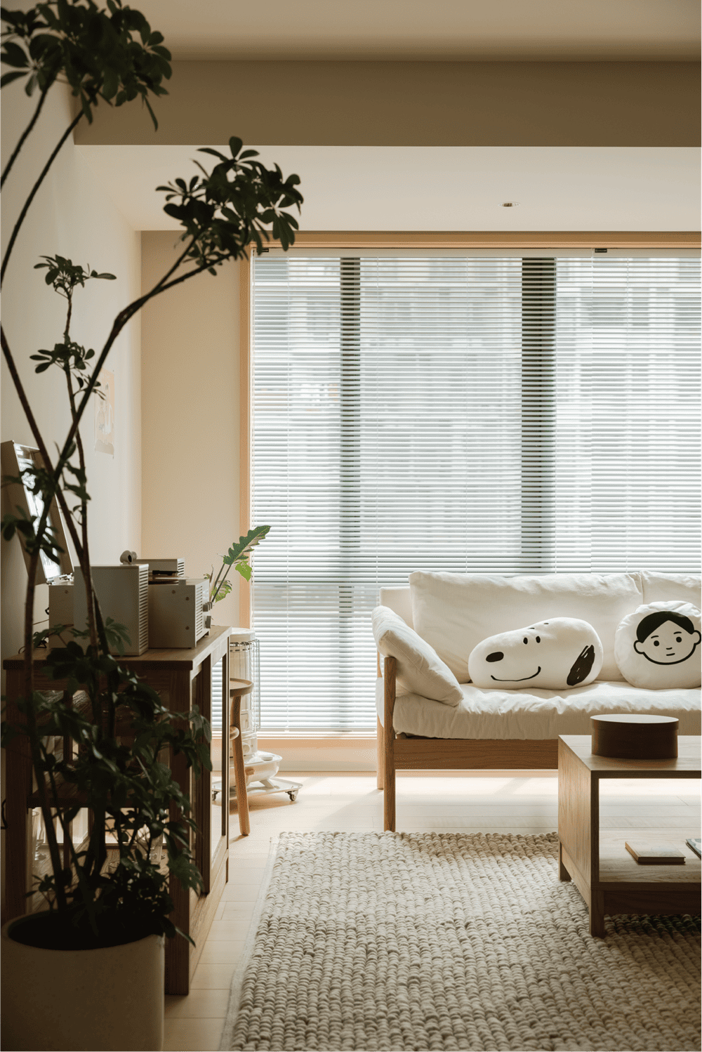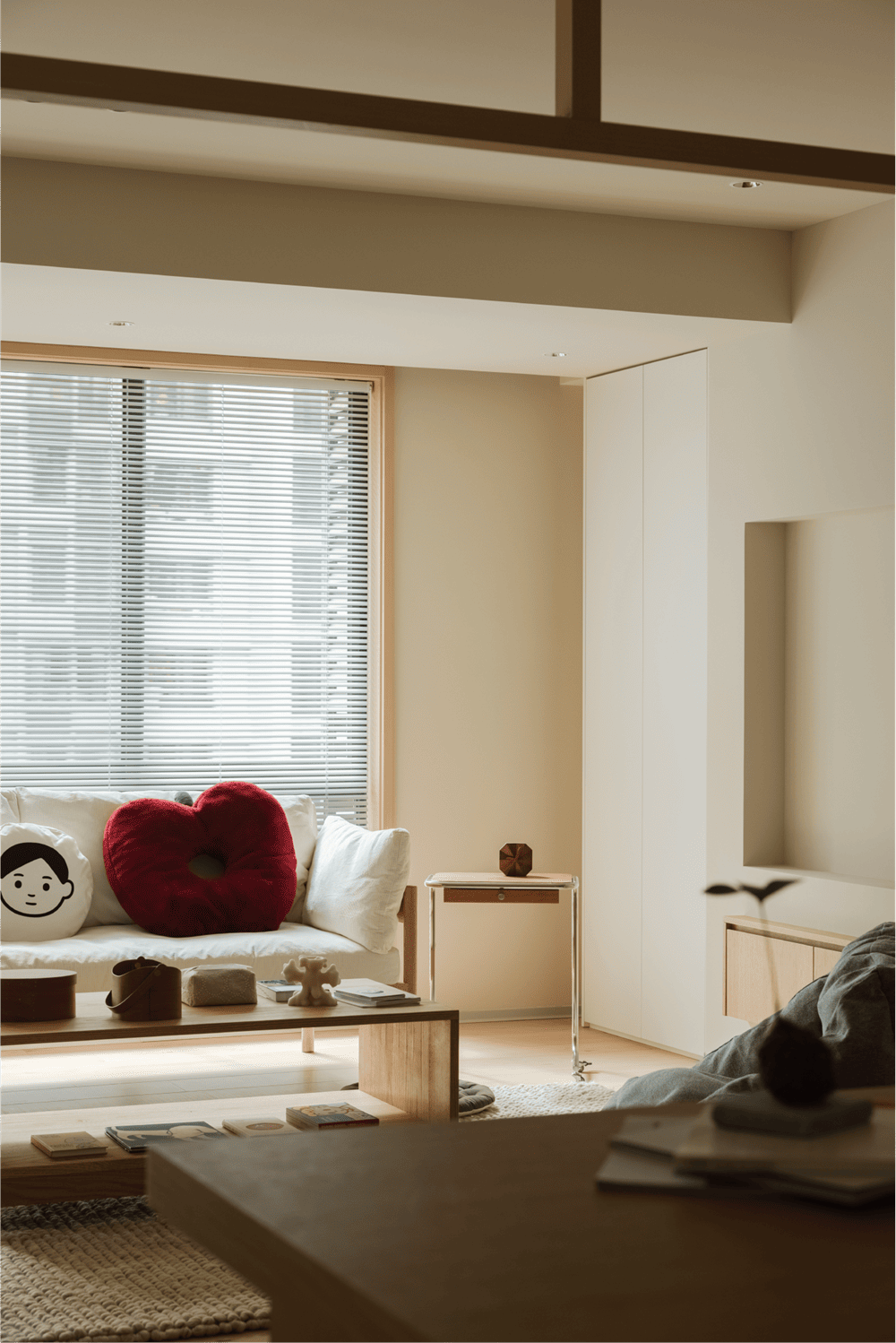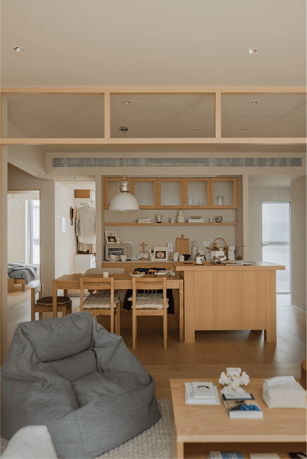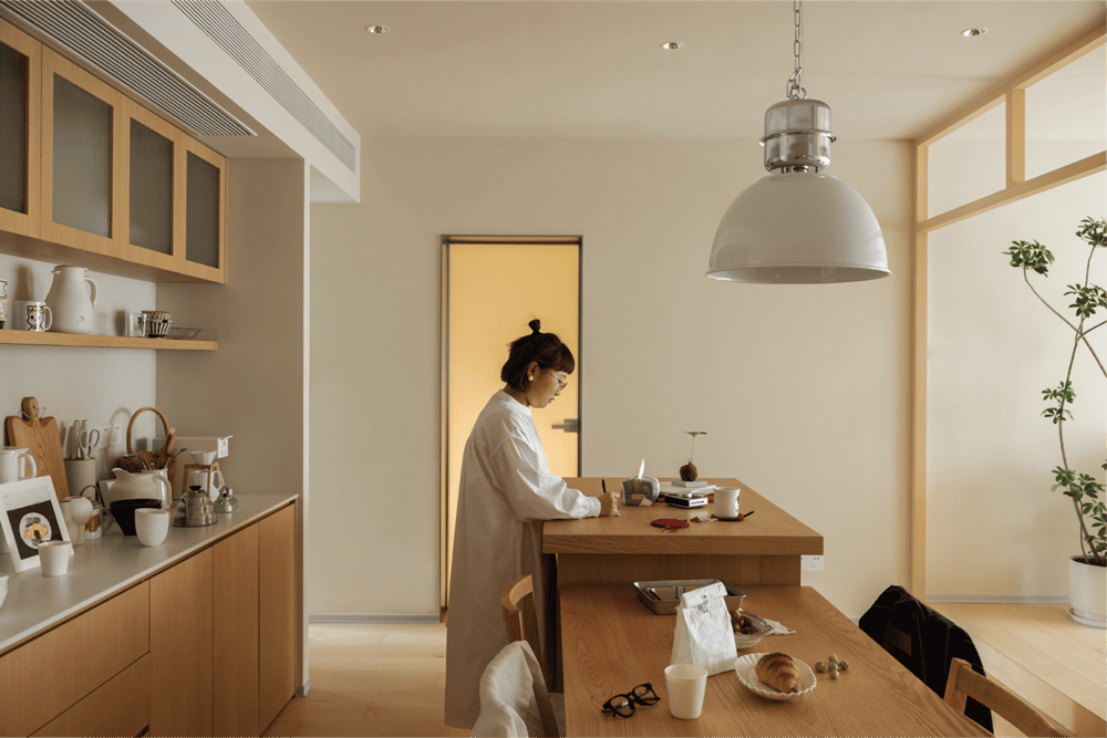 走进这个空间,你不仅置身于静谧的阳光中,还能与主人进行无声的交流,彰显出主人宽容、从容的生活态度。"这是我们为主人周日设计的冬日暖房。米色的墙壁与原木色的加拿大枫木地板相呼应,营造出柔和温暖的氛围。推门而入的那一刻,你可以摆脱所有的疲惫和烦恼。开放式的水吧和客厅整齐地摆放着主人喜欢的各种可爱物品,精致而小巧,就像主人自己一样充满朝气和活力,让身处其中的每一个人都倍感温暖。