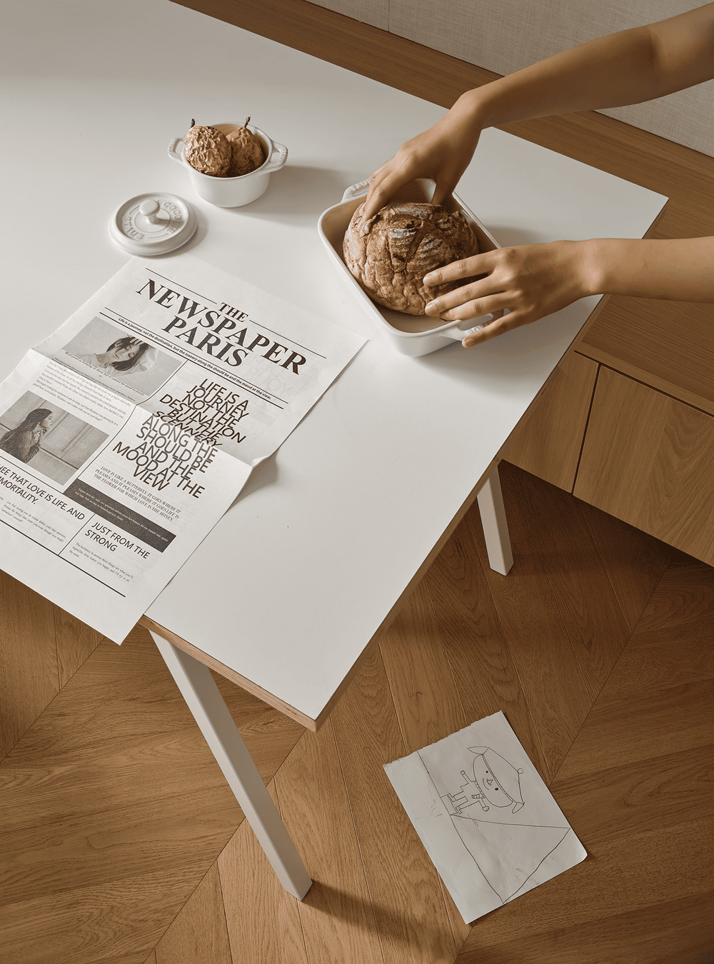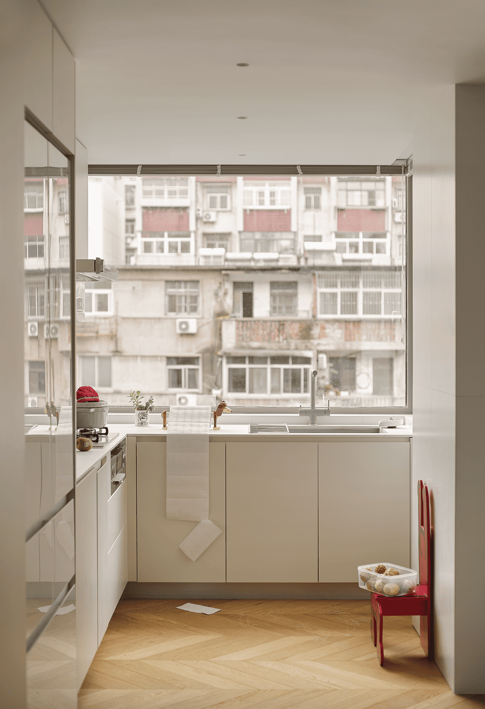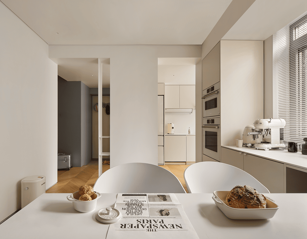 坐在餐桌前,开口处将室内风景化成两幅形态各异的画卷,以目光所及,渡生活的柔波。