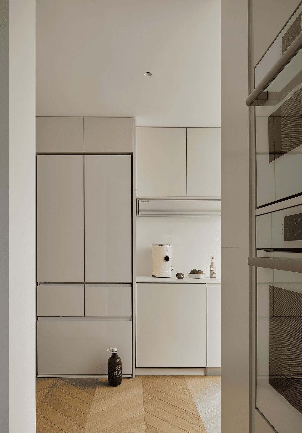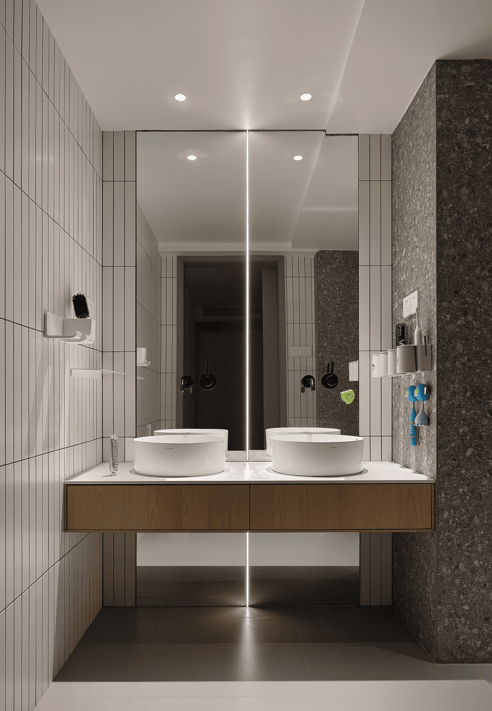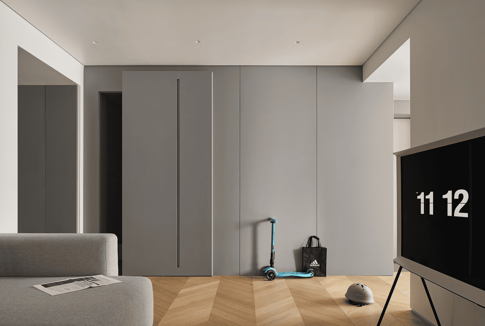 门后是时光停滞的一隅清幽,低饱和色的入口,以极低的姿态存在于空间中,将收纳藏于镜面后,多孩家庭的实用性从入户开始。