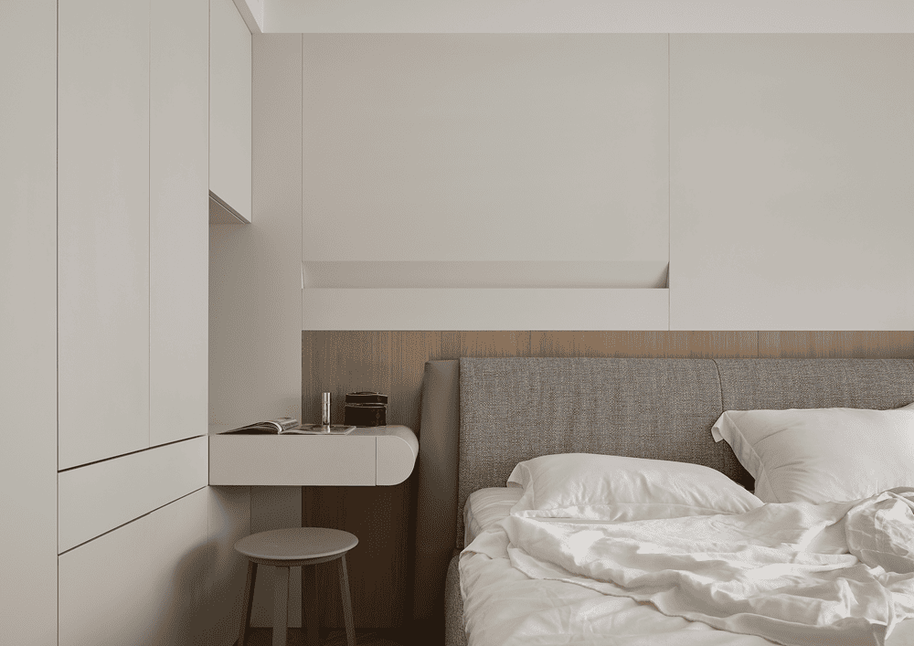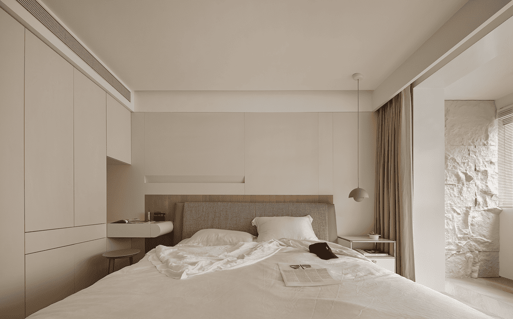 The wooden headboard echoes the outer space and is no longer a separate island in the field. The light is hidden in the grooves, and a soft mist fills the space, providing guidance for the light.